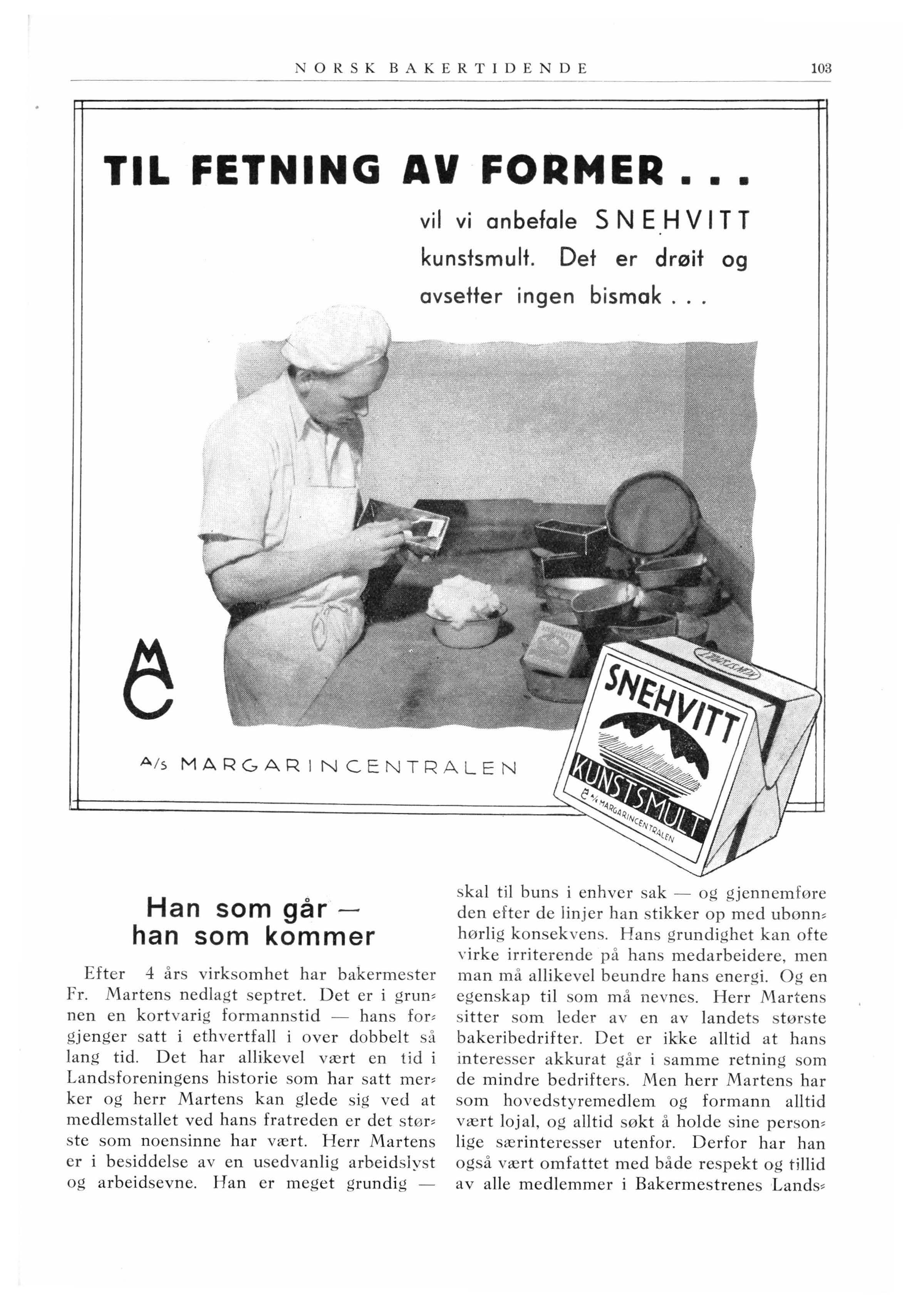 ska l til bun s i enhver sak - og g jenn emføre d e n efter d e linjer han s tikker op m ed ubonn , h ø rli g k o n se k ve n s Hans g rundi ghet kan of t e virke irriter ende på han s med a rbeid ere, men man må allikevel beundre han s e ner gi. Og en ege n s kap til so m må nevnes. Herr Martens s itter so m l e d er av en av land e t s s tør s te bakeribedrifter. Det er ikke alltid at han s inter esse r akkurat gå r i sa mme retning som de mindre bedrift e r s. Men herr Marten s har so m hovedst y remedlem og formann alltid vært lojal, o g allt id søkt å holde sine per so n , li g e sær int eresser utenfor. Derfor har han også væ rt omfattet med b å de re s pekt og tillid av alle medlemmer i Bakermestrenes Lands ,
