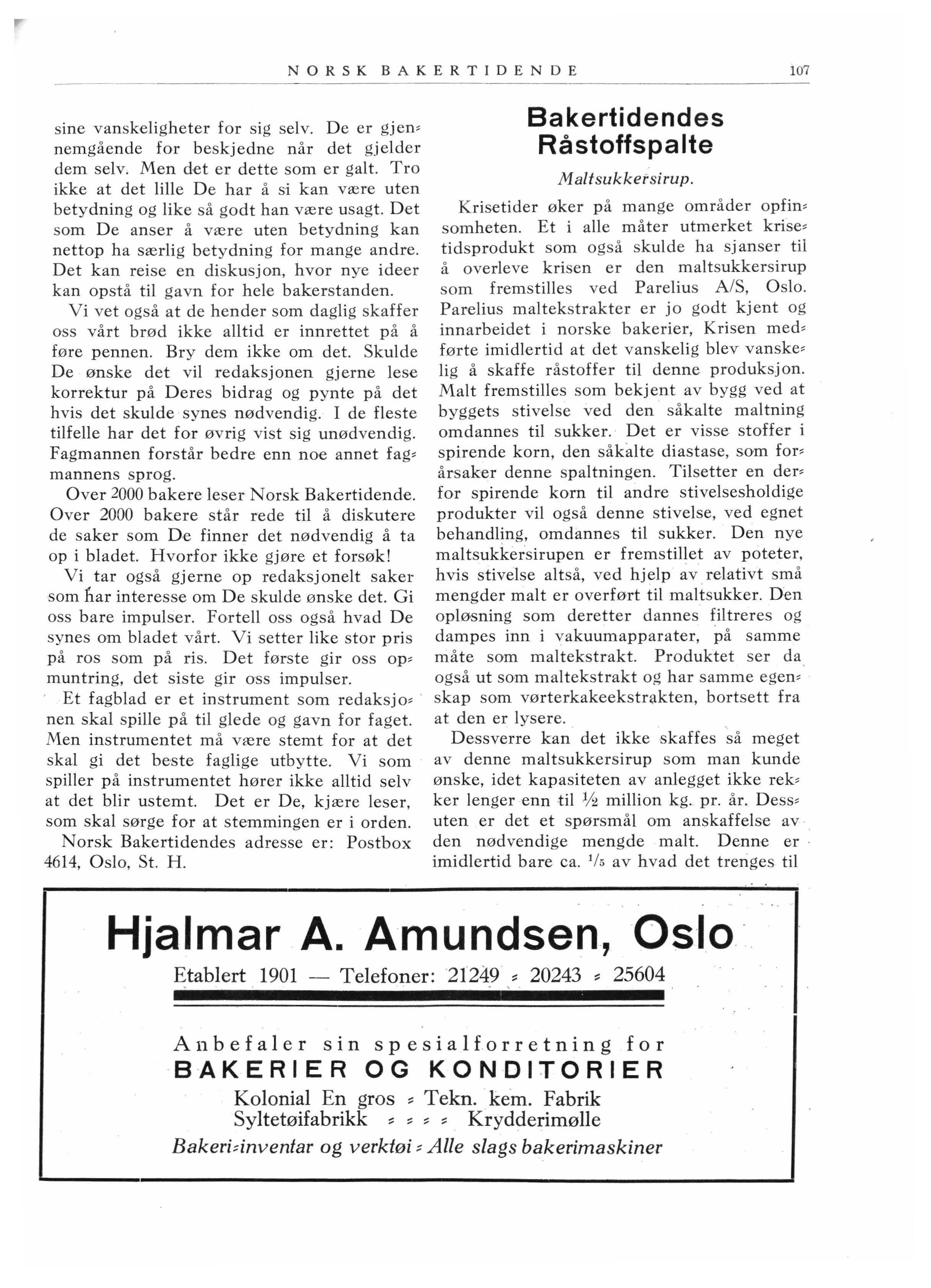 Krisetider øker på mange områder opfin , somheten. Et i alle måter utmerket krise• tidsprodukt som også skul de ha sjanser til å overleve krisen er den maltsukkersirup som fremstilles ved Parelius A / S, Oslo. Parelius maltekstrakter er jo godt kjent og innarbeidet i norske bakerier, Krisen med• førte imidlertid at det vanskelig blev vanske: lig å skaffe råstoffer til denne produksjon. Malt fremstilles som bekjent av bygg ved at byggets stivelse ved den · såkalte maltning omdannes til sukker. · Det er visse stoffer i spirende korn, den såkalte diastase, som for, årsaker denne spaltningen. Tilsetter en der• for spirende korn til andre stivelsesholdige produkter vil også denne stivelse, ved egnet behandling, omdannes til sukker. Den nye maltsukkersirupen er fremstillet av poteter, hvis stivelse altså, ved hjelp avrelativt små mengder malt er overført til maltsukker. Den opløsning som deretter dannes filtreres og dampes inn i vakuumapparater, på samme måte som maltekstrakt. Produktet ser da også ut som maltekstrakt og har samme egen• skap som vørterkakeekstrakten, bortsett fra at den er lysere . Dessverre kan det ikke skaffes ·så meget av denne maltsukkersirup som man kunde ønske, idet kapasiteten av anlegget ikke rek: ker lenger enn -til ½ million kg. pr . år. Dess: uten er det et spørsmål om anskaffelse av den nødvendige mengde malt. Denne er imidlertid bare ca. 1 /5 av hvad det trenges til