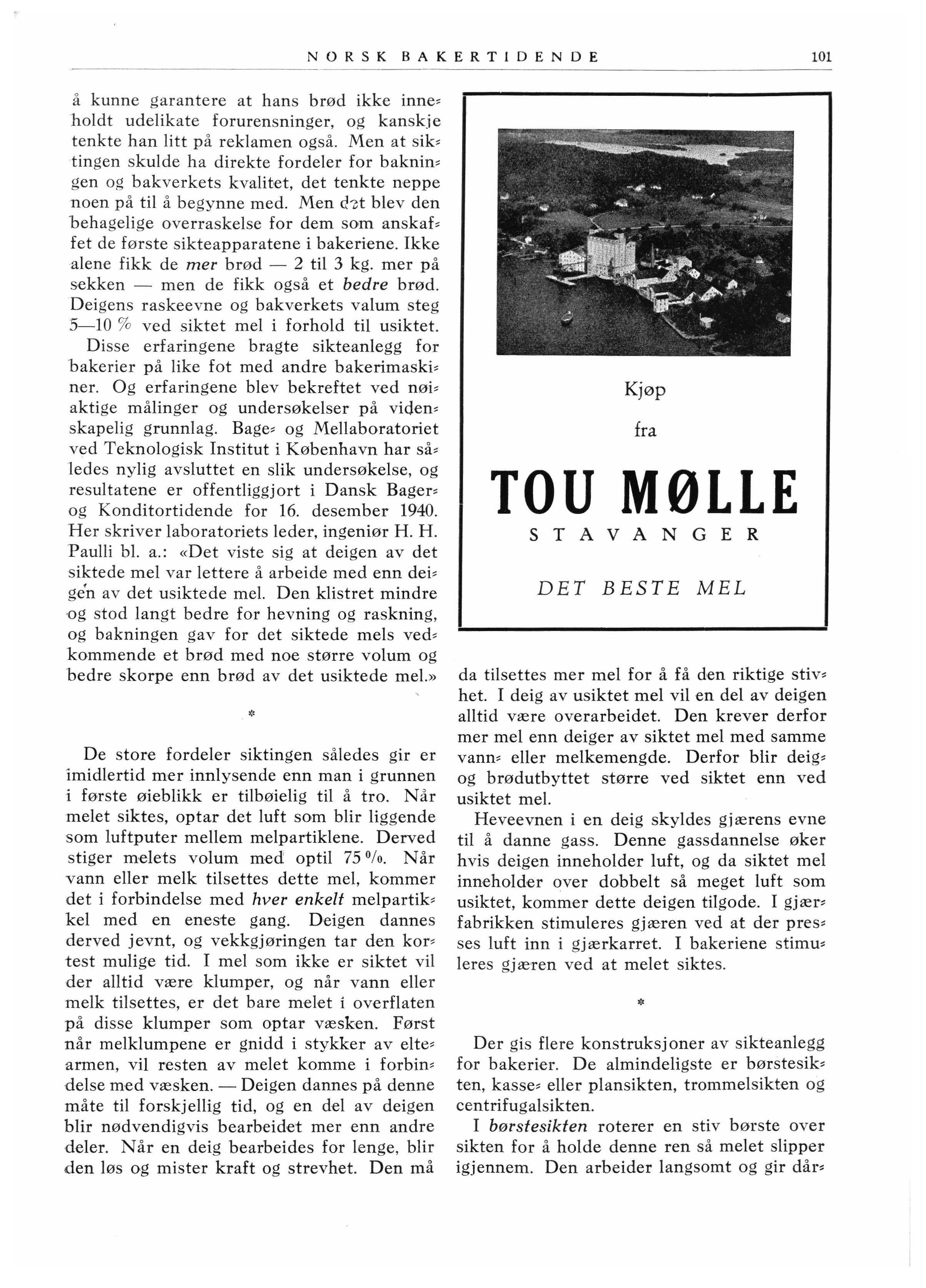 å kunne garantere at hans brød ikke inne• holdt udelikate forurensninger, og kanskje tenkte han litt på reklamen også. Men at sik< tingen skulde ha direkte fordeler for baknin: gen og bakverkets kvalitet, det tenkte neppe noen på til å begynne med. Men d'2t blev den behagelige overraskelse for dem som anskaf• fet de første sikteapparatene i bakeriene. Ikke alene fikk de mer brød - 2 til 3 kg. mer på sekken - men de fikk også et bedre brød. Deigens raskeevne og bakverkets valum steg 5-10 % ved siktet mel i forhold til usiktet. Disse erfaringene bragte sikteanlegg for bakerier på like fot med andre bakerimaski• ner Og erfaringene blev bekreftet ved nøi: aktige målinger og undersøkelser på viden• skapelig grunnlag. Bage: og Mellaboratoriet ved Teknologisk Institut i København har så: ledes nylig avsluttet en slik undersøkelse, og resultatene er offentliggjort i Dansk Bager• og Konditortidende for 16. desember 1940. Her skriver laboratoriets leder, ingeniør H. H Paulli bl. a.: «Det viste sig at deigen av det siktede mel var lettere å arbeide med enn dei: ge'n av det usiktede mel. Den klistret mindre og stod langt bedre for hevning og raskning, og bakningen gav for det siktede meis ved• kommende et brød med noe større volum og bedre skorpe enn brød av det usiktede mel.»