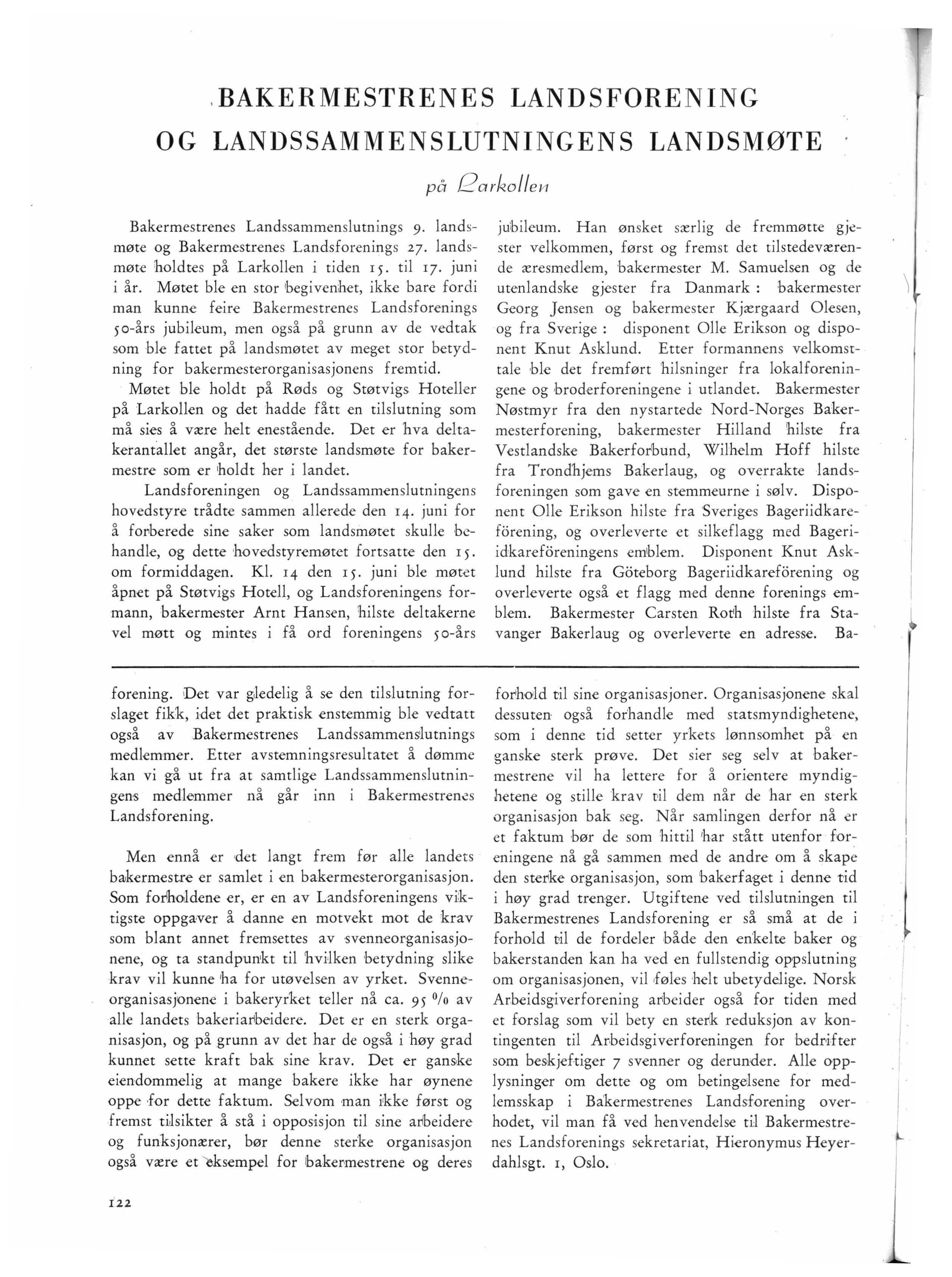 Bakermestrenes Landssammenslutnings 9. landsmøte og Bakermestrenes Landsforenings 27. land smøte hold tes på Larkollen i tiden r 5. til I 7. jun i i år. Møtet ble en stor begivenhet, ikke bare fordi man kunne feire Bakermestre nes Landsforenings 50-års jubileum, men også på grunn av de vedtak som ble fattet p å landsmøtet av meget stor betydning for bakermesterorganisasjonens fremtid.