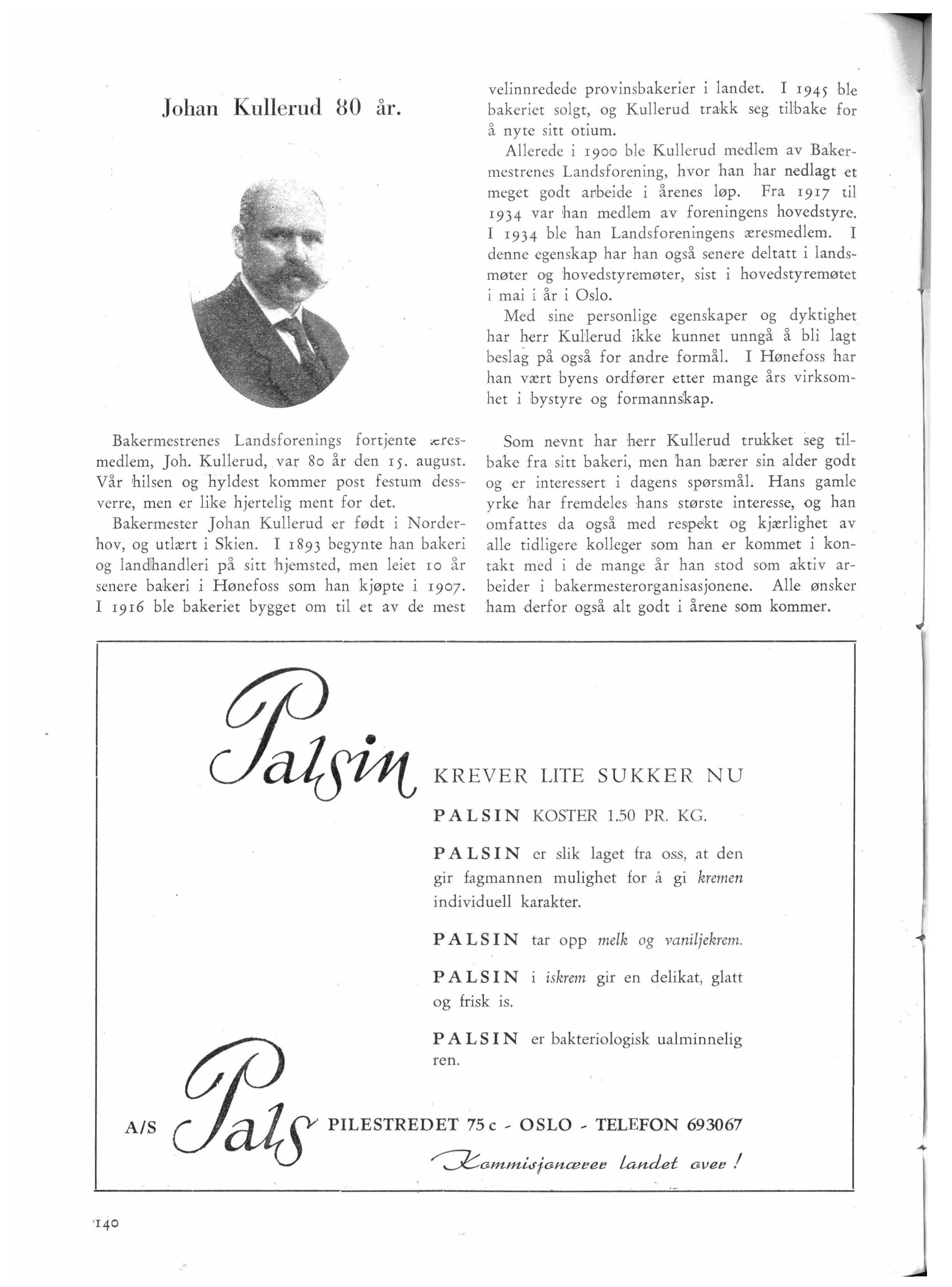 Bakermestrene s Land sfo renings fortjente .cresmedl em, Joh. Kullerud, var 80 år den r 5. august. Vår hilsen og hyldest kommer post festum dessverre, men er like hjertelig ment for det.