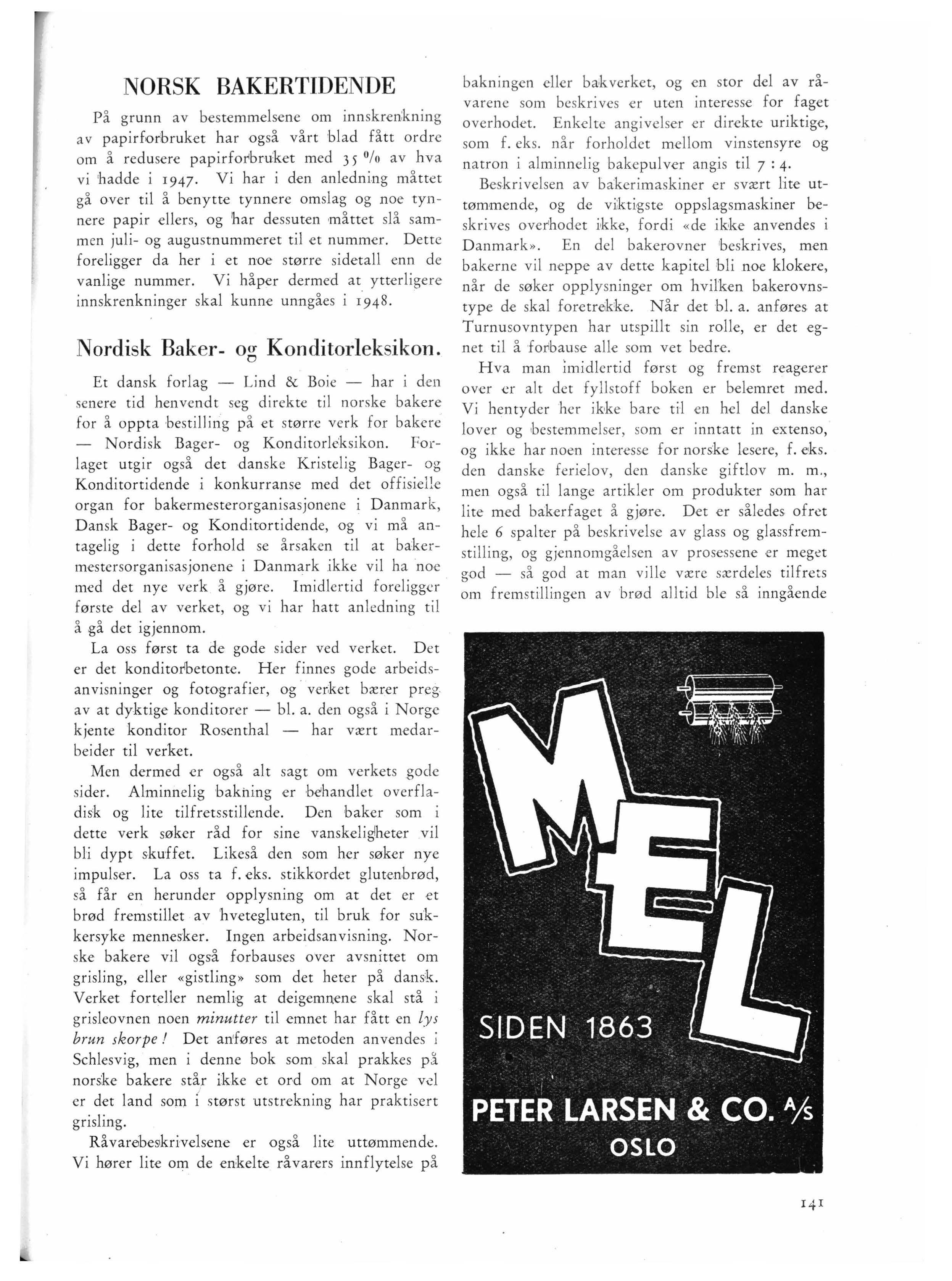 Et dansk forlag - Lind & Boie - har i den senere tid henvendt seg direkte til norske bakere for å oppta bestilling på et s tørre verk for bakere - Nordisk Bager- og Konditorleksikon. Forlaget utgir også det dan ske Kri stelig Bager - og Konditortidende i konkurran se med det offisielle organ for bakermesterorgan isasjonene i Danmar k, Dan sk Bager- og Kond ito rtidende, og vi må antao-elio- i dette forhold se årsaken til a t baker- o o mestersorganisasjonene i Danmark ikke vi l ha noe med det nye verk å gjøre. Imidl er tid fo reli gge r første del av verket, og vi har hatt anledning til å gå det igjennom.