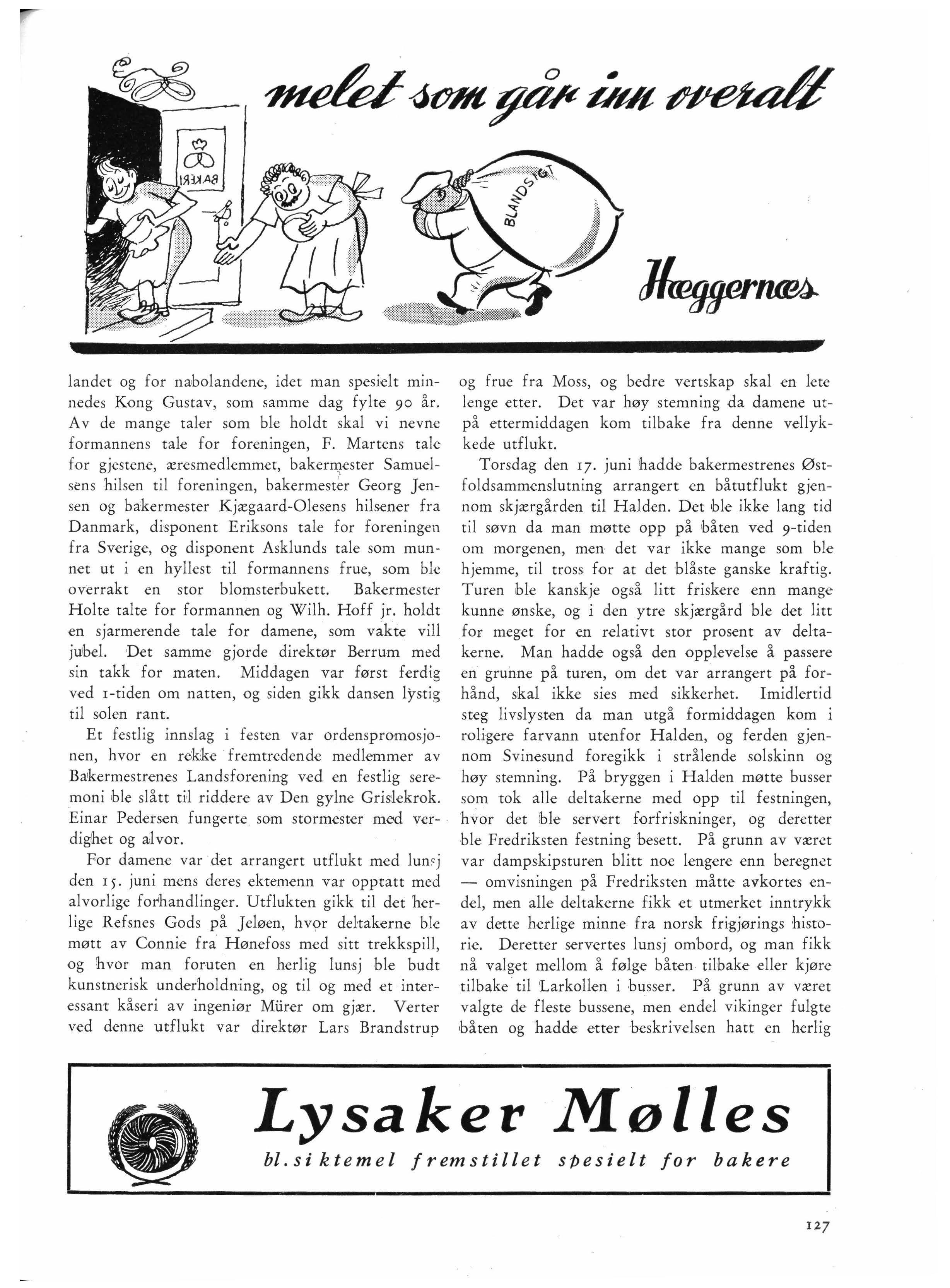 landet og for nabolandene, idet man spesielt minnedes Kong Gustav, som samme dag fylte 90 år. Av de mange taler som ble holdt skal vi nevne formannens tale for foreningen, F. Martens tale for gjestene, æresmedlemmet, baker~ester Samuelsens hilsen til foreningen, bakermester Georg Jensen og bakermester Kjægaard-Olesens hilsener fra Danmark, disponent Eriksons tale for foreningen fra Sverige, og disponent Asklunds tale som munnet ut i en hyllest til formannens frue, som ble overrakt en stor blomsterbukett. Bakermester Holte talte for formannen og Wilh. Hoff jr. holdt en sjarmerende tale for damene, som vakte vill juibel. ·Det samme gjorde direktør Berrum med sin takk for maten. Middagen var først ferdig ved I-tiden om natten, og siden gikk dansen lystig til solen rant.