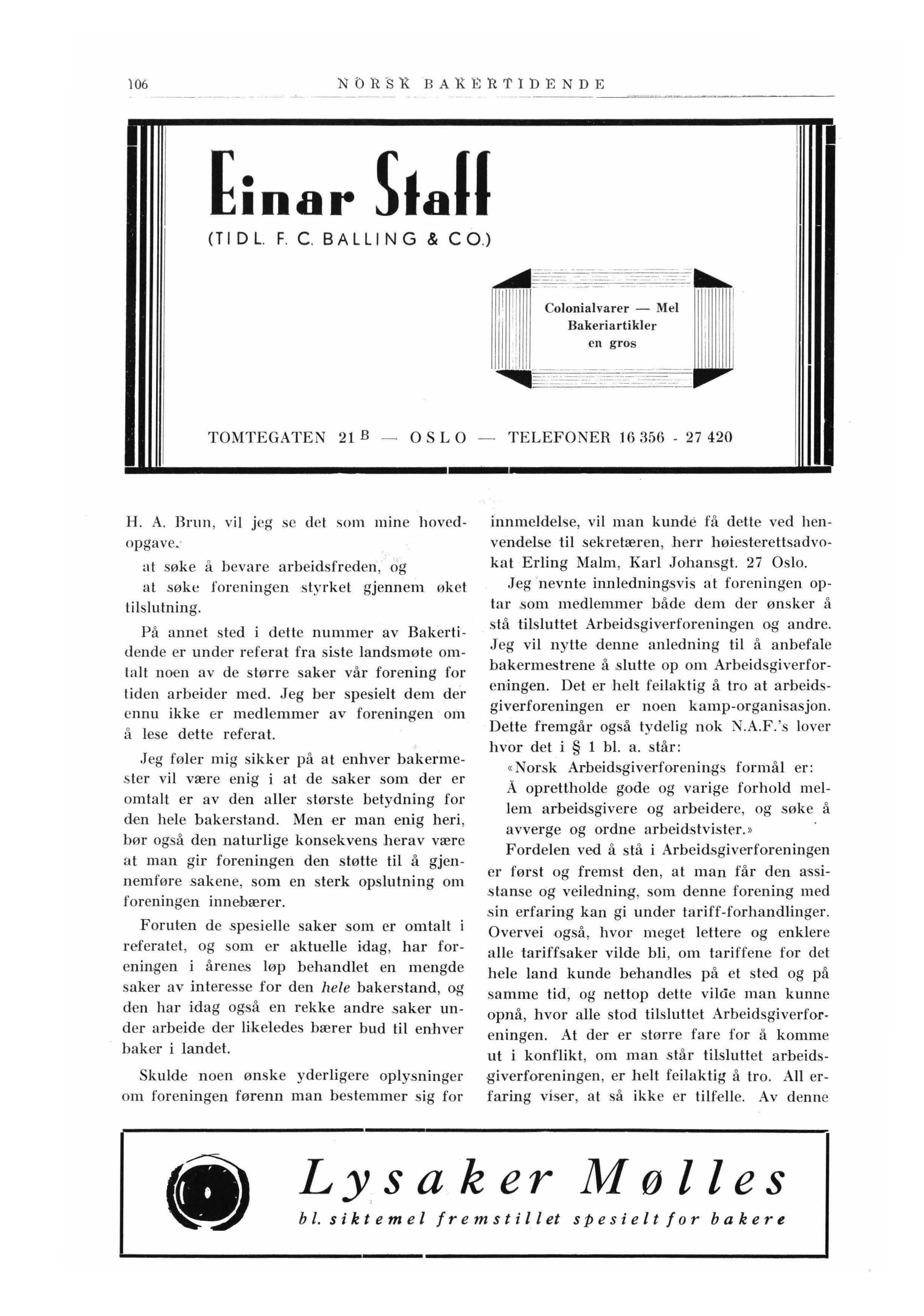Som nyvalgt form.ann i Bakermestrenes Landsforening og Landssammenslutning føler jeg trang til ved min tiltredelse å rette en appell til den norske bakerstand om mannjevn tilslutning til vår organisasjon.