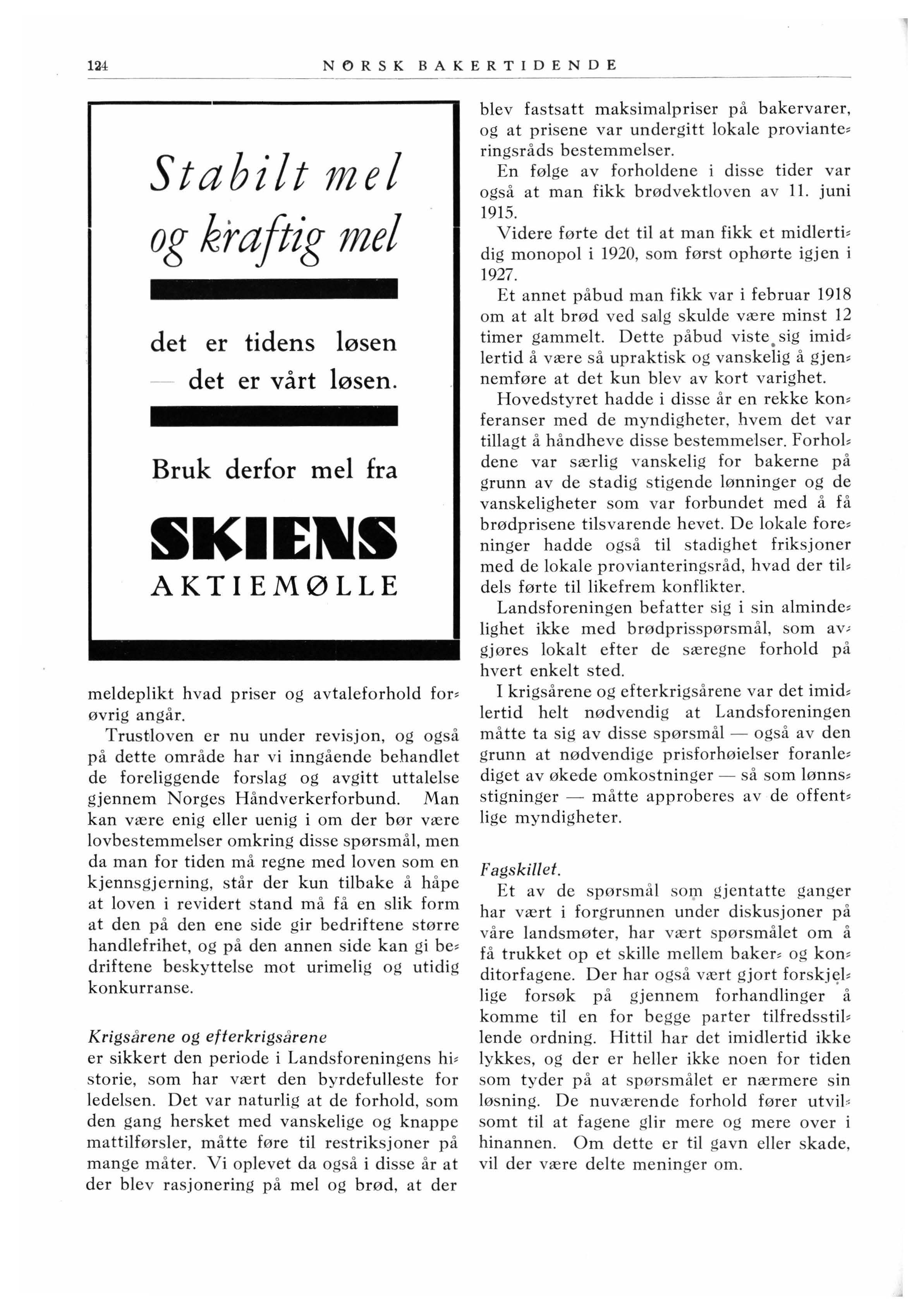 det med å få istand en stort anlagt felles re• klarne for bakervarer. Spørsmålet var første gang oppe til behandling på land s møtet i Ale, sund i 1932. Neste gang var saken oppe på landsmøtet i Oslo 1934. På begge landsmøter gikk de delegerte enstemmig inn for at pro• paganda burde søkes gjennemført, og at ba• kerne skulde skaffe sin - nærmere angitte del - av de midler, som var nødvendige hertil. Forutsetningen var at møllerne på sin side skulde skaffe et lignende beløp som bakerne, og at man ad annen vei skulde få midler til disposisjon. De som har arbeidet med saken har hatt den store skuffelse at bakerne ikke skaff et de midler som de to landsmøter en• stemmig gikk inn for skulde skaffes. Dette var så meget mere beklagelig som møllerne og an, dre institusjoner man henvendte sig til, var villige til å gå inn for sin del. Det er sørgelig at ikke bakerne har forstått betydnin ge n av en slik stort anlagt propaganda. Der er nok av dem der i de senere år på forskjellig vis har mistenkeliggjort det daglige brød i ernærin, gens tjeneste og som har gitt alt annet enn brød av sammalt mel mindreverdighets• stempel.
