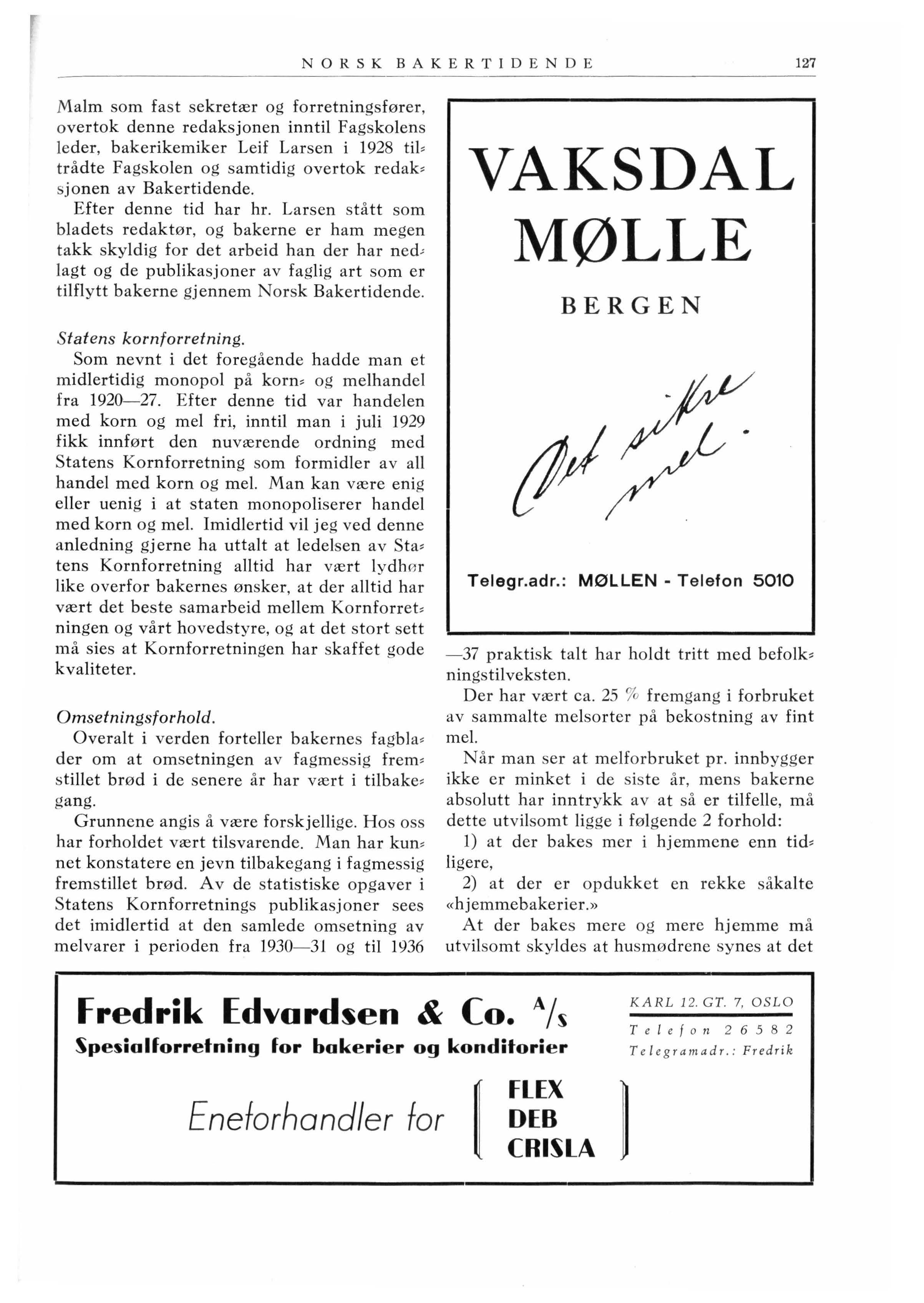 Grunnene angis å være forskjellige. Hos oss har forholdet vært tilsvarende. Man har kun , net konstatere en jevn tilbakegang i fagmessig fremstillet brød. Av de statistiske opgaver i Statens Kornforretnings publikasjoner sees det imidlertid at den samlede omsetning av melvarer i perioden fra 1930-3 1 og til 1936