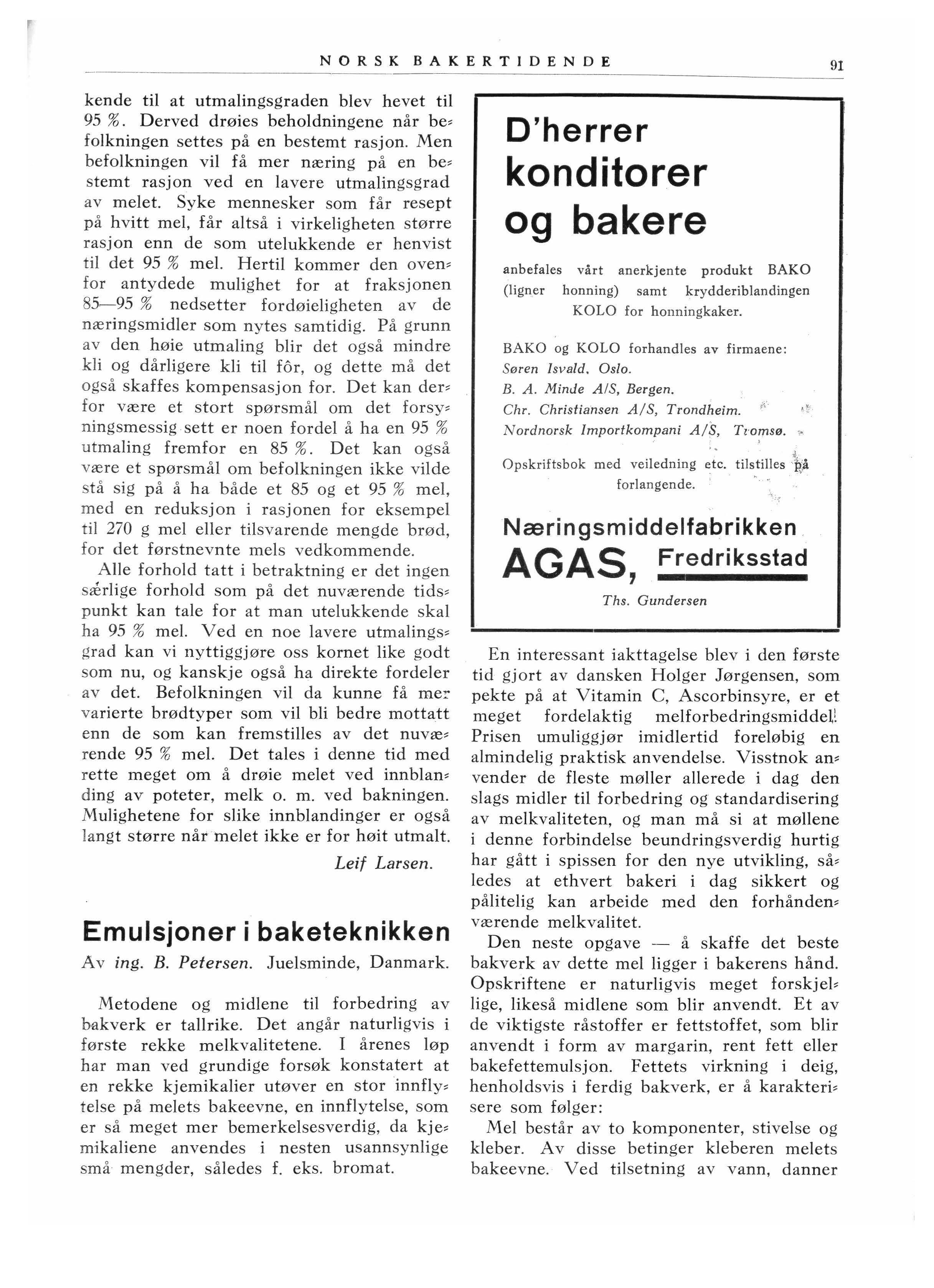 Vi vet ikke om planene om fremstilling av bakeemulsjoner i vårt land nu har måttet hen , legges på grunn av myndighetenes holdning. Vi vil i ethvertfall anse det for meget be, klagelig. Men skulde saken fremdeles være under behandling hos myndighetene bør de nu også ta endelig standpunkt til den før det er for sent. Bakeemulsjoner fremstilles uten restriksjoner i en rekke land i Europa. Hvor , for skal vi stå i en særstilling, når disse pro, <lukter både medfører besparelser av fett for la ndet, hjelper bakerne over de verste ulem,