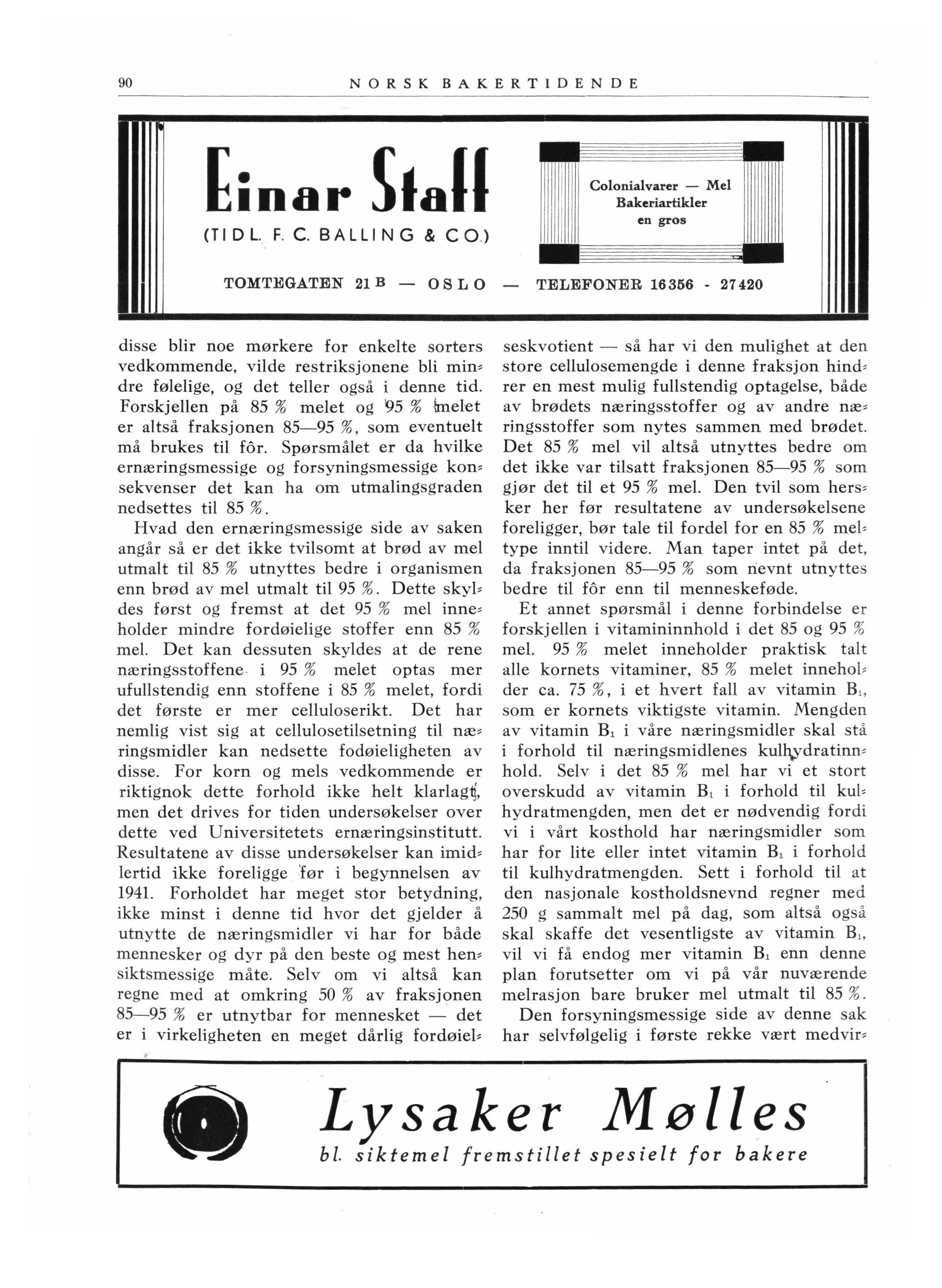 kende til at utmalingsgraden blev hevet til 95 % Derved drøies beholdningene når be, folkningen settes på en bestemt rasjon. Men befolkningen vil få mer næring på en be, stemt rasjon ved en lavere utmalingsgrad a v melet. Syke mennesker som får resept på hvitt mel, får altså i virkeligheten større rasjon enn de som utelukkende er henvist t il det 95 % mel. Hertil kommer den oven• for antydede mulighet for at fraksjonen 85~95 % nedsetter fordøieligheten av de næringsmidler som nytes samtidig. På grunn a v den høie utmaling blir det også mindre k li og dårligere kli til for, og dette må det o gså skaffes kompensasjon for. Det kan der• for være et stort spørsmål om det forsy, n ingsmessig sett er noen fordel å ha en 95 % u tmaling fremfor en 85 % Det kan også v ære et spørsmål om befolkningen ikke vilde s t å sig på å ha både et 85 og et 95 % mel, m ed en reduksjon i rasjonen for eksempel t il 270 g mel eller tilsvarende mengde brød, for det førstnevnte mels vedkommende Alle forhold tatt i betraktning er det ingen særlige forhold som på det nuværende tids, p unkt kan tale for at man utelukkende skal ha 95 % mel. Ved en noe lavere utmalings, grad kan vi nyttiggjøre oss kornet like godt som nu, og kanskje også ha direkte fordeler a v det. Befolkningen vil da kunne få me-::varierte brødtyper som vil bli bedre mottatt enn de som kan fremstilles av det nuvæ• rende 95 % mel. Det tales i denne tid med rette meget om å drøie melet ved innblan• d ing av poteter, melk o. m. ved bakningen. Mulighe tene for slike innblandinger er også l angt større når melet ikke er for høit utmalt.