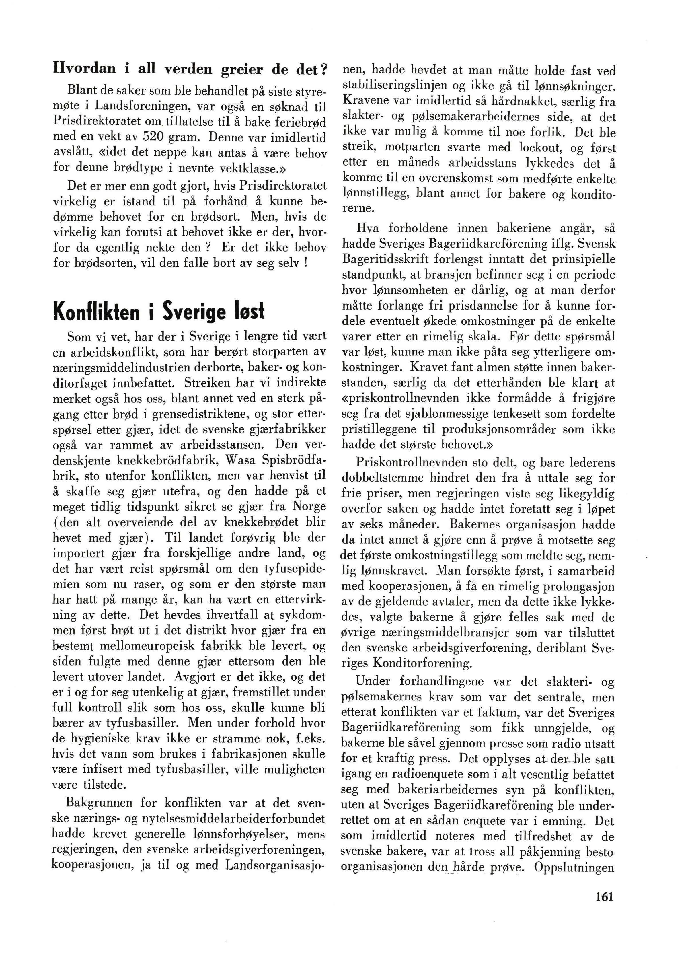 Som vi vet, har der i Sverige i lengre tid vært en arbeidskonflikt, som har berørt storparten av næringsmiddelindustrien derbo11e, baker- og konditorfaget innbefattet. Streiken har vi indirekte merket også hos oss, blant annet ved en sterk pågang etter brød i grensedistriktene, og stor etterspørsel etter gjær, idet de svenske gjærfabrikker også var rammet av arbeidsstansen. Den ver• denskjente knekkebrodfabrik, Wasa Spisbrodfabrik, sto utenfor konflikten, men var henvist til å skaffe seg gjær utefra, og den hadde på et meget tidlig tidspunkt sikret se gjær fra Norge ( den alt overveiende del av knekkebrødet blir hevet med gjær). Til landet forøvrig ble der importert gjær fra forskjellige andre land, og det har vært reist spørsmål om den tyfusepidemien som nu raser, og som er den største man har hatt på mange år, kan ha vært en etter virkning av dette. Det hevdes ihvertfall at sykdommen før st brøt ut i det distrikt hvor gjær fra en bestemt mellomeuropeisk fabrikk ble levert, og siden fulgte med denne gjær ettersom den ble levert utover landet. Avgjort er det ikke, og det er i og for seg utenkelig at gjær, fremstillet under full kontroll slik som hos oss, skulle kunne bli bærer av tyfusbasiller. Men under forhold hvor de hygieniske krav ikke er stramme nok, f.eks. hvis det vann som brukes i fabrikasjonen skulle være infisert med tyfusbasiller, ville muligheten være tilstede.