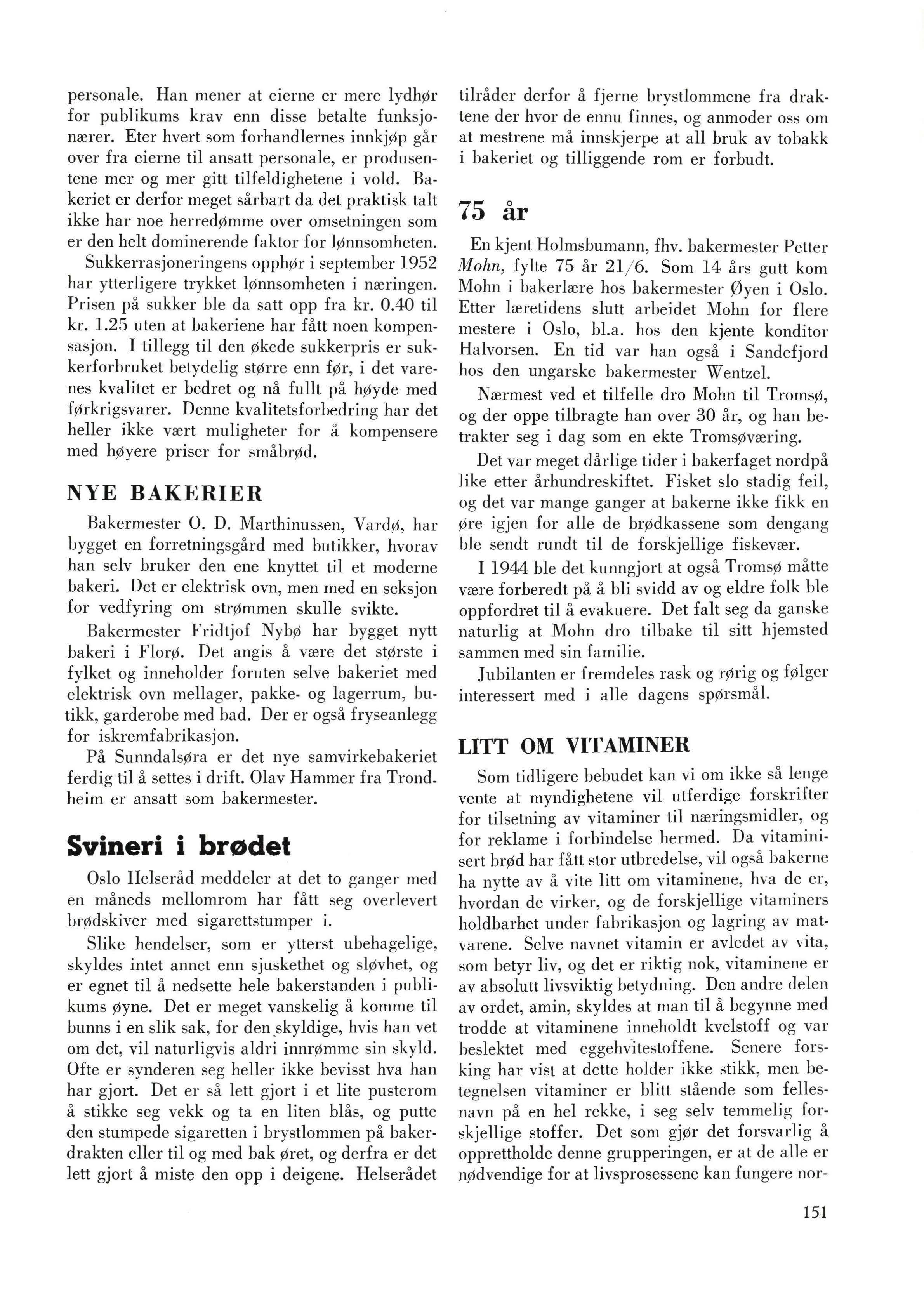 er tilstede i melet, og dette anser man tilstrekkelig til at alle normale behov er dekket. Dette er ikke så å forstå at det ikke har vært praktisert vitaminisering av brød med B-vitamin her i landet. Under krigen, da behovet på grunn av det skrale kosthold var usedvanlig stort, drev såledf's enkelte Oslo-bakere og «smuglet» B-vitamin inn i det brød de leverte til fangene på Grini.