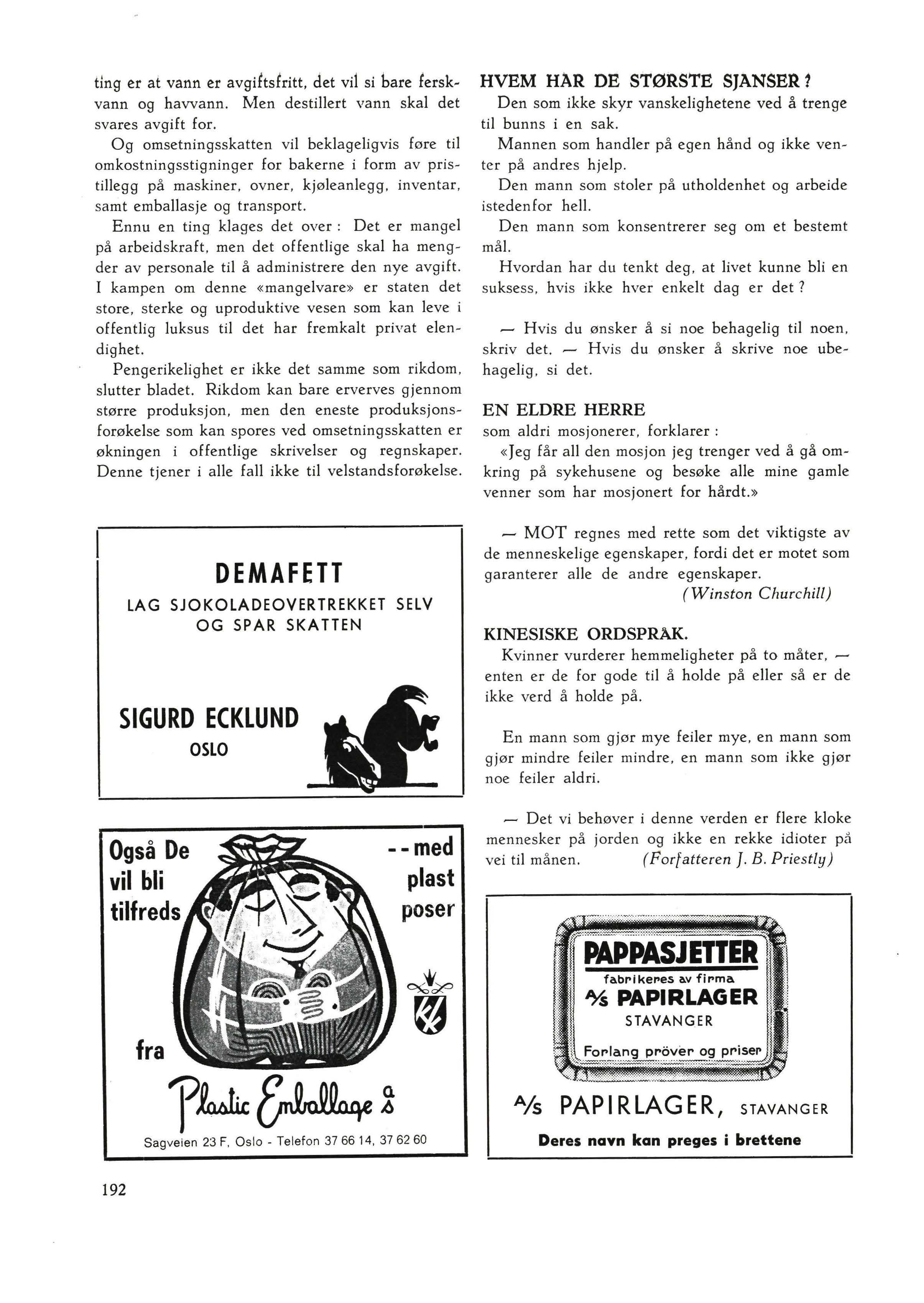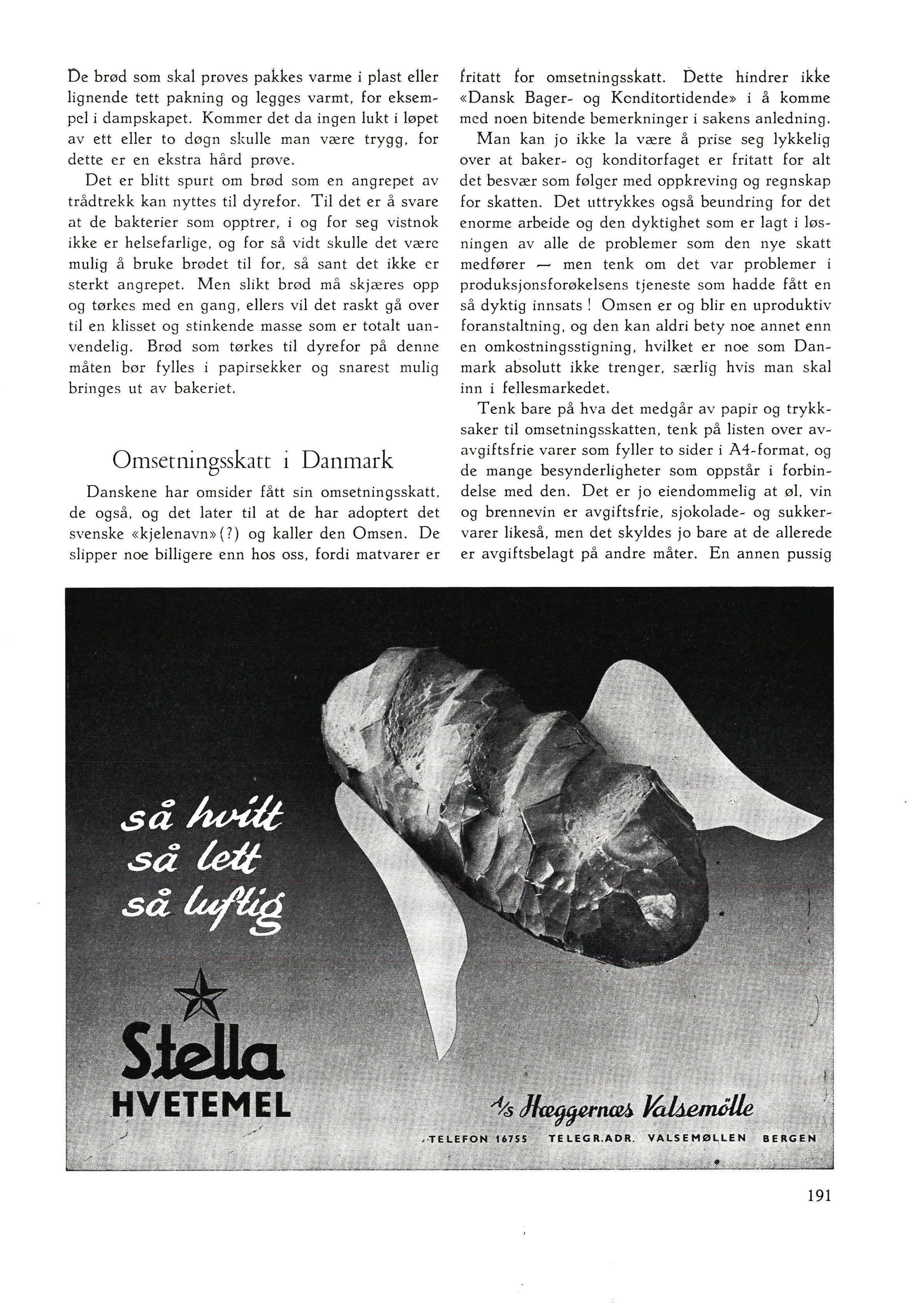 Man kan jo ikke la være å prise seg lykkelig over at baker- og konditorfaget er fritatt for alt det besvær som følger med oppkreving og regnskap for skatten. Det uttrykkes også beundring for det enorme arbeide og den dyktighet som er lagt i løsningen av alle de problemer som den nye skatt medfører - men tenk om det var problemer i produksjonsforøkelsens tjeneste som hadde fått en så dyktig innsats ! Omsen er og blir en uproduktiv foranstaltning, og den kan aldri bety noe annet enn en omkostningsstigning, hvilket er noe som Danmark absolutt ikke trenger, særlig hvis man skal inn i fe,llesmarkedet.