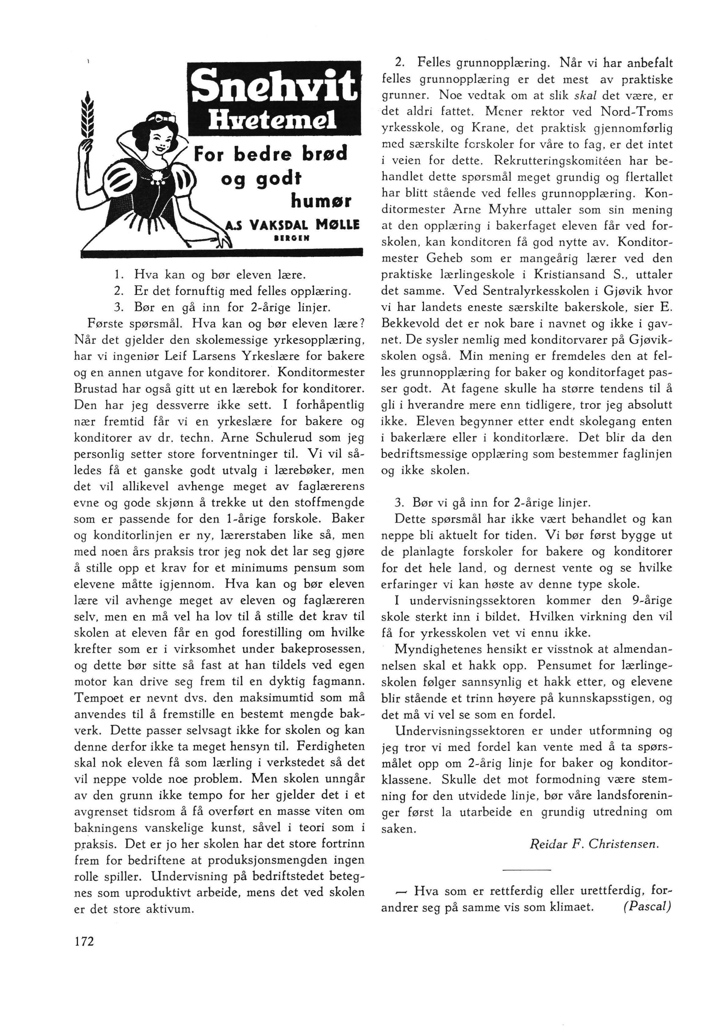 «Bakertidende » nr . 5 hadde vi den glede å gjengi en artikkel av faglæreren for bakere og konditorer ved Nord- Troms yrkesskole, konditormester Kaare Krane, som på en fengslende måte berører de problemer som har meldt seg for ham i forbindelse med den yrkesskolemessige opplæring Dette er spørsmål som angår alle, og for å få saken mer allsidig belyst har vi henvendt oss til to av de menn innen bakermestrenes organisa s joner som har best innsikt i disse ting , og bedt om å få høre deres mening om saken De to er bakermester Victor Holte, kjent for sin innsa t s i Riksyrkesutvalget og arbeidet for yrkesskolen i Vestfold , og rekrutteringskomiteens formann , Reidar F. Christensen . Vi vil gjerne frembære vår takk til de to for at de tross sommertravelheten har tatt seg tid til å svare så raskt på vår henvendelse, og gjengir i det følgende deres innlegg i tur og orden.