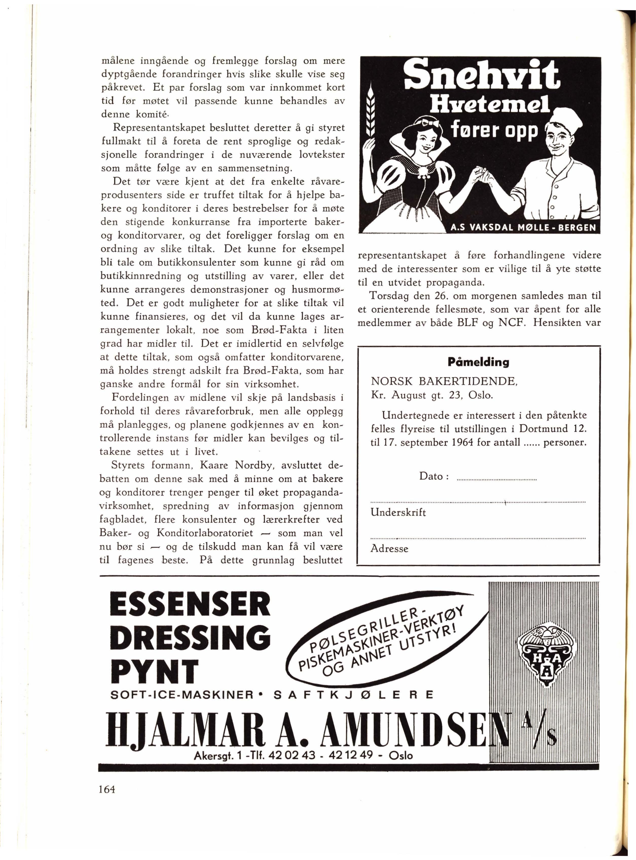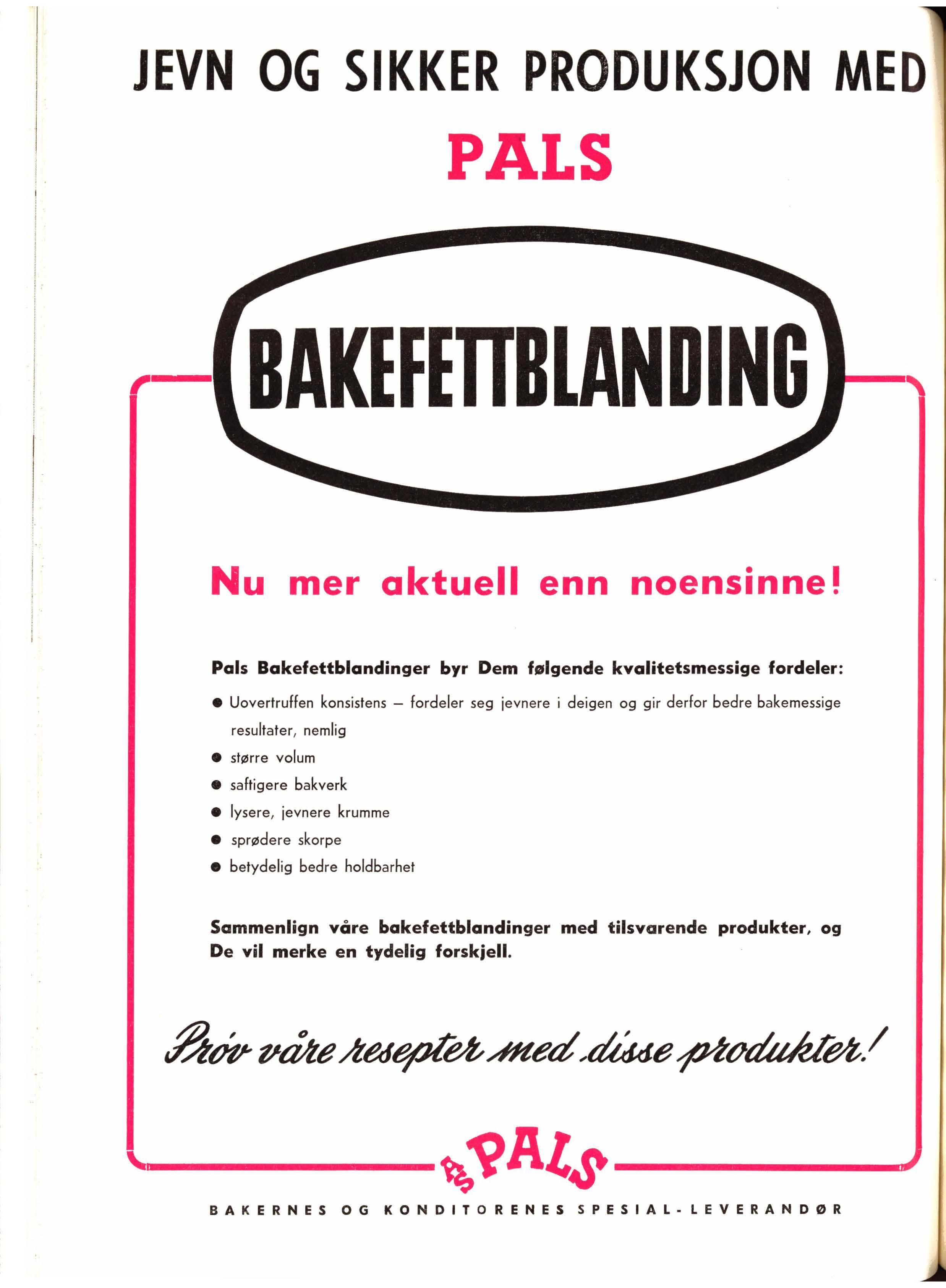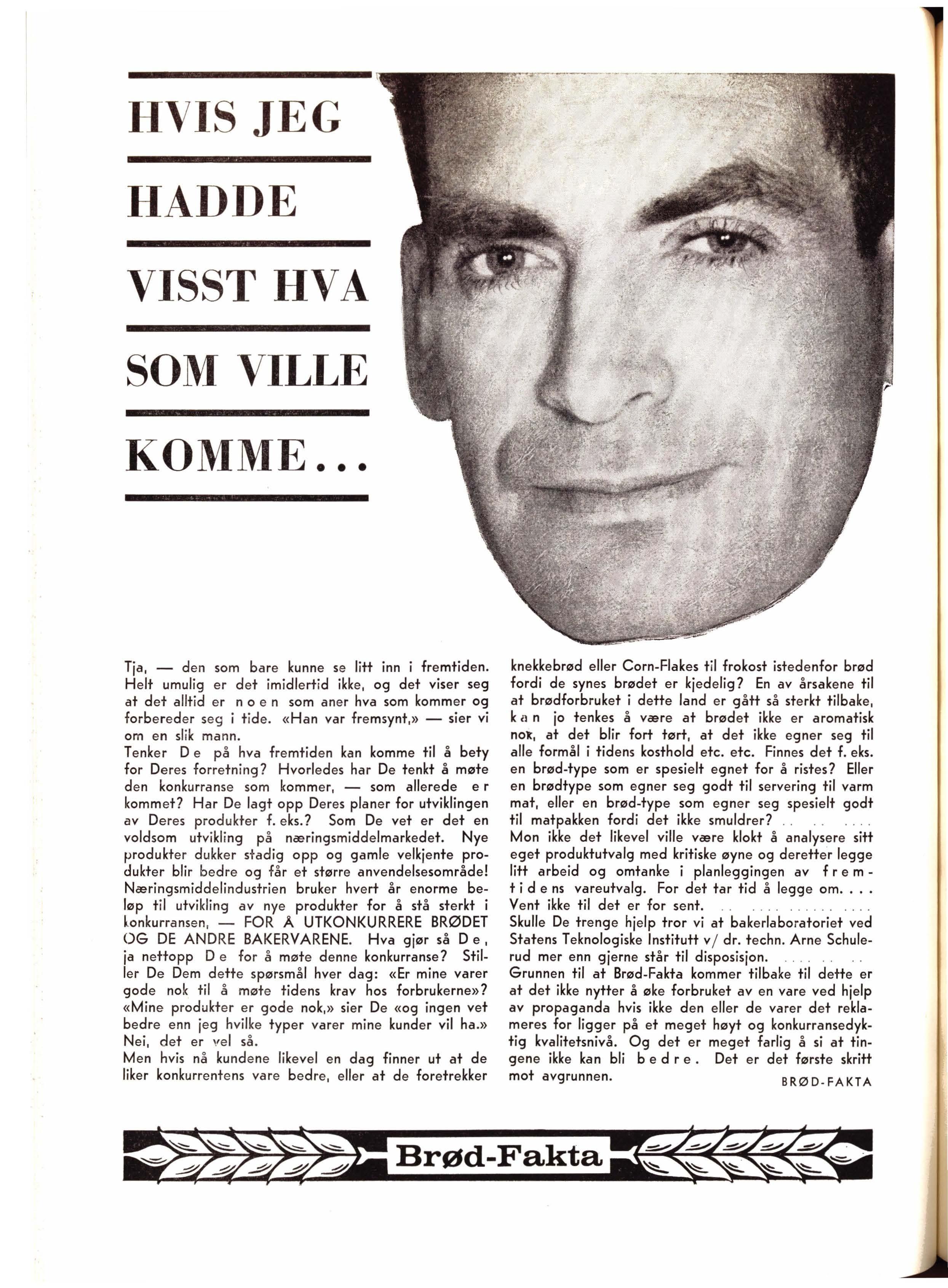 Tenker D e på hva fremtiden kan komme til å bety for Deres forretning? Hvorledes har De tenkt å møte den konkurranse som kommer, - som allerede e r kommet? Har De lagt opp Deres planer for utviklingen av Deres produkter f. eks.? Som De vet er det en voldsom utvikling på næringsmiddelmarkedet. Nye produkter dukker stadig opp og gamle velkjente produkter blir bedre og får et større anvendelsesområde! Næringsmiddelindustrien bruker hvert år enorme beløp til utvikling av nye produkter for å stå sterkt i lonkurransen , - FOR A UTKONKURRERE BRØDET OG DE ANDRE BAKERVARENE . Hva gjør så De, ja nettopp D e for å møte denne konkurranse? Stiller De Dem dette spørsmål hver dag: «Er mine varer gode nok til å møte tidens krav hos forbrukerne»?