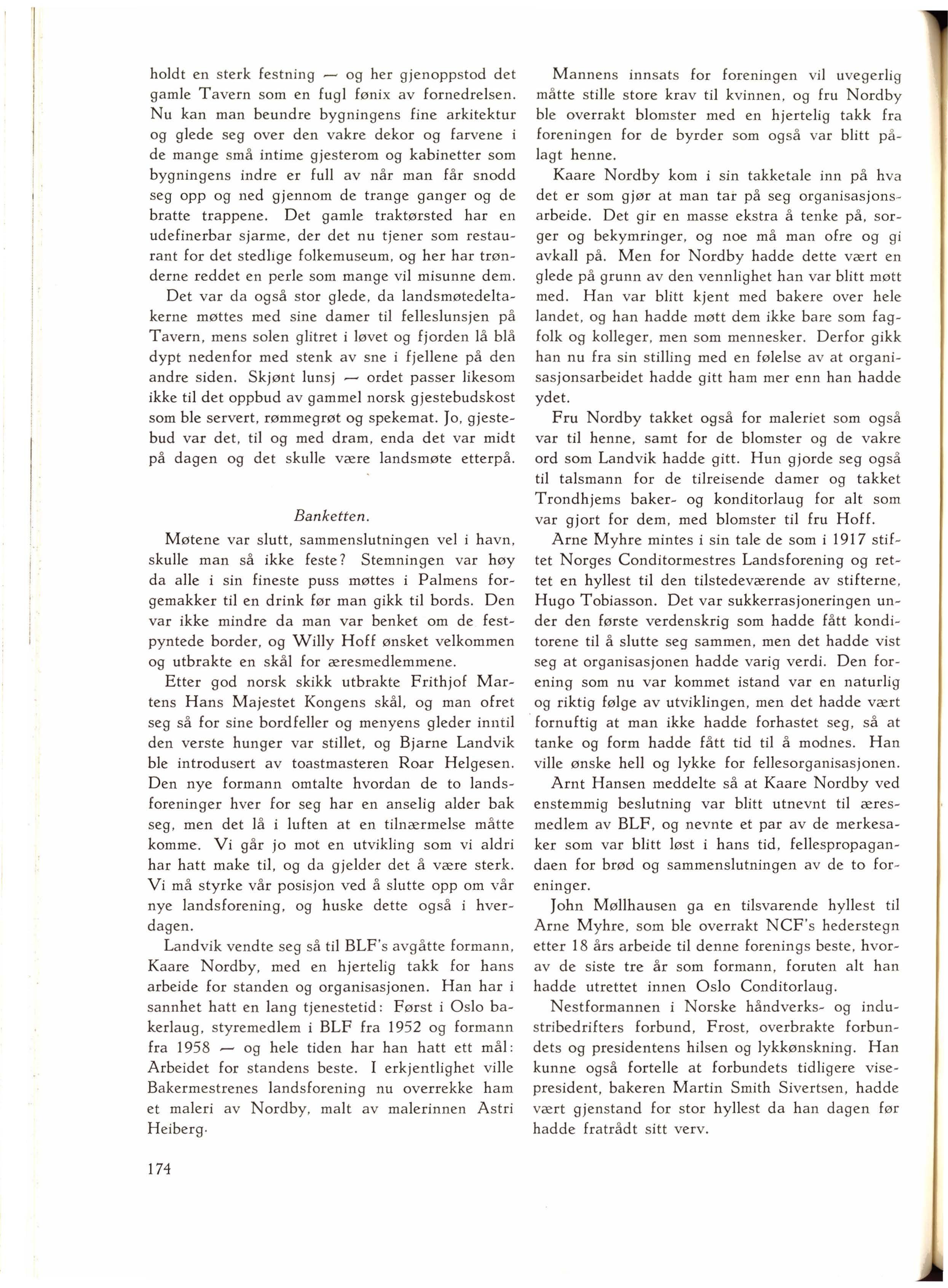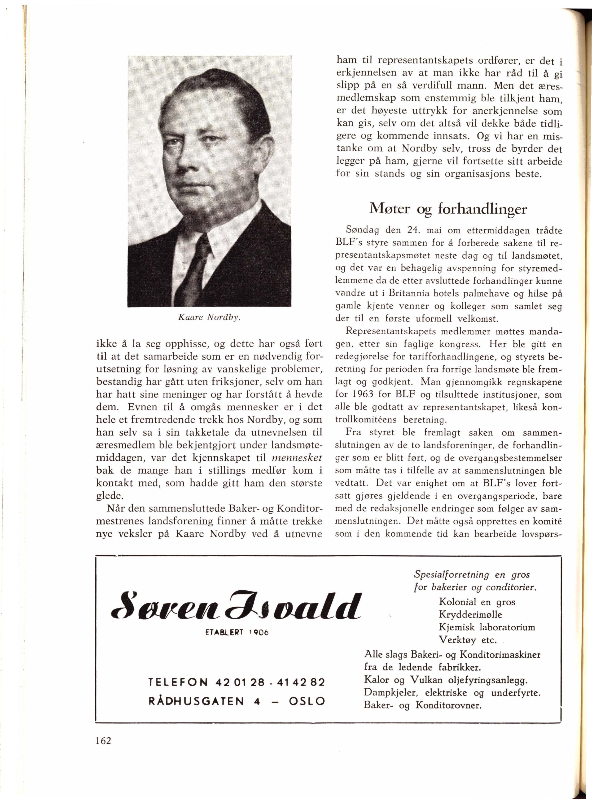 u da landsmøtet er over, kan det være på sin plass overfor de mange som ikke fikk ta del i de glansfulle dager i Trondheim å presentere det nyeste æresmedlem i Bakermestrenes landsforening, Kaare Nordby. Skjønt - en presentasjon skulle i og for seg ikke være nødvendig. I hans lange tjenestetid i bakernes interesse har hans navn vært så meget fremme, og hans oppdrag har ført ham til møter i så mange av de lokale laug og sammenslutninger i vårt vidstrakte land, at det knapt er mange av hans kolleger som ikke ved en eller annen anledning har møtt ham personlig. Men la oss ta hans data : Han er født i 1906 og var således bare ungdommen, da vi for første gang finner hans navn i «Bakertidende» i 1938 i forbindelse med et tillitsverv i Oslo Bakerlaug. Så dukker kildene inn i krigstidens mørke, men navnet kommer frem igjen som styremedlem i samme laug i 1946, det vokser til oldermann i 1950, og omtrent samtidig finner vi Nordby som medlem av styret i Bakermestrenes landsforening. Alt i 1952 avanserer han til viseformann, og siden 1958 , altså i 6 år, har han bekledd den vanskelige og utsatte post som landsforeningens formann.