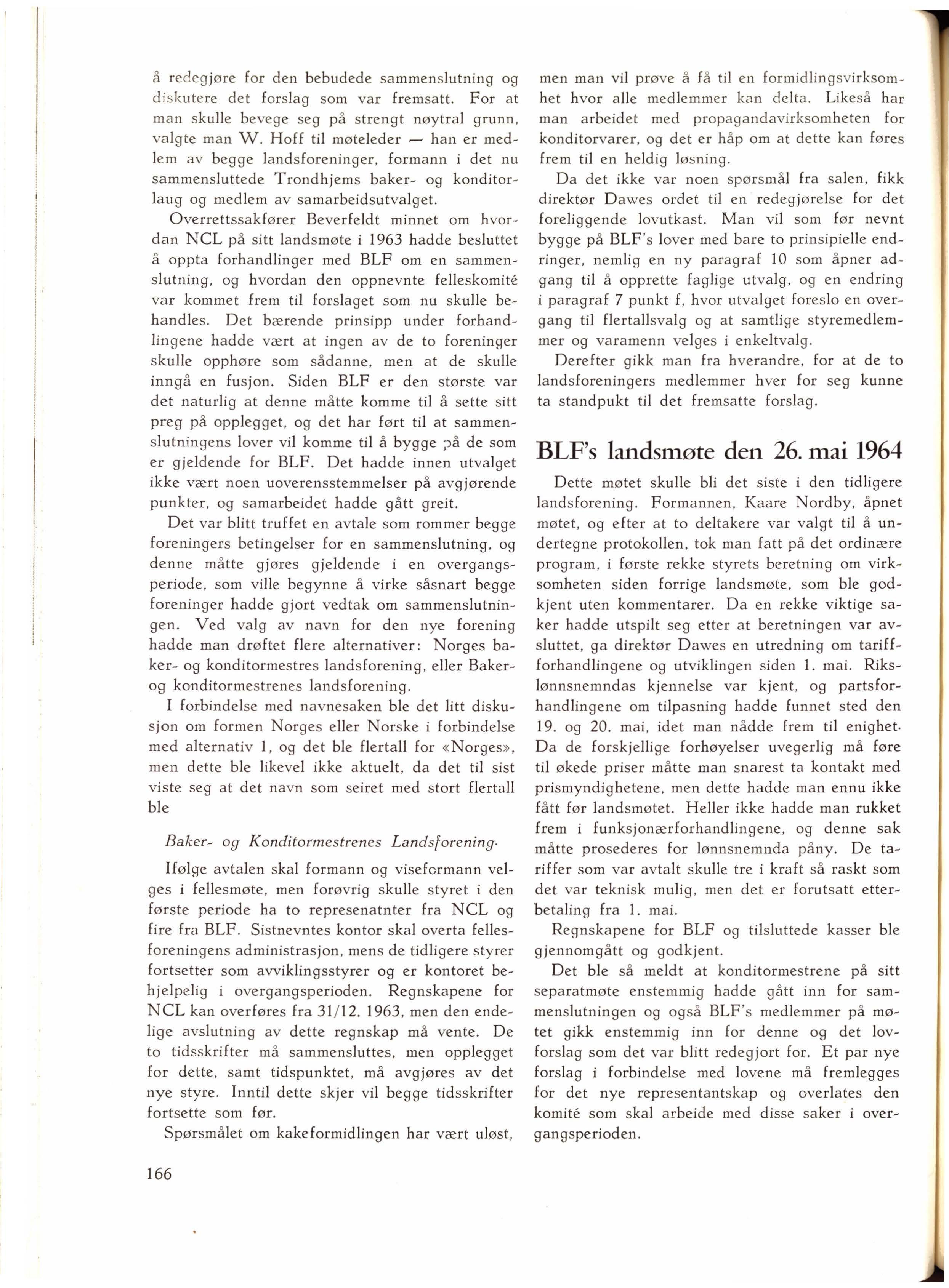 Overrettssakfører Beverfeid t minnet om h vordan NCL på sitt landsmøte i 1963 hadde besluttet å oppta forhandlinger med BLF om en sammenslutning, og hvordan den oppnevnte felleskomite var kommet frem til forslaget som nu skulle behandles. D et bærende prinsipp under forhandl ingene hadde vært at ingen av de to foreninger sku lle opphøre som sådanne, men at de skulle inngå en fusjon. Siden BLF er den største var det naturlig at denne måtte komme til å sette sitt preg på opplegget , og det har ført til at sammenslutningens lo ver vil komme til å bygge ;:iå de som er gjeldende for BLF. Det hadde innen utvalget ikke vært noen uoverensstemmelser på avgjørende punkter , og sa marbeidet hadde gått greit.