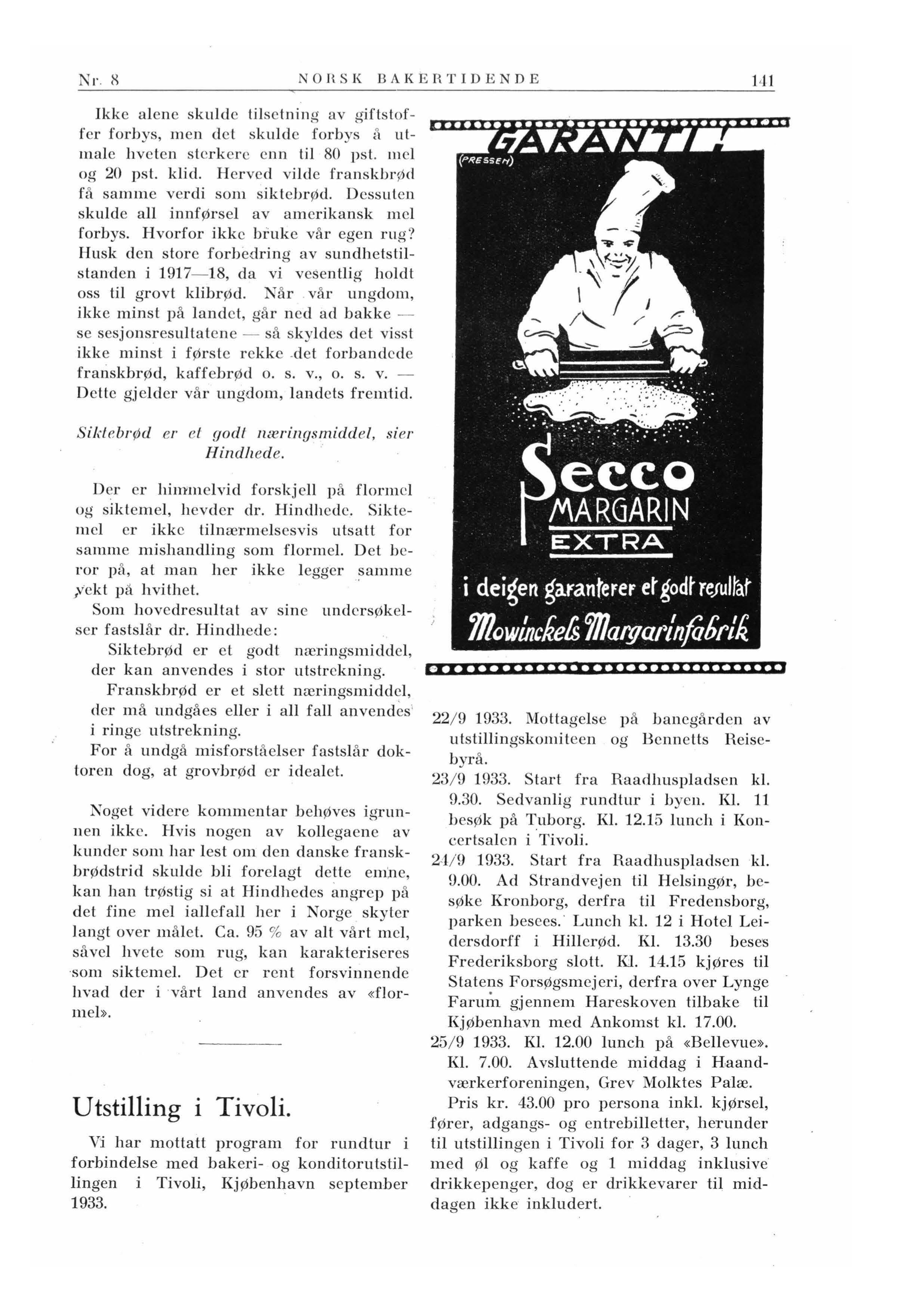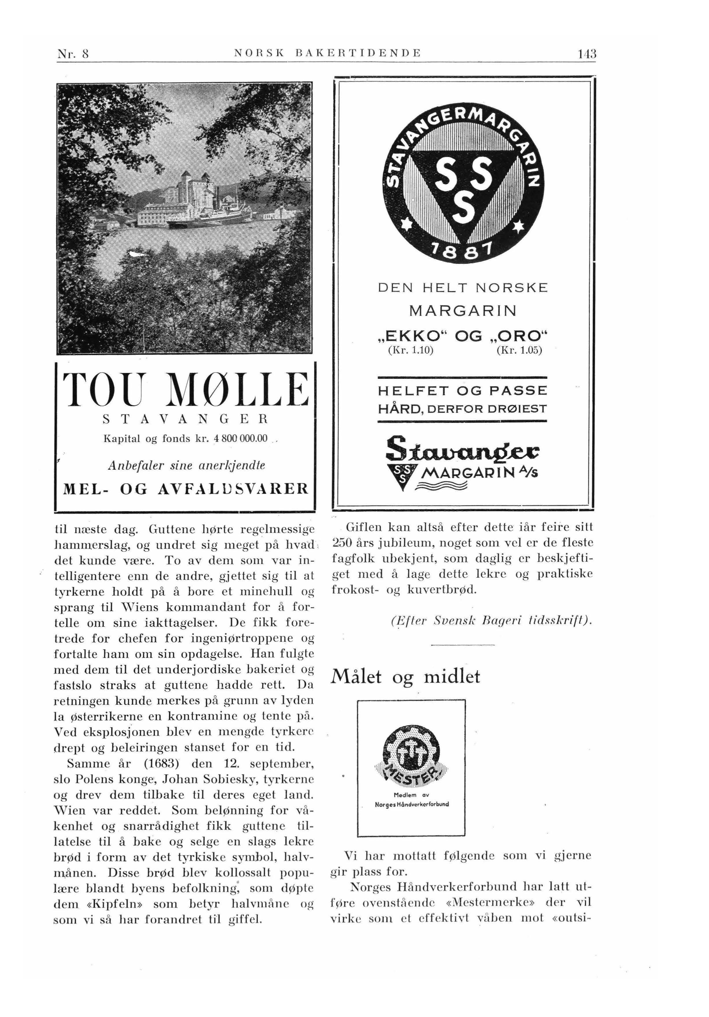 mar gari n pr. m åne d og p erso n til billig pris. Alle virksomheter, som anvender m arga rin og kunstspis efe lt, således bak eri e r og brødfabrikk e r, skal angi dett e· i e n ophengt plakat: «Her brukes til varenes fremstilling også margarin, coco sf e tt og h e rded e spiseoljer». Bakerien e skal dessut e n d e klar ere d e tte i deres allerede tidli ge r e påbudte prisfortegnelser. Ikke d eklarasjonspliktige er do g kjeks, tvebakker o. lign. «Dau e rbackwar e rn>, og undtatt fra skatten e r e nkelte tilfelle, f eks . d e t cocosfett, som brukes til fr e m s tillin g av fylte vafler. D e t e r klart at bakerhåndverket, hvis forbruk av margarin av d e n tidlig e r e produksjon, c irka 475.000 tonns pr. år, h ar ut g jort 20 a 25 pst., ved d eklaras jo nst vange n og d e n større knapph e t p å margarin tving e s til mere og m e re å gå bort fra denne og ut e nlandske fettsorter til innenlandsk e For d e klarasjon , d e r ub e tin ge t forlanges, selv om utenlandsk fett kun anvendes til ganske enkelte ting, stempler jo de fin e re forr e tning e r til sådanne av annen klass e . Av innenlandske f e ttstoff er blir oksetalg det billigst e og vil derfor nok få større b e tydning for d e mindr e bakerforretninger tross sin stivhet og den l e tt fr e mtr e d e nd e talgsmak. Ellers m å de ta sv in efet t , s om da riktignok helst bør være fremstillet som d e t amerikanske (pr esse t i valser, ikk e ophetet) for å op n å den til f. eks. mørdeig n ø dvendi ge seighet; og d a d e tt e f e tt e r lite holdbart, m å d e r tils e tt es e t uskad eli g konserveringsmiddel.