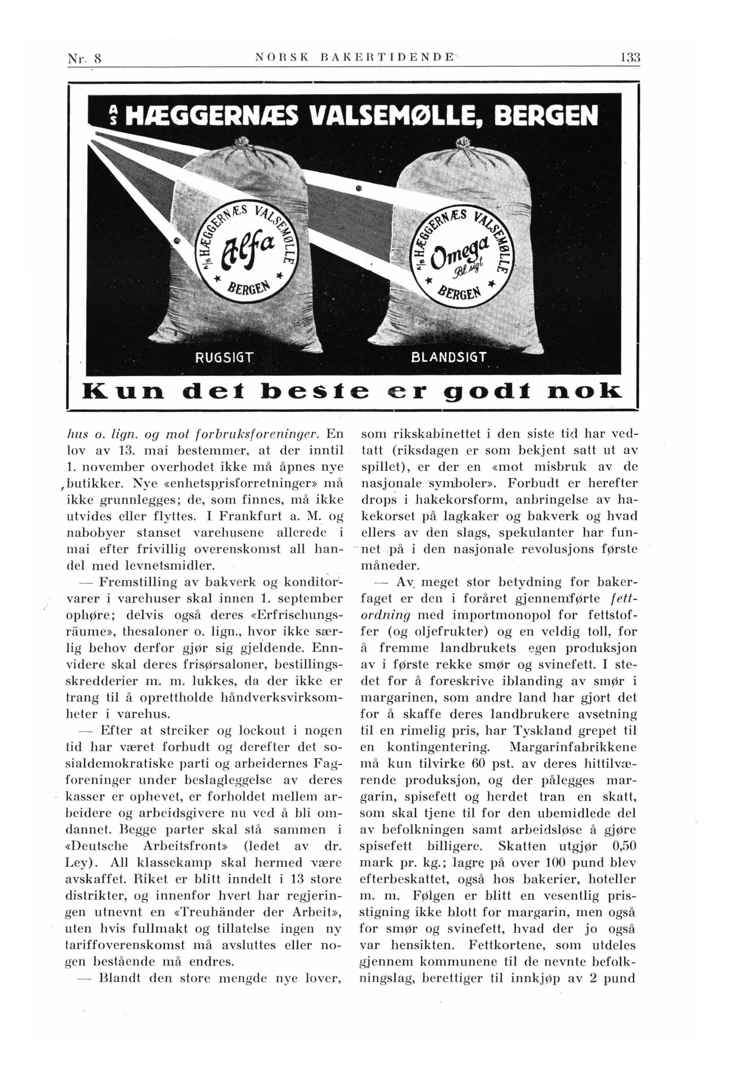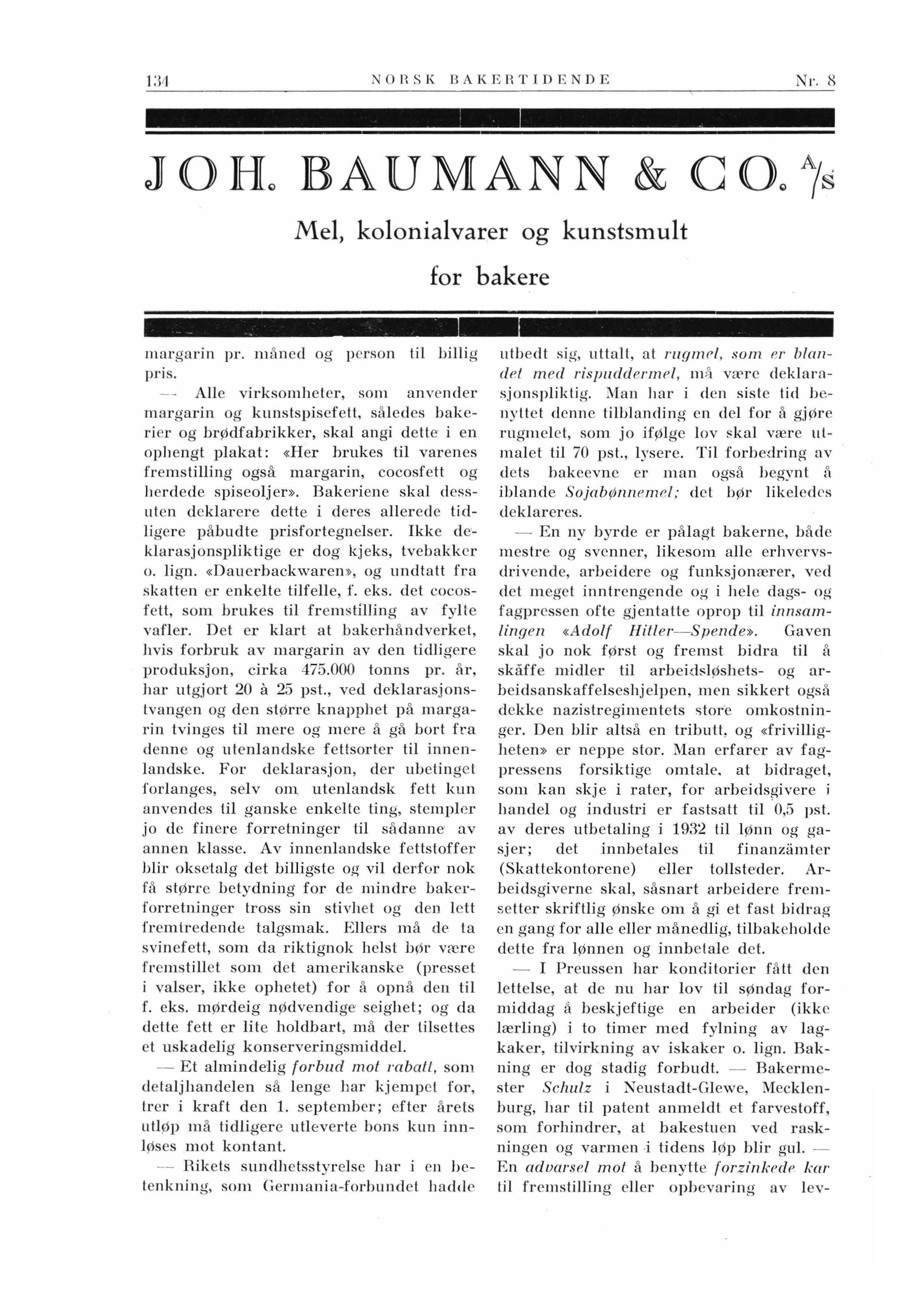 - Av_ meget stor betydning for bak e rfag e t er d e n i forår e t gjennemfØrte fettordning med importmonopol for fe tt stoffer ( og olj efrukter) og en veldig to ll , for å fremme landbrukets ege n produksjon av i første rekke smør og svinefett. I stedet for å for es kriv e iblanding av smør i margarinen, som andre land har gjort det for å skaffe deres landbrukere avsetning til e n rimelig pris, har Tyskland grepet ti l e n kontingent e ring Margarinfabrikkene m å kun tilvirke 60 pst. av d e res hi ttil værende produksjon, og der p å legges margarin, spisefett og herdet tran en skatt, som skal tjene til for den ubemidlede del av befolkningen samt arbeidsløse å gjøre spisefett billiger e. Skatten utgjør 0,50 mark pr . kg.; la g r e p å over 100 pund bl ev e fterbeskattet, også hos bakerier, hotell e r m. m. Følgen e r blitt en v ese ntlig prisstigning ikke blott for margarin, men ogs å for smør og svinefett, hvad der jo ogs å var hensikten. Fettkortene, som ut d el es gjennem kommun e ne til de nevnte befolknin gs lag, berettiger til innkjøp av 2 pund