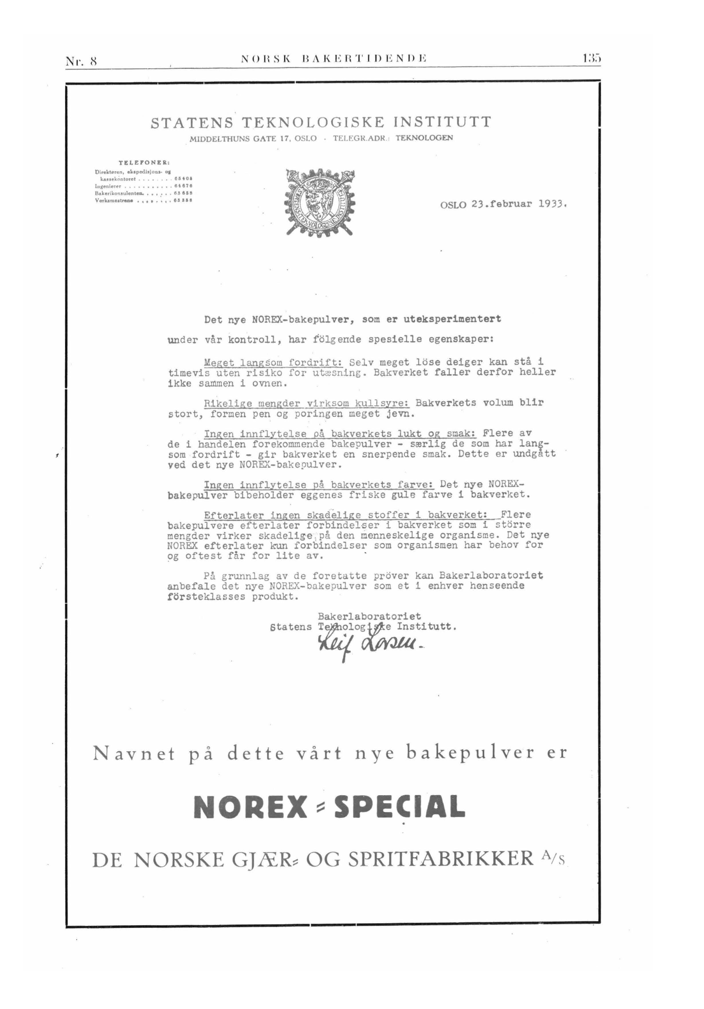 På grunnlag av de foretatte prover kan Bakerlaboratoriet anbefale det nye NOREX-bakepulver som et i enhver henseende forsteklasses produkt.