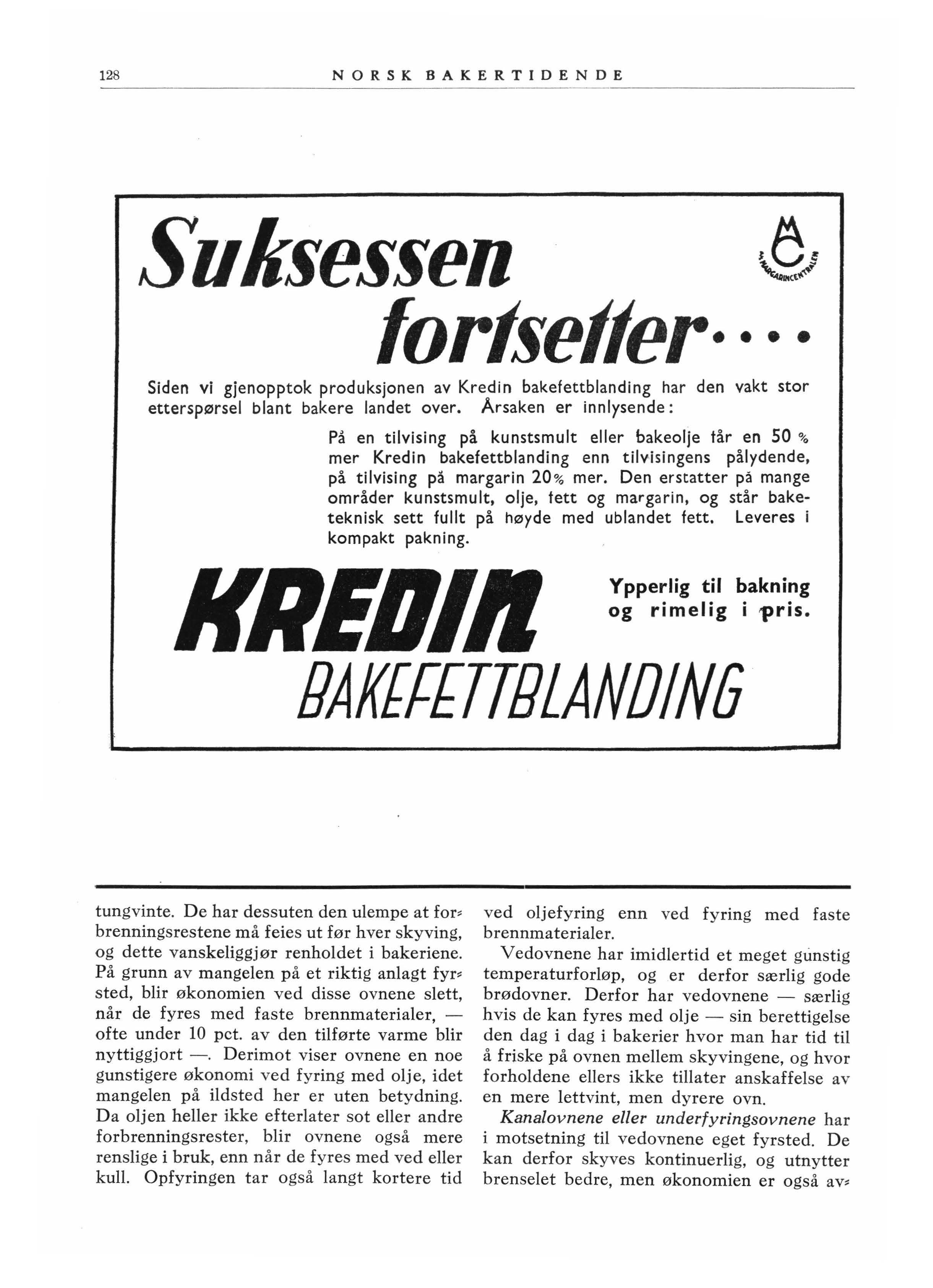 Hvis det krever overveielse å kjøpe en ba• kerimaskin, så krever det ennu større omtanke å kjøpe en bakerovn. En bakerimaskin er i regelen en flyttbar ting som man forholds• vis lett kan skille sig av med, hvis den ikke svarer til behovet. Det er anderledes med en bakerovn. En bakerovn er i høiere grad enn bakerimaskinene en del av selve bakeriet. Den er i regelen naglefast, og har spesielle krav til plass, fyrrum o. I. Ofte kreves direkte byg, ningsmessige forandringer når en ny baker• ovn skal installeres, og i mange tilfelle er byg, ningen av bakerovnen utført utelukkende med henblikk på plasering i et bestemt bakeri. Flytning av en bakerovn er en omstendelig affære, og innbytning er ofte umulig. En ba• kerovn er dessuten kostbar. Og da bakerov• nen ofte får en bestemmende betydning for arbeidet i bakeriet og for kvaliteten av bak• verket, blir det en alvorlig sak å kjøpe en bakerovn.
