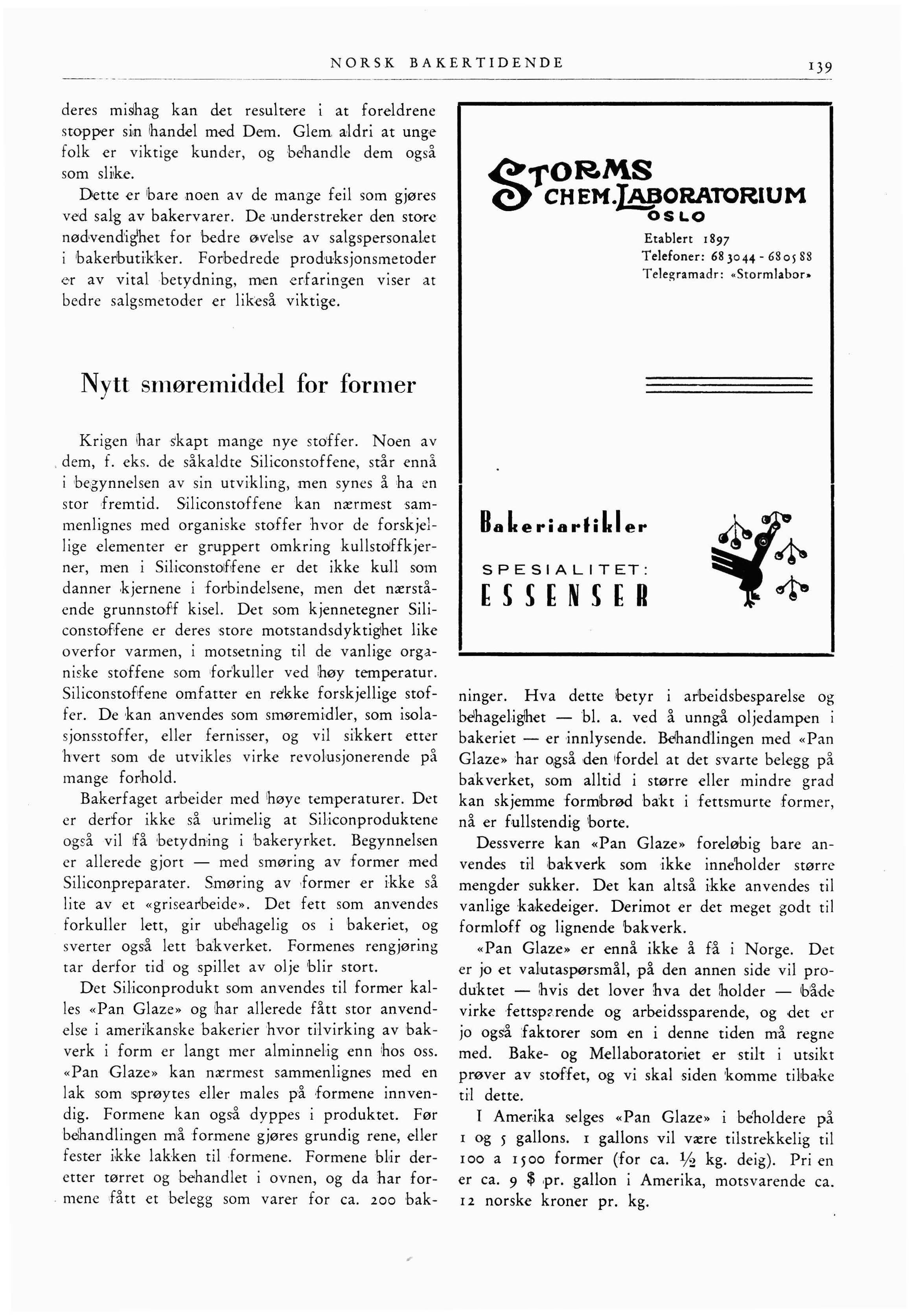 ninger. Hva dette betyr i arbeidsbesparelse og belhage!.iglhet - bl. a. ved å unngå oljedampen i bakeriet - er innlysende. Be/handlingen med «Pan Glaze» har o,gså den fordel at det svarte belegg på bakverket, som alltid i større eller mindre grad kan skjemme formtbrød bakt i fettsmurte former, nå er fullstendig borte.
