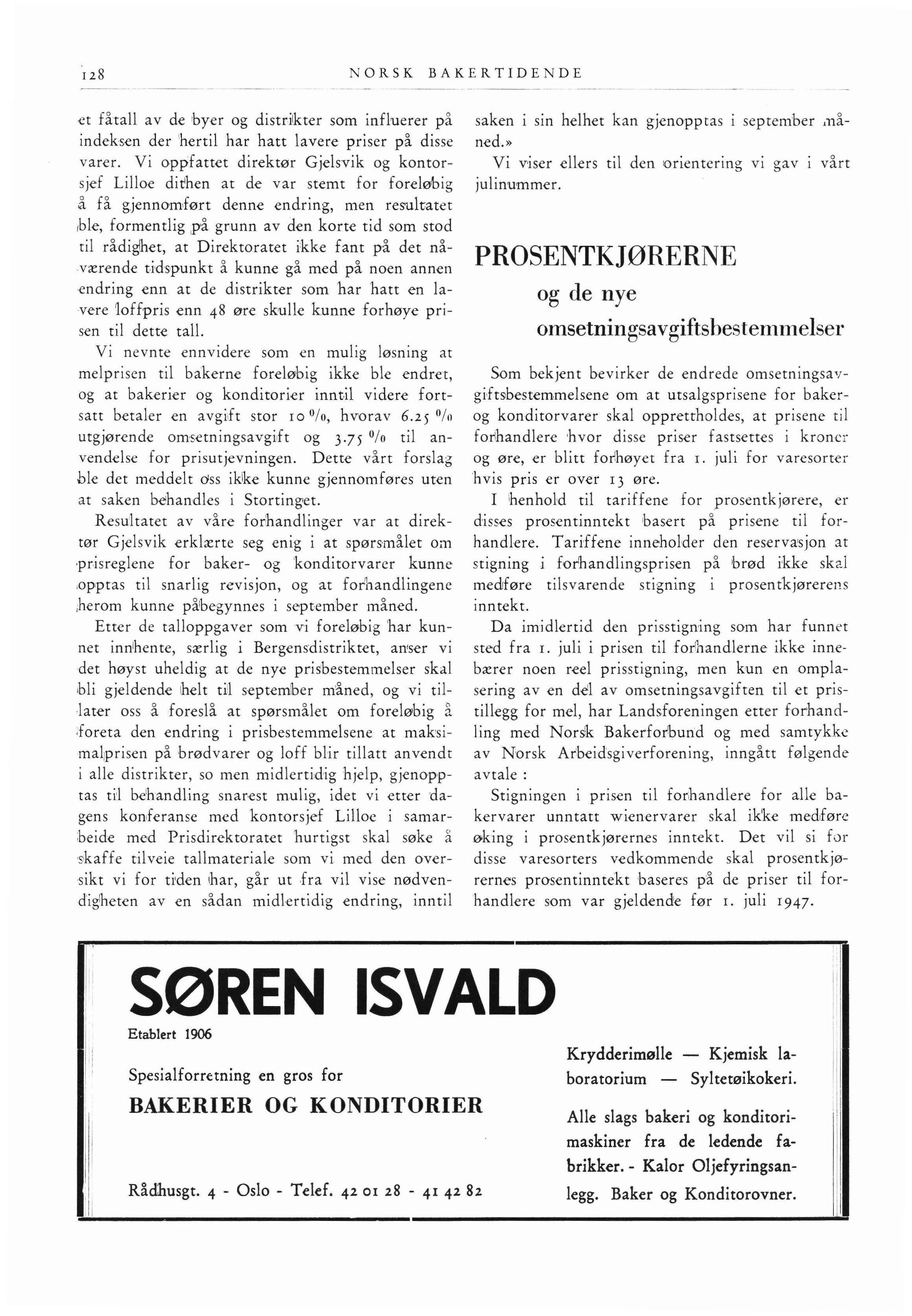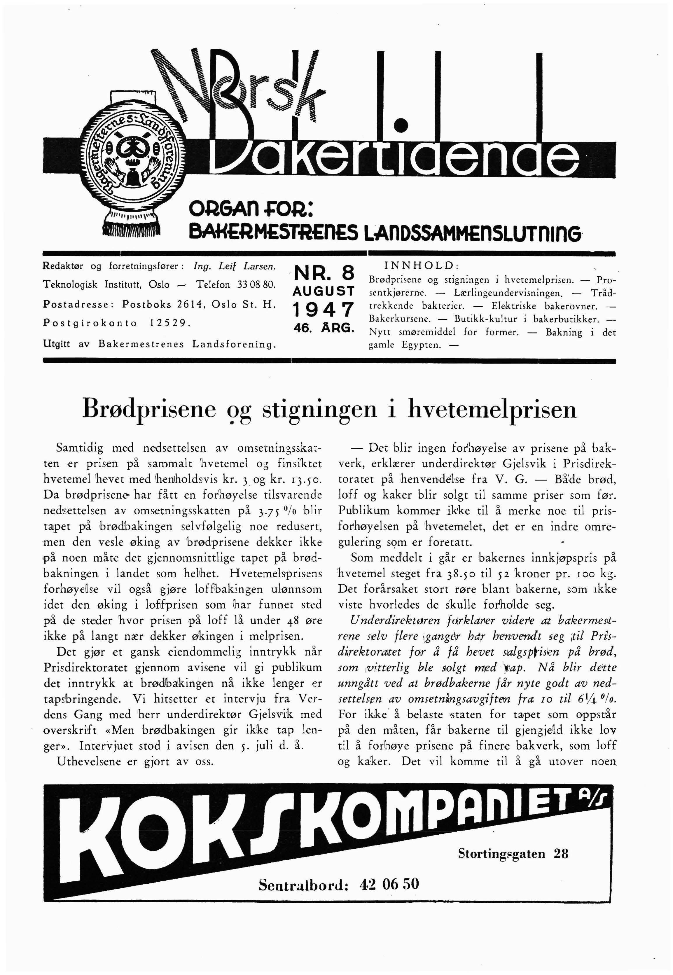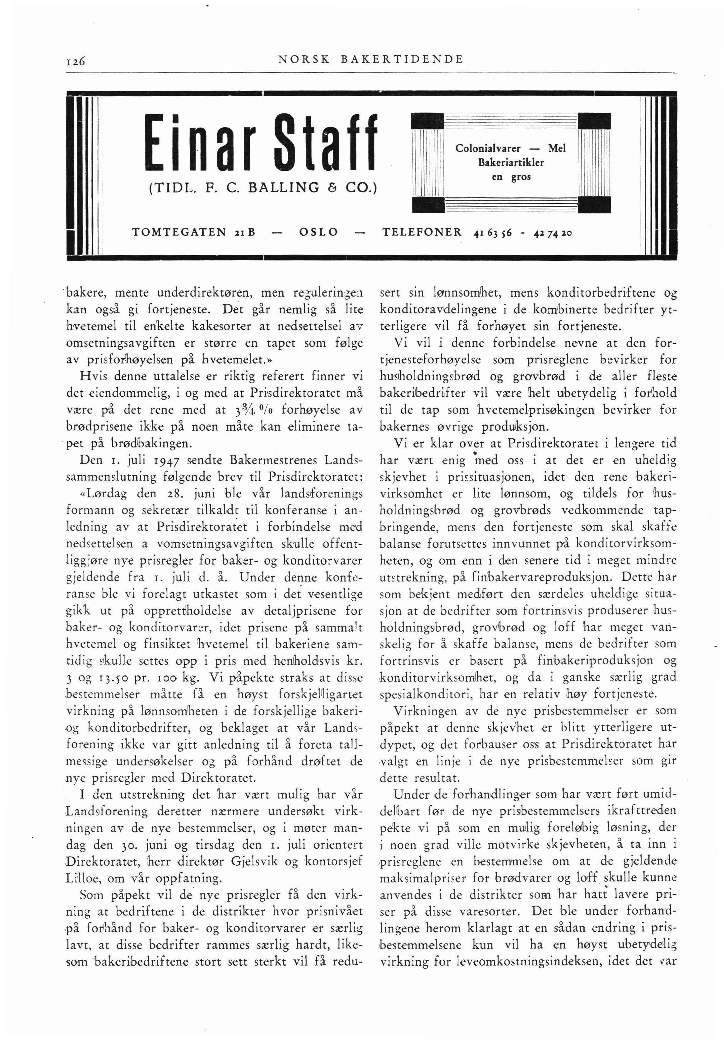 Den r. juli 1947 sendte Bakermestrenes Landssammenslutning følgende brev til Prisdirektoratet: «Lørdag den 28. juni ble vår landsforenings formann og sekretær tilkaldt til konferanse i anledning av at Prisdirektorat~t i forbindelse med nedse ttelsen a vomsetningsavgif ten skulle offentliggjøre nye prisregler for baker- og konditorvarer gjeldende fra 1. juli d. å. Under denne konferan se ble vi forelagt utkastet som i det vesentlige gikk ut på oppretclholdel se av detaljprisene for haker- og konditorvarer, idet prisene på sammalt hvetemel og finsiktet hvetemel til bakeriene samtidi g ~1kuUe se tt•es opp i pris med heniholdsvis kr. 3 og 13.50 pr. 100 kg. Vi P'åpekte straks at disse .bes temmelser måtte få en høyst forskjellligartet virkn i ng på lønnsomiheten i de forskjellige bakeriog konditorbedrifter, og beklaget at vår Land sforen ing ikke var gitt anledning til å foreta tallmessige undersøkelser og på forhånd drøftet de nye prisregler med Direktoratet