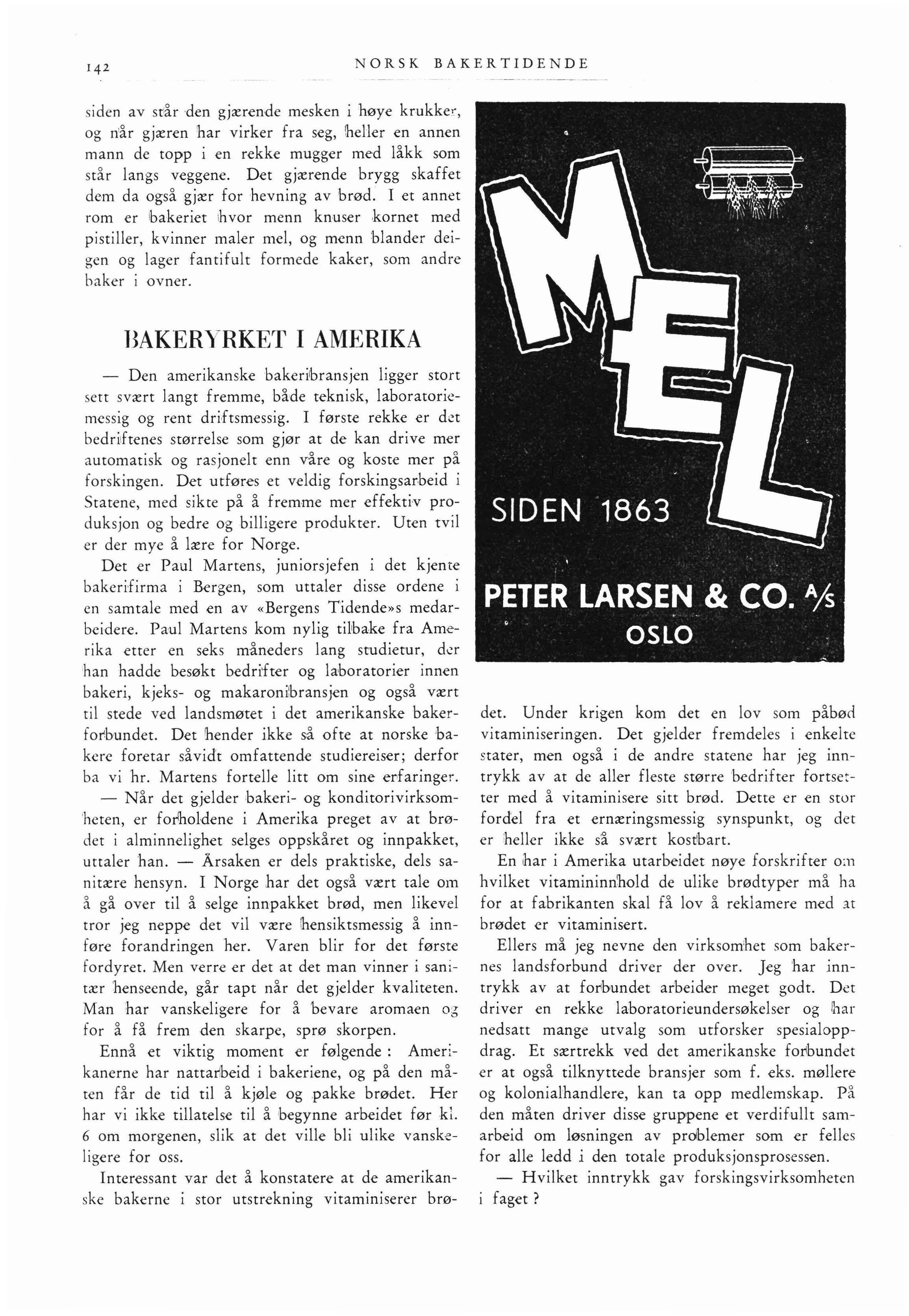 Det er Paul Martens, juniorsjefen i det kjente bakeri-firma i Bergen, som uttaler disse ordene i en samtale med en av «Bergens Tidende»s medarbeidere. Paul Manens kom nylig tilbake fra Amerika etter en seks måneders lang studietur, d.::r han hadde besøke bedri'f ter og laboratorier innen bakeri, kjeks- og makaronibransjen og også være til stede ved landsmøtet i det amerikanske bakerforbundet. Det !hender ikke så ofte at norske bakere foretar så vidt omfattende studiereiser; derfor ba vi hr. Manens fortelle litt om sine erfaringer.