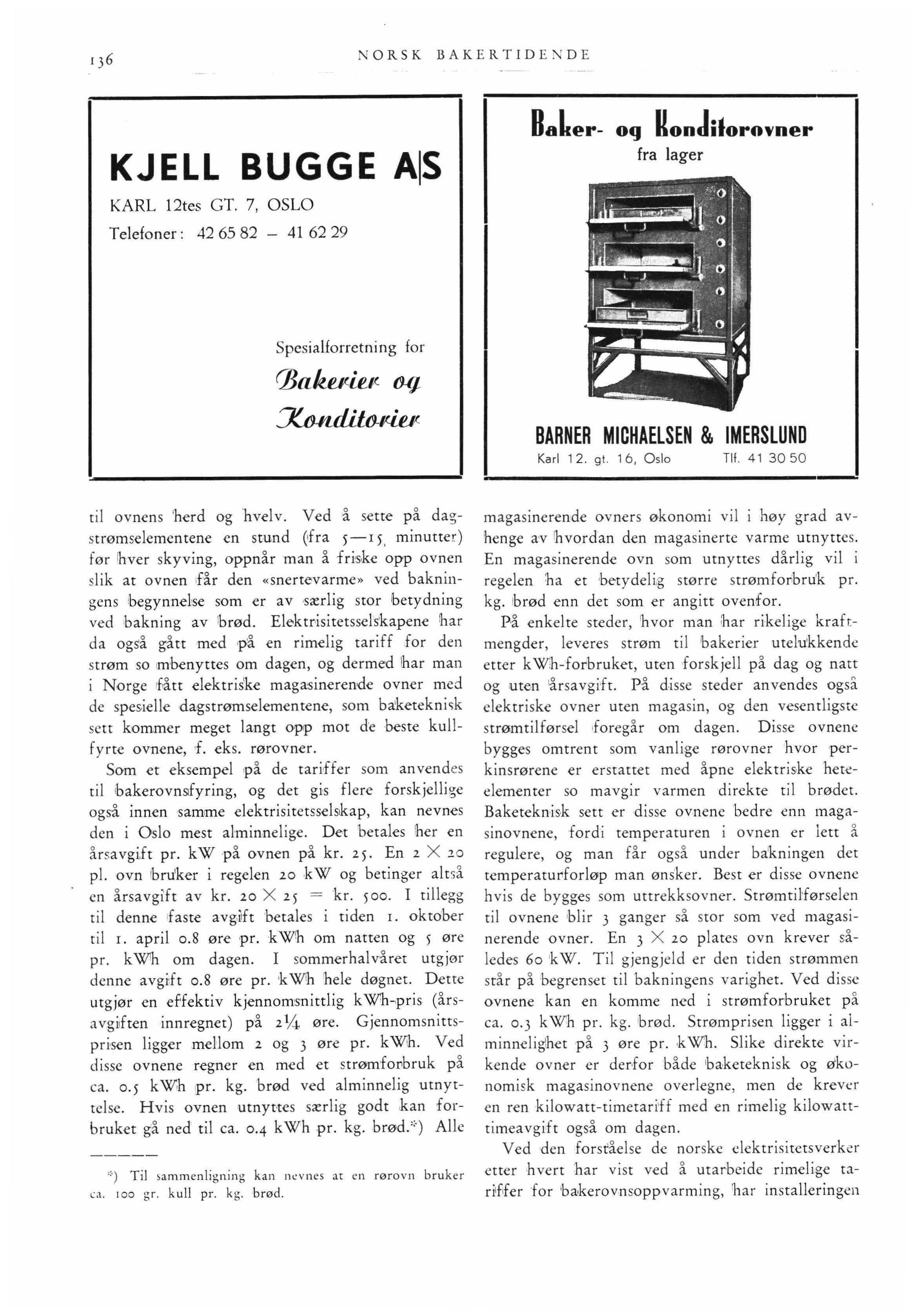 Imidlertid :har en magasinerende ovn visse baketekniske ulemper. Ovnen er som r~gel meget varm om morgenen. Etter )hvert som magasinet tappes for varme synker temperaturen, og stekningsti,den pr. skjøv brød vil stadig lbli lenger. Man er dermed ,ikke 'herre over temperaturen i ovnen og dette vil uvegerlig influere på bakverkets kval itet. Heller ikke temperatJurforløpet under stekningen kan bli særlig gunstig med stort magasin. Den erif aring man gjorde var derfor at man på ovner som utelukkende fikk strøm om natten ikke kunne bake så godt brød ,som 1p1å kull- dler vedfyrte ba'kerovner. Det var derfor atskillige bakere i Norge som i mellomkrigsårene rev ned s,ine clektri-ske bakerovner og bygget rørovner for kull eller oljefyring i stedet.