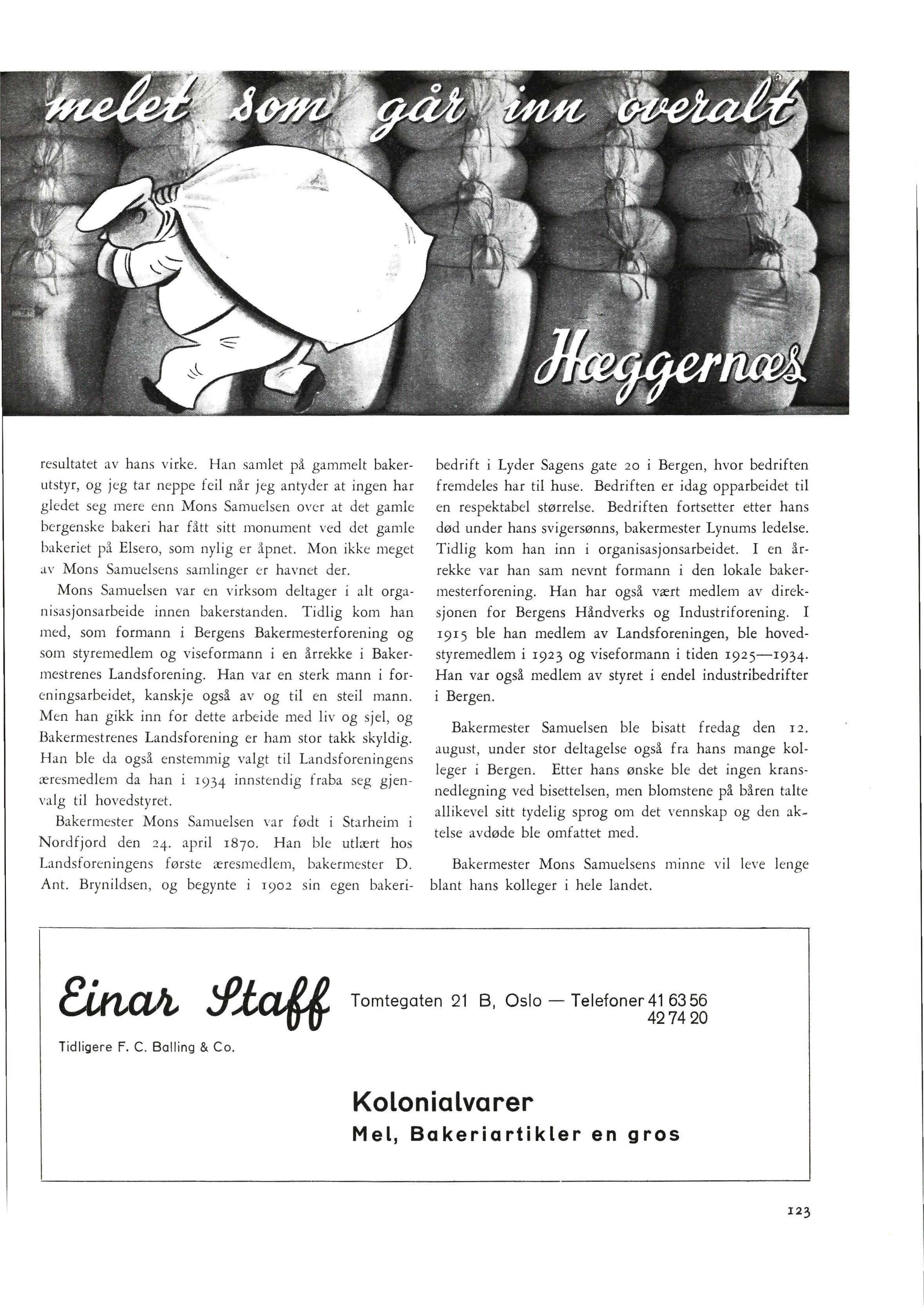 Det blir alltid tomt i kretsen når en god venn faller bort. Og tomrommet blir særlig stort når det gjelder en venn som trutt og uegennyttig har arbeidet for det felles vel. Slik føler vi det nå , etter at budet kom om at Landsforeningens æresmedlem, bakermester Mons Samuelsen, Bergen, er avgått ved døden etter en tids sykelighet den 7. 1ugust iå r. Det var ett av de store trær som falt ved dette dødsfall, en av de mange støtter for bakerstanden i de vanskelige år mellom to verdenskriger. Sant nok, bakermester Samuelsen trakk seg tilbake fra aktivt arbeide i 1934, men han fulgte allikevel arbeidet for bakernes interesser med usvekket energi helt til sin død. Han var den eneste av æresmedlemmene som deltok i sommerens landsmøte, og hans siste samvær med sine kolleger fant sted i vår da Bergensbakerne var samlet for å hilse Landsforeningens nye kontorsjef velkommen Det lå nemlig ikke for bakermester Samuelsen å være passiv. Han hørte til håndverkeren av den gamle skole, som måtte slite fra han var en guttunge, men som opparbeidet seg og skapte en forretning som snart ble en av de større. Men dette var ikke det vesentligste for Samuelsen. For ham gjaldt det også håndverket som sådant. Han holdt det høgt i ære, og viste dets tradisjoner en interesse som dessverre er uvanlig for de fleste bakere idag. Den interessante Bergensfilmen, f. eks. som ble opptatt i 1920 og viste bakerhåndverket i Bergen fra 1860, var for en stor del