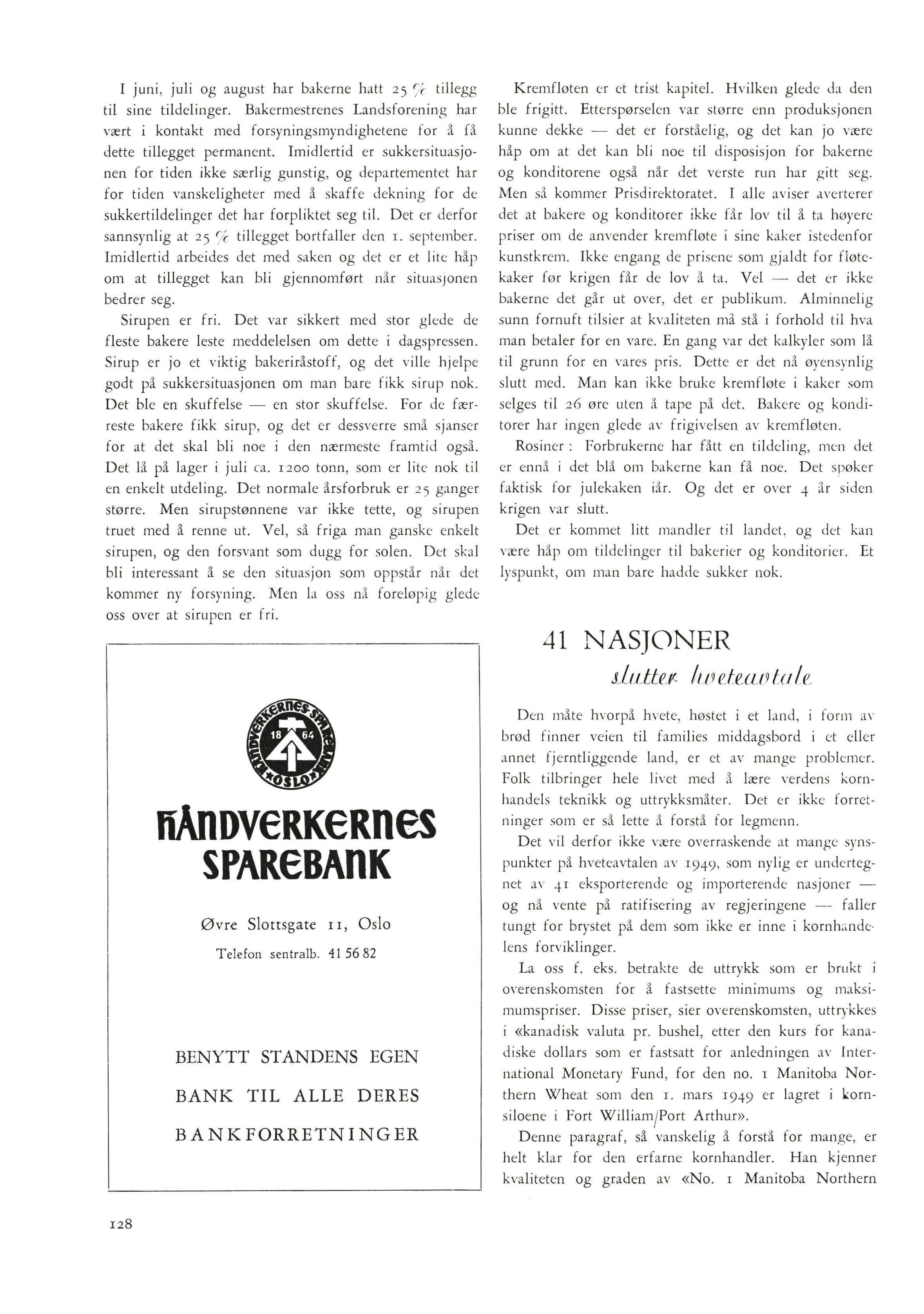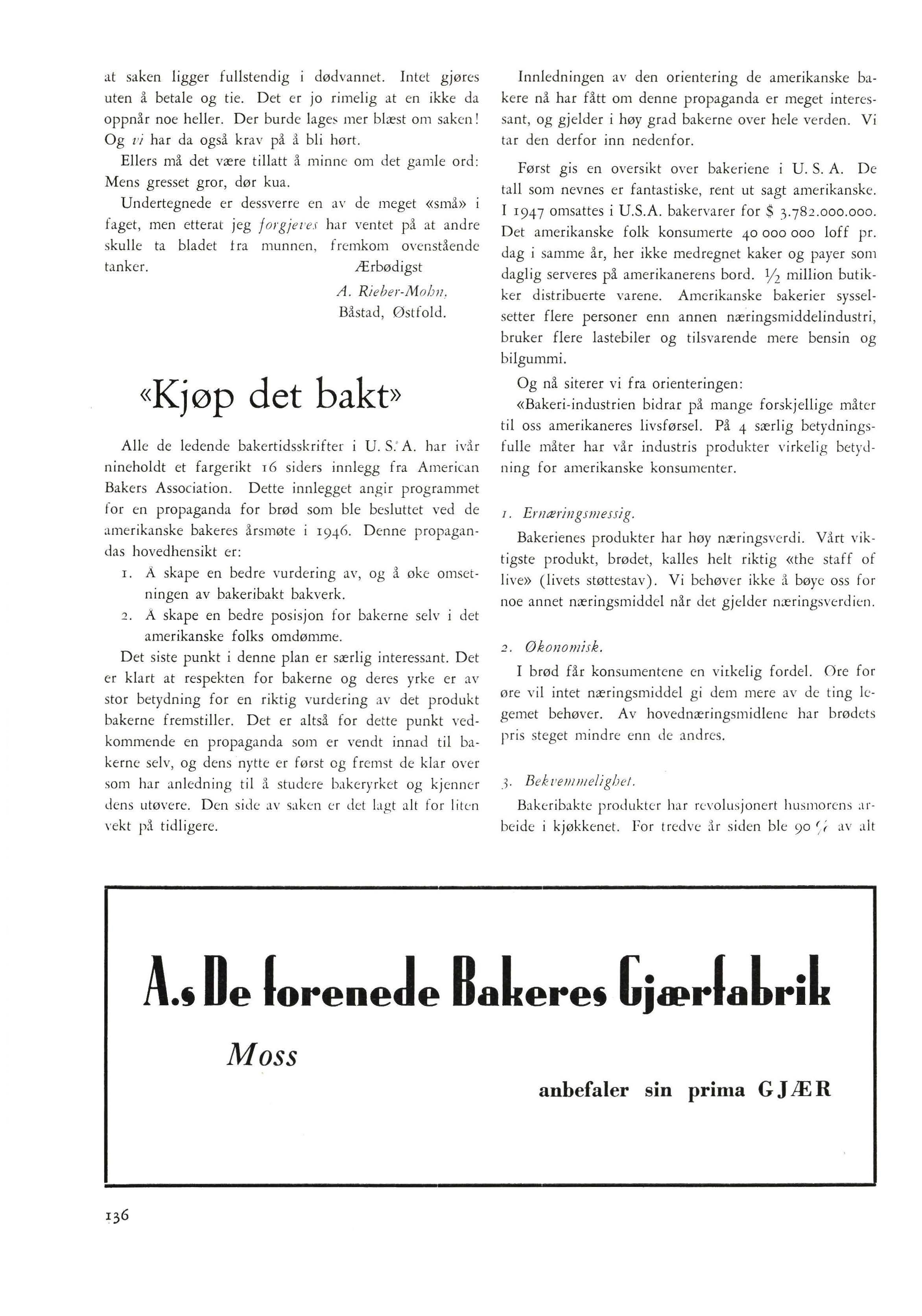 Den Amerikanske bakerorganisasjons plan er nå at alle bakere til reklamefondet skal yte en avgift som svarer til ½o % av en gros salget for hvert av årene 1947, -48 og -49. I 1947 ble planen organisert. I 1948 ble det inntatt store annonser i farger i ledende tidsskrift i U. S. A. For 1949 er det utarbeidet helsides annonser, r for hver måned som skal inn i husmorblad og andre større magasiner. En regner med II4 ooo ooo annonser i strålende farger som skal forsøke å vinne hegemoniet tilbake for brødet.