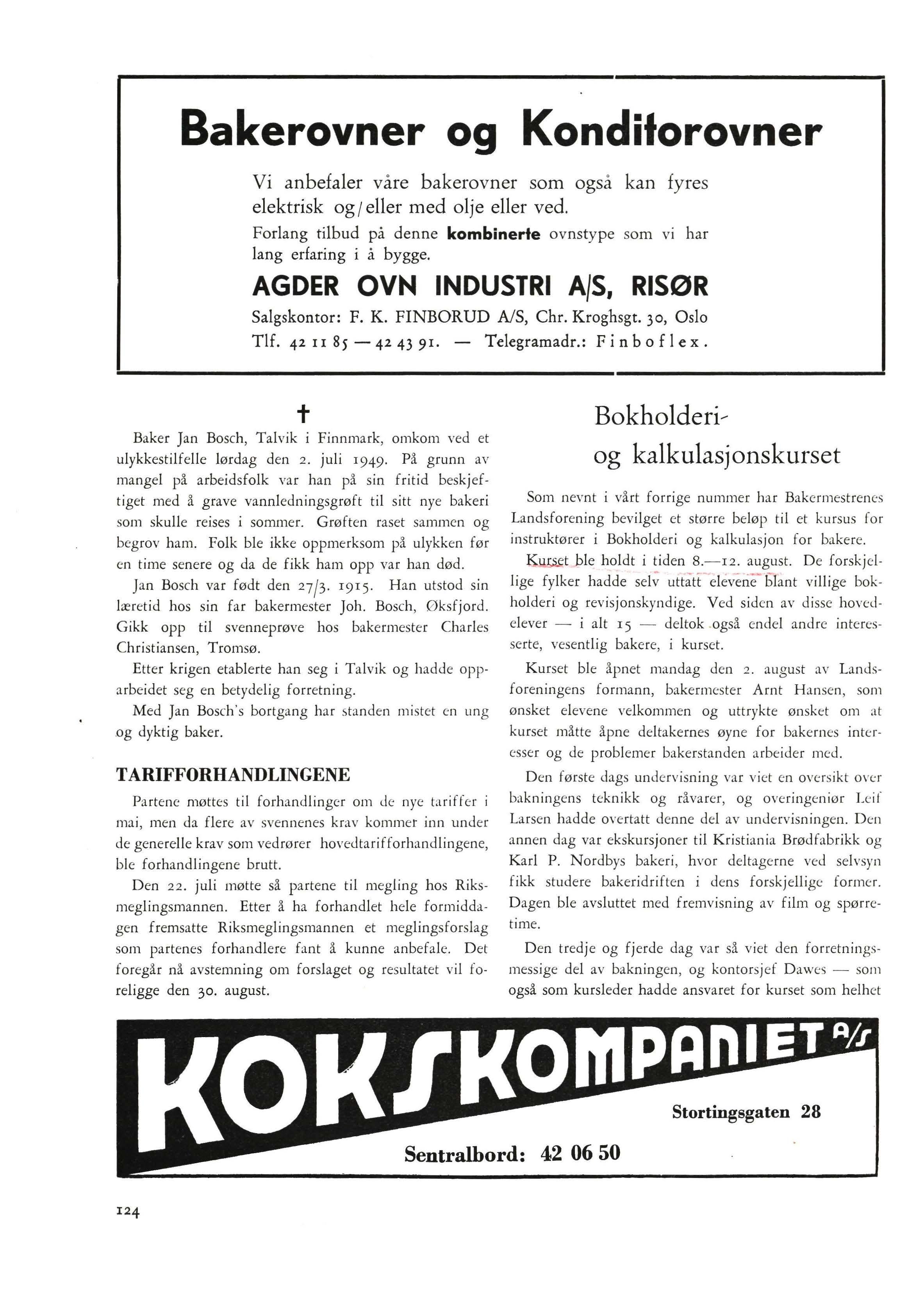 tBaker Jan Bosch, Talvik i Finnmark, omkom ved et ulykkestilfelle lørdag den 2. juli 1949. På grunn av mangel på arbeidsfolk var han på sin fritid beskjeftiget med å grave vannledningsgrøft til sitt nye bakeri som skulle reises i sommer. Grøften raset sammen og begrov ham. Folk ble ikke oppmerksom på ulykken før en time senere og da de fikk ham opp var han død.