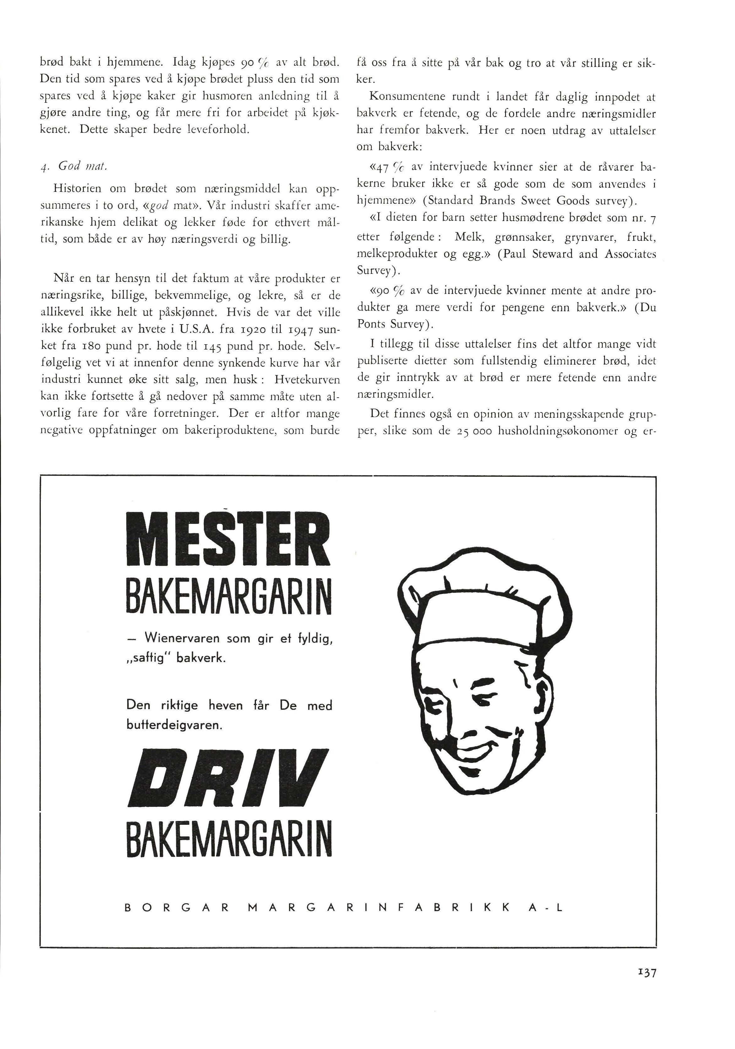 D e t siste punkt i denne plan er særlig interes sa nt. Det er kl art at respekten for bakern e og deres yrke e r av s tor betydning for en riktig v urd e ring av det produkt bakerne fremstiller. D et er altså for d et te punkt vedkommend e en propaganda som er ve ndt innad til bake rn e selv, og den s nytt e er først og fremst d e kl ar over som h a r an lednin g til it studere bakeryrket og kjenner d e ns utøv e re. D e n side av sa ken c:r d et lagt alt for lit e n v e kt p il tidligere.