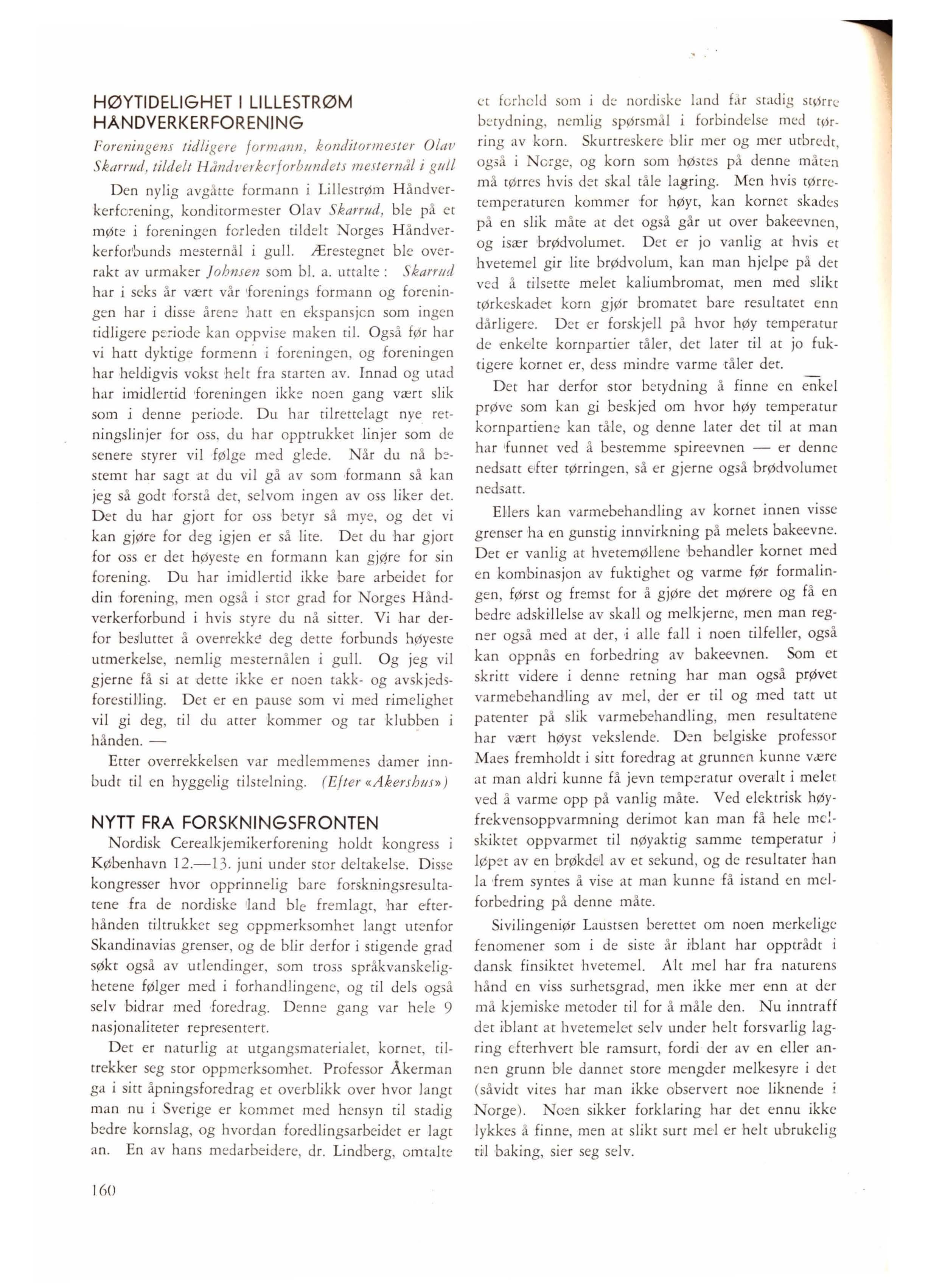 Før s t m å vi renk e p å m eler og d e ts kvalit e t D er e r ikk e u a lmind e li g å h ø r e folk som e r flyerer inn ril bye n e fra l a n dsbygde n , snakke om der br ø der som bl e bakt hjemm e p å gå rden. D e forteller ar d e r ble b akt fo r e n uk e e ll e r fjorten dag e r ad ga n ge n , og d er sist e br ø d et va r lik e godt som d e r første, og holdt seg safti g h e lt til slutt. M a n h ø r er sjelden snakk o m sursmak i sånt brød , e nd a · der mange steder ble brukt å g jemme li rt surdeig fra en bakning •til den nest e. ( Vi minn e r om ar surdeig , brukt p å rette m å re , letter aromadannelse n i br ø d e r ! ) M en m e l e ts eg e nart spilte nok også e n rolle. D e brukte jo m e l a v hj e mmeavlet korn . Der si es ar g r ø nn saker og bær blir mer e aromatiske jo leng er nord d e er dyrk e r, men om d e rre gjelder korn e r ogs å, e r vansk elig å ·ha noen mening om. En annen rin g h a r derimc-r sikkert sin betydning : hos oss er høsten cfre r eg nfull , og d er kan være vanskelig å berg e k o rn e r ur e n groningsskade. Slikt råberger korn ( som vi 1fikk m er e nn n ok av under krigen ) er bakerne , sk r ekk , ford i d er kan gi helt deiger og sammenfalt br ø d , hvis skaden er stor. M e n en liten grad av spiring i k o rner m erkes ikk e s å lett p å ,bakeevnen , særli g ikk e hvis d e r brukes surdeig. Virkning e n ytr e r seg m es t de ri a r der under srekningen omdann e s no e me r e nn van li g a v stivels e n ril deksrriner og s ukker. D ene gir for d e r fø rst e e n liten sørsmak , og gjør og,å brøder saftig e r e. M o n vi ikke her skulle ha endel av g runn e n e ril ar der gamle hj e mmebakte brød står så hØyt i ry I denne forbindelse ligg e r d et nær å n ev n e n oe n dan~k e e 1ifaringe r, som tyde r p å ar e n lire n surs m ak i br ø der kan bli helt ove rd e kker hvis d e r sam-