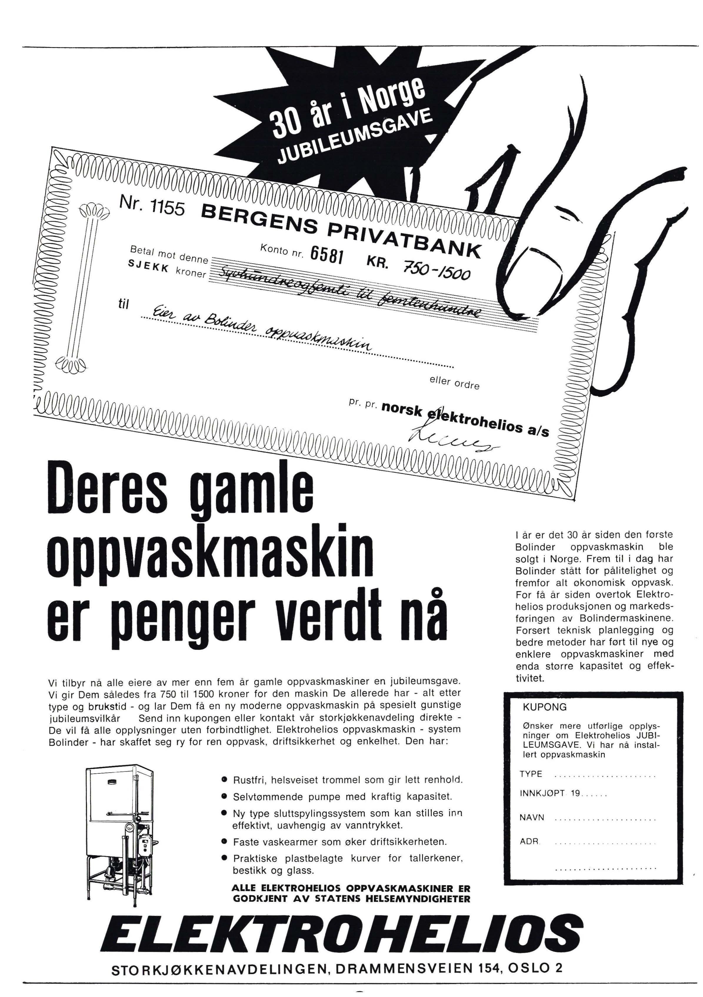 Vi gir Dem således fra 750 til 1500 kroner for den maskin De allerede har - alt etter type og brukstid - og lar Dem få en ny moderne oppvaskmaskin p å spesielt gunstige jubileumsvilkår Send inn kupongen eller kontakt vår storkjøkkenavdeling direkteDe vil få alle opplysninger uten forbindtlighet. Elektrohelios oppvaskmaskin - system Bolinder - har skaffet seg ry for ren oppvask , driftsikkerhet og enkelhet. Den har :