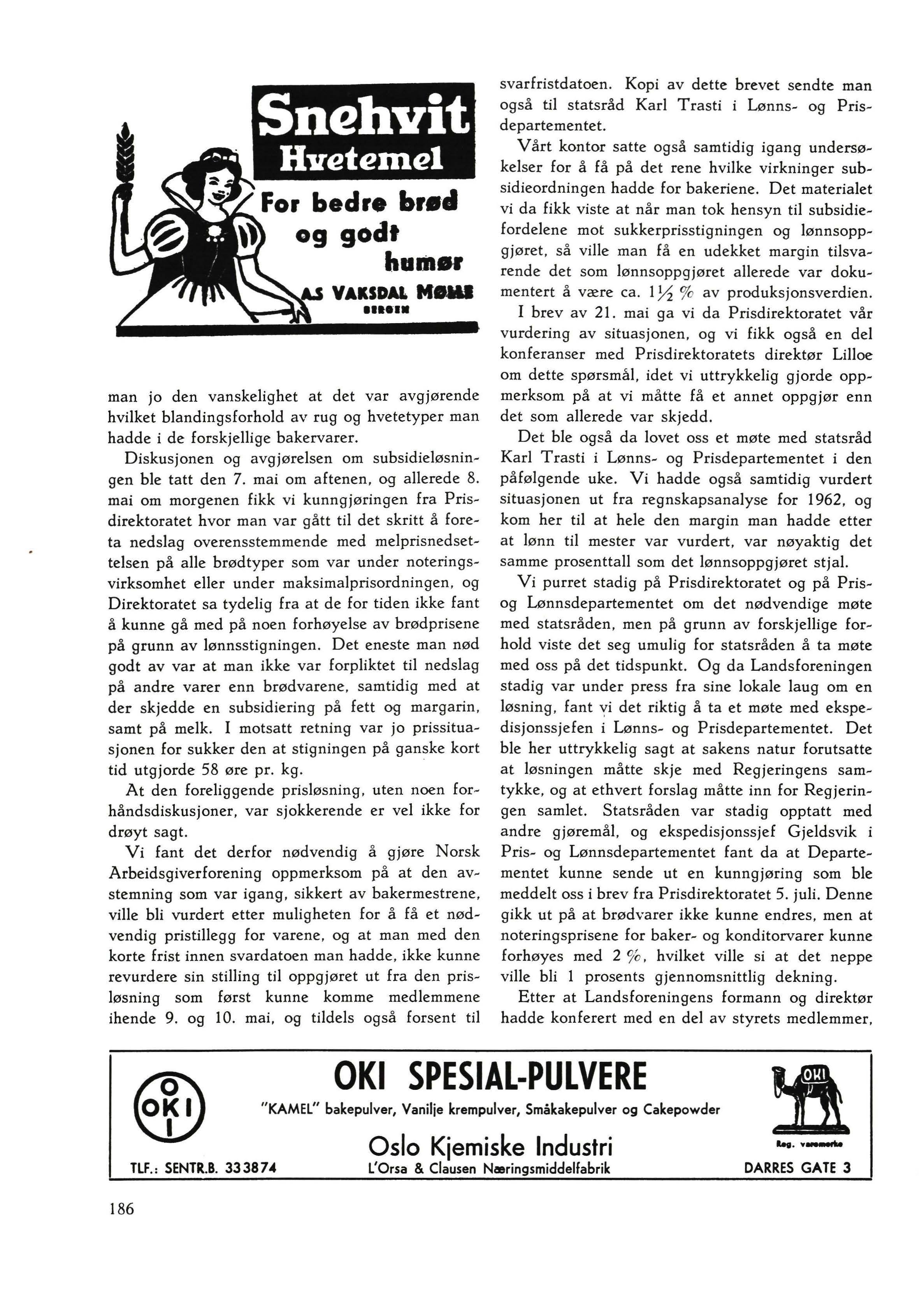 Diskusjonen og avgjørelsen om subsidieløsningen ble tatt den 7. mai om aftenen, og allerede 8. mai om morgenen fikk vi kunngjøringen fra Prisdirektoratet hvor man var gått til det skritt å foreta nedslag overensstemmende med melprisnedsettelsen på alle brødtyper som var under noteringsvirksomhet eller under maksimalprisordningen, og Direktoratet sa tydelig fra at de for tiden ikke fant å kunne gå med på noen forhøyelse av brødprisene på grunn av lønnsstigningen Det eneste man nød godt av var at man ikke var forpliktet til nedslag på andre varer enn brødvarene, samtidig med at der skjedde en subsidiering på fett og margarin, samt på melk. I motsatt retning var jo prissituasjonen for sukker den at stigningen på ganske kort tid utgjorde 58 øre pr. kg.