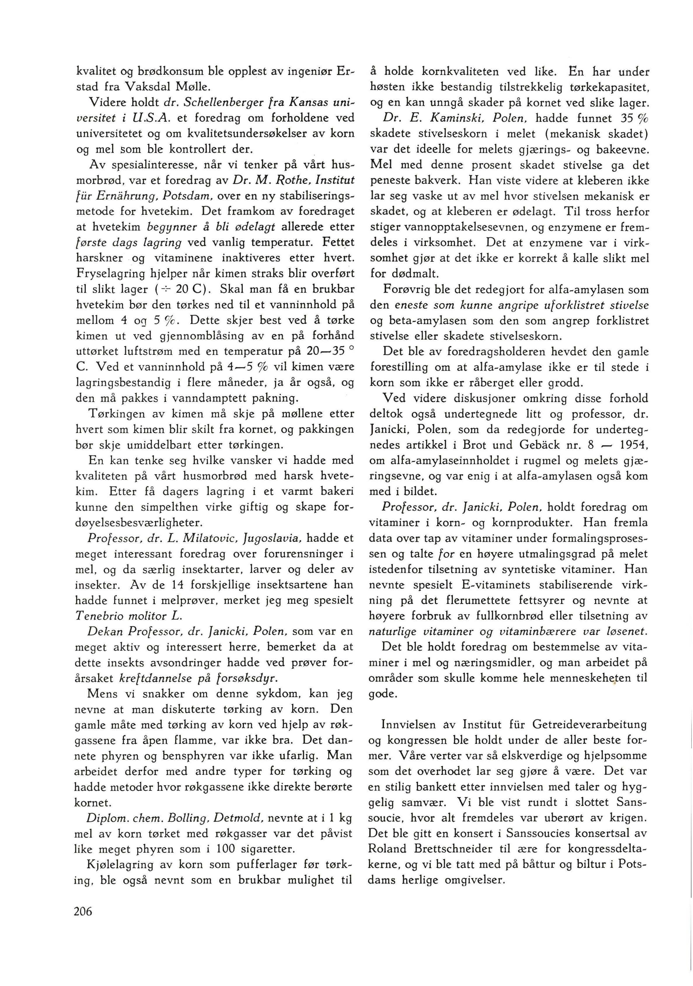 Ved videre diskusjoner omkring disse forhold deltok også undertegnede litt og professor, dr. Janicki, Polen, som da redegjorde for undertegnedes artikkel i Brot und Geback nr. 8 - 1954, om alfa-amylaseinnholdet i rugmel og melets gjæringsevne, og var enig i at alfa-amylasen også kom med i bildet.