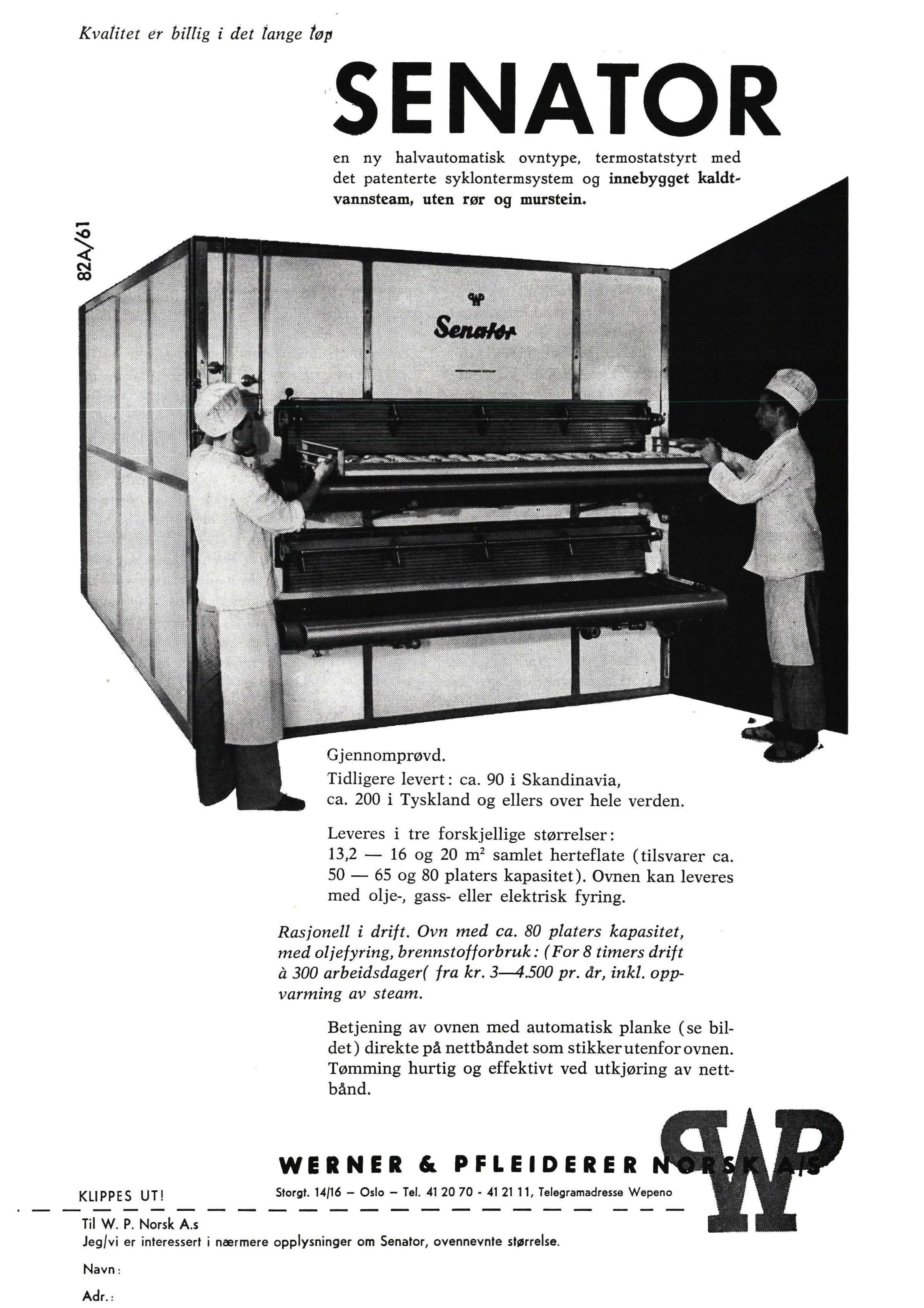 Tunnelovner og raskebaner i alle vanlige størrelser. «Automatic» med nettbånd som ruller varene inn og ut, eller gjennomgående. Flere størrelser, 2 eller 3 herter. Etasjeovner, baker- og konditorovner, med faste herter eller uttrekksherter. For automatiske skyvebrett eller stake. Direktevirkende eller magasinerende. For elektrisitet eller oljefyring.