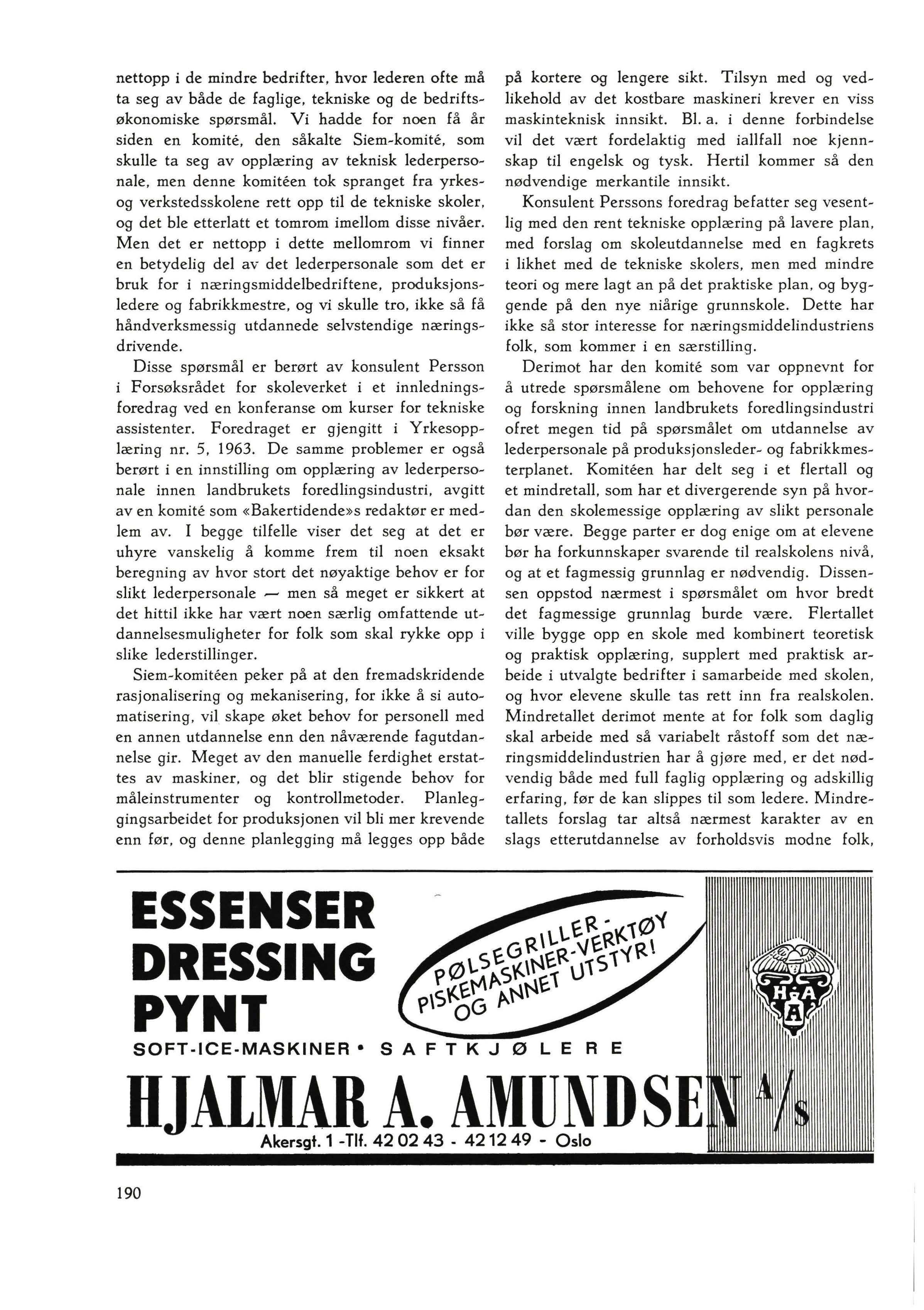 Disse spørsmål er berørt av konsulent Persson i Forsøksrådet for skoleverket i et innledningsforedrag ved en konferanse om kurser for tekniske assistenter Foredraget er gjengitt i Yrkesopplæring nr. 5, 1963 De samme problemer er også berørt i en innstilling om opplæring av lederpersonale innen landbrukets foredlingsindustri , avgitt av en komite som « Bakertidende»s redaktør er medlem av . I begge tilfelle viser det seg at det er uhyre vanskelig å komme frem til noen eksakt beregning av hvor stort det nøyaktige behov er for slikt lederpersonale ,...., men så meget er sikkert at det hittil ikke har vært noen særlig omfattende utdannelsesmuligheter for folk som skal rykke opp i slike lederstillinger.