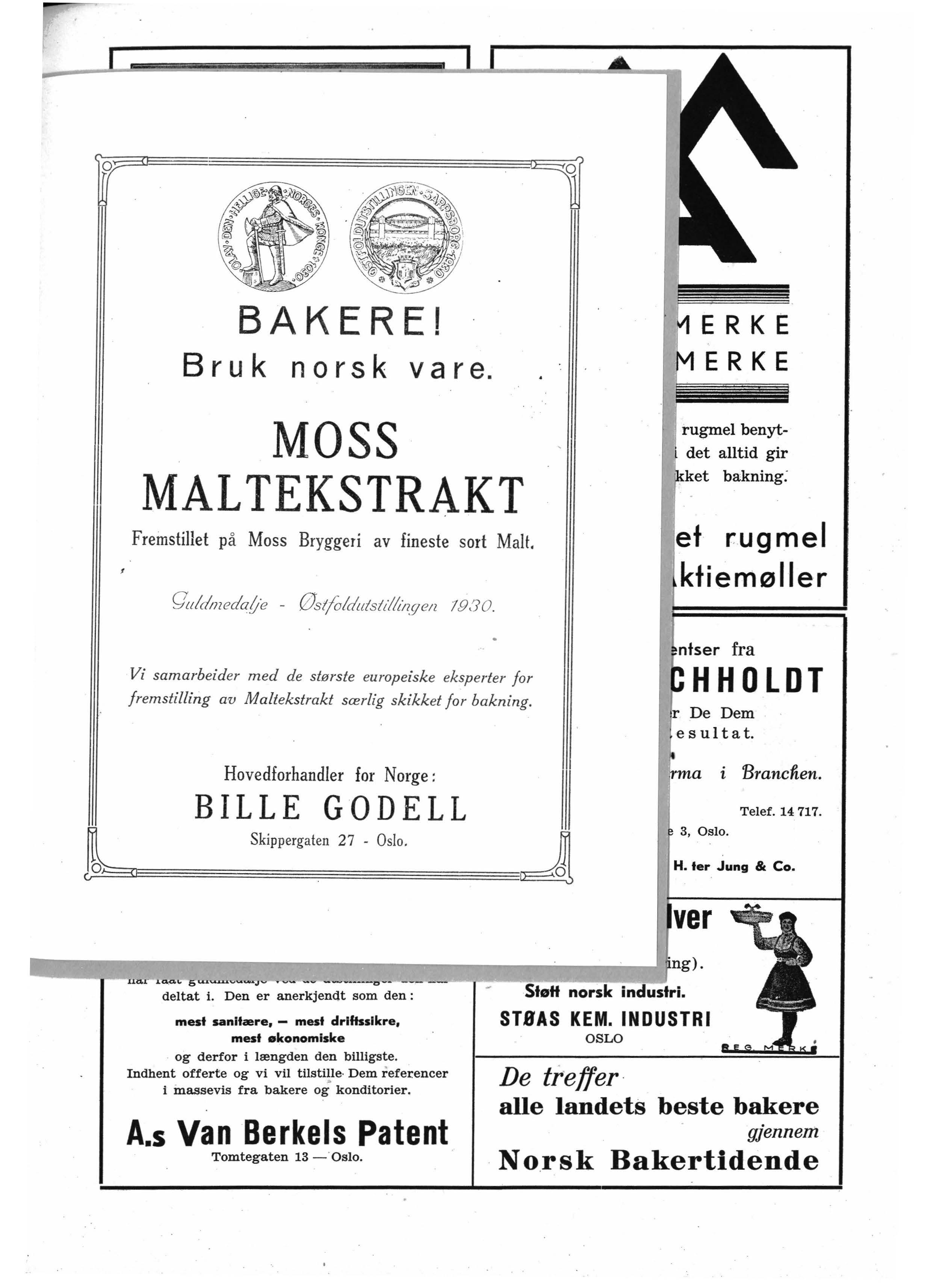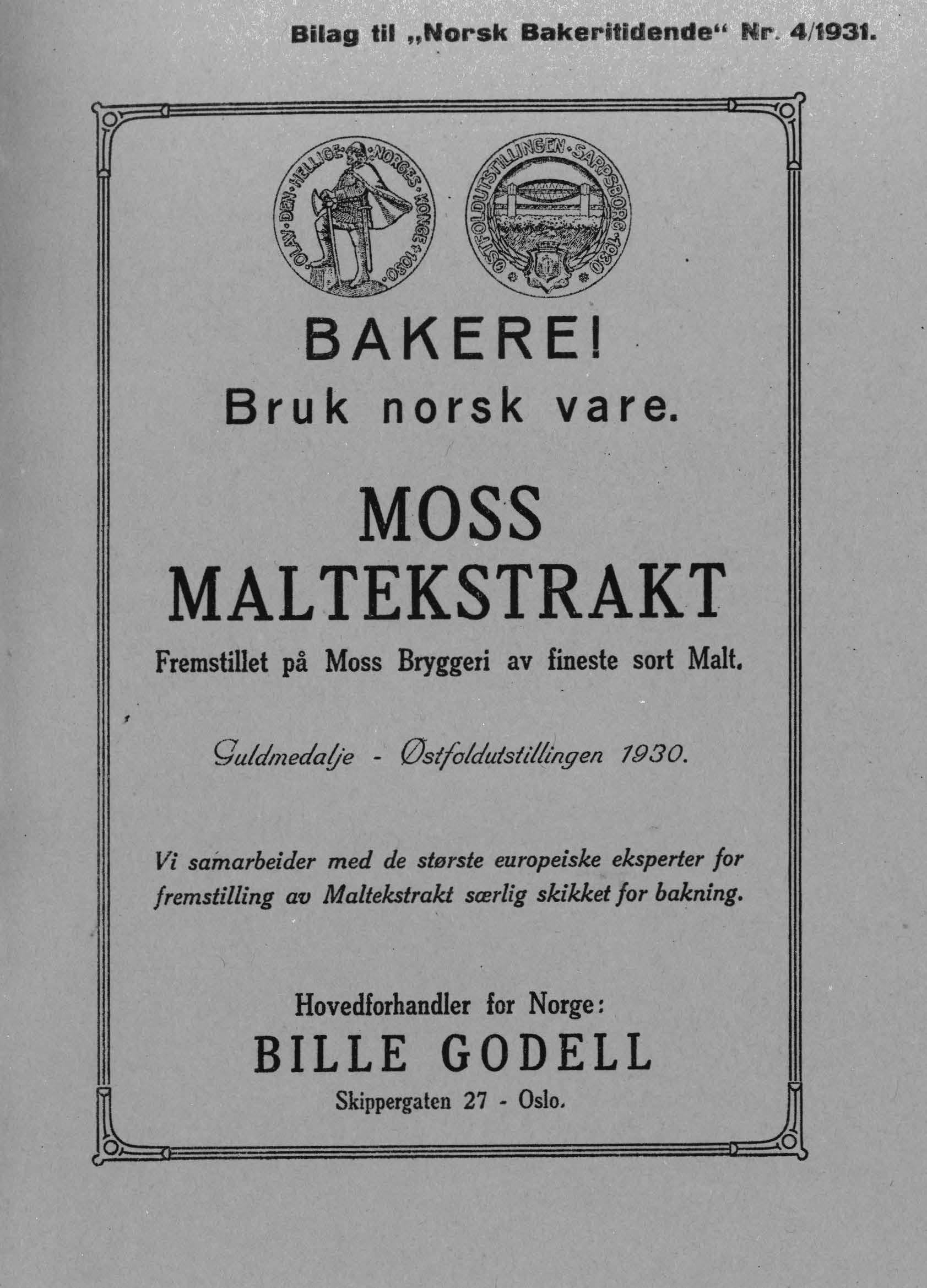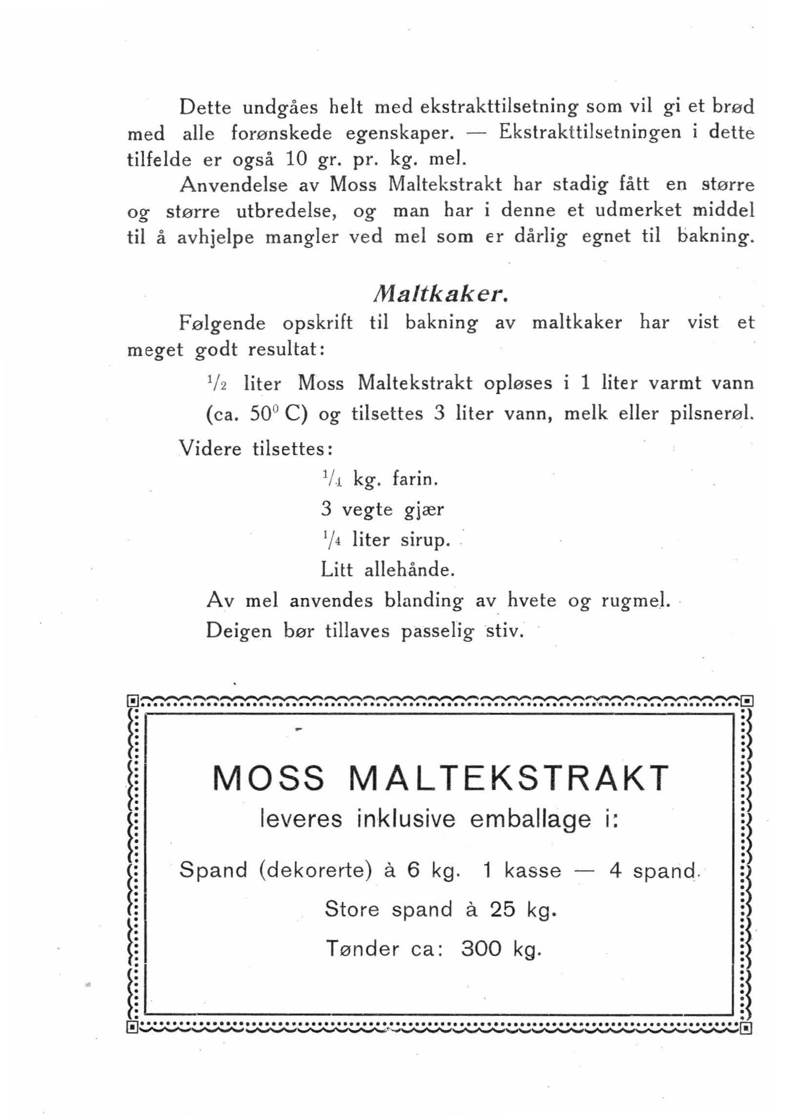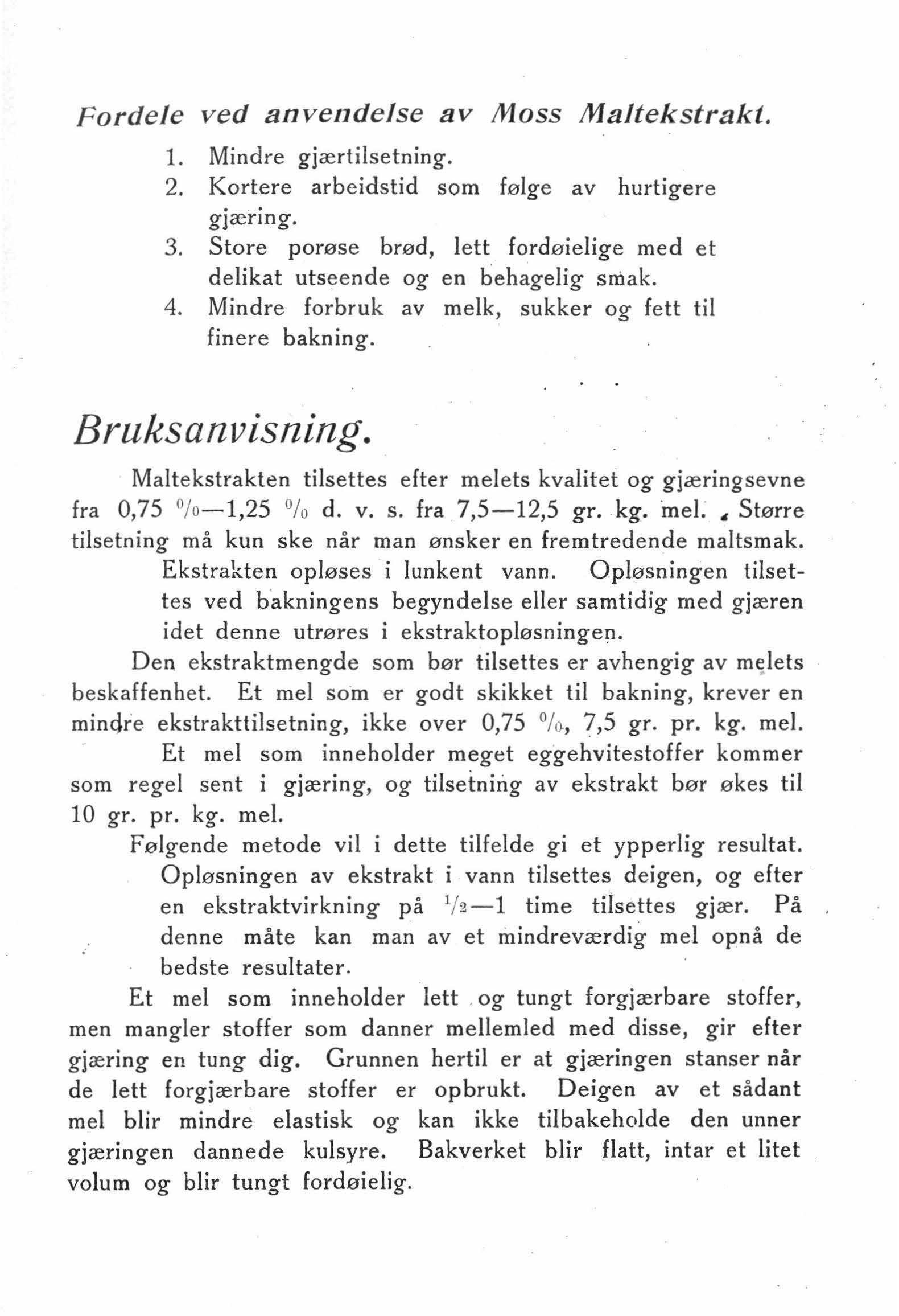 Anvendelse av Moss Maltekstrakt har stadig fått en større og større utbredelse, og man har i denne et udmerket middel til å avhjelpe mangler ved mel som er dårlig egnet til bakning .