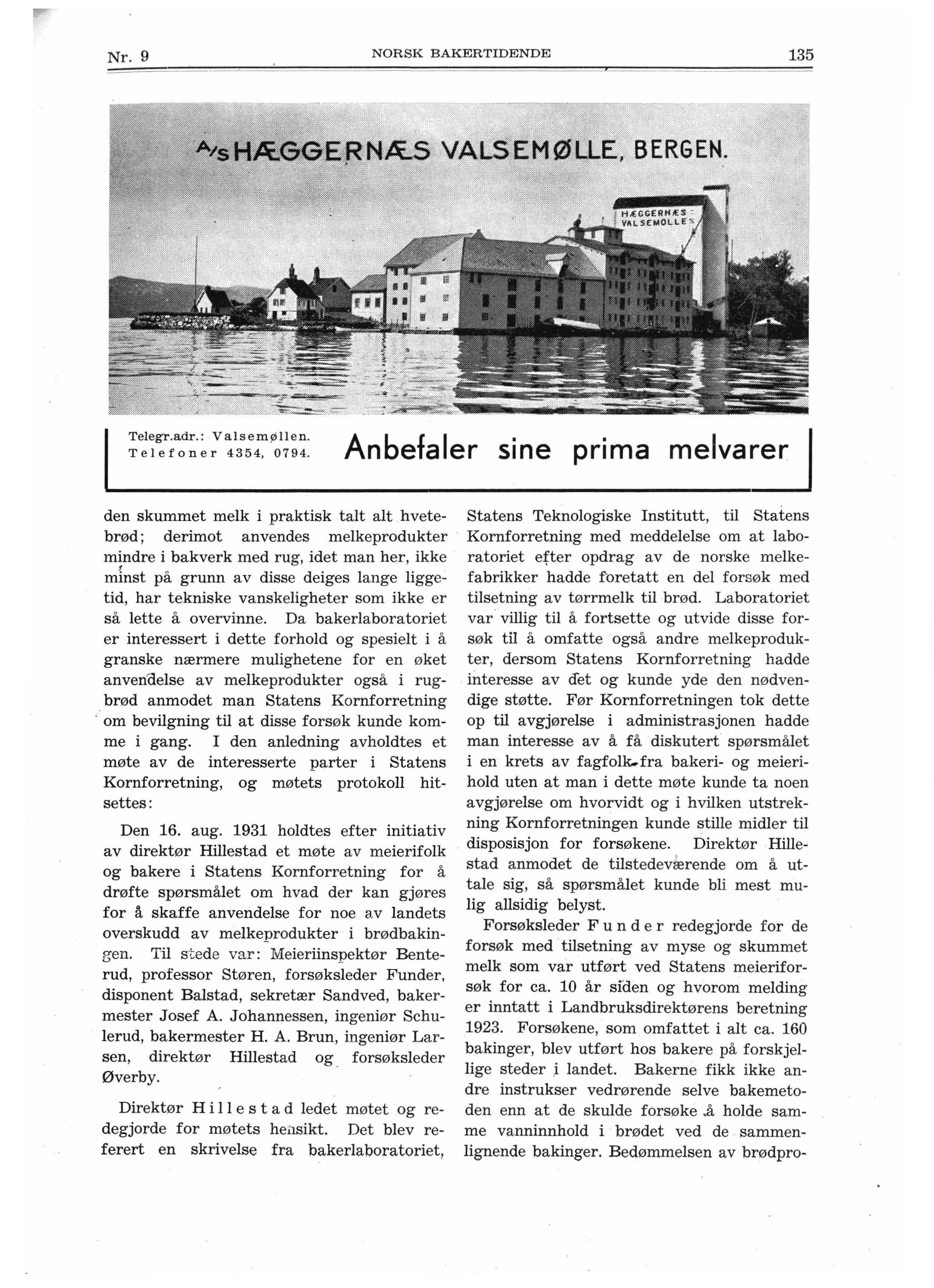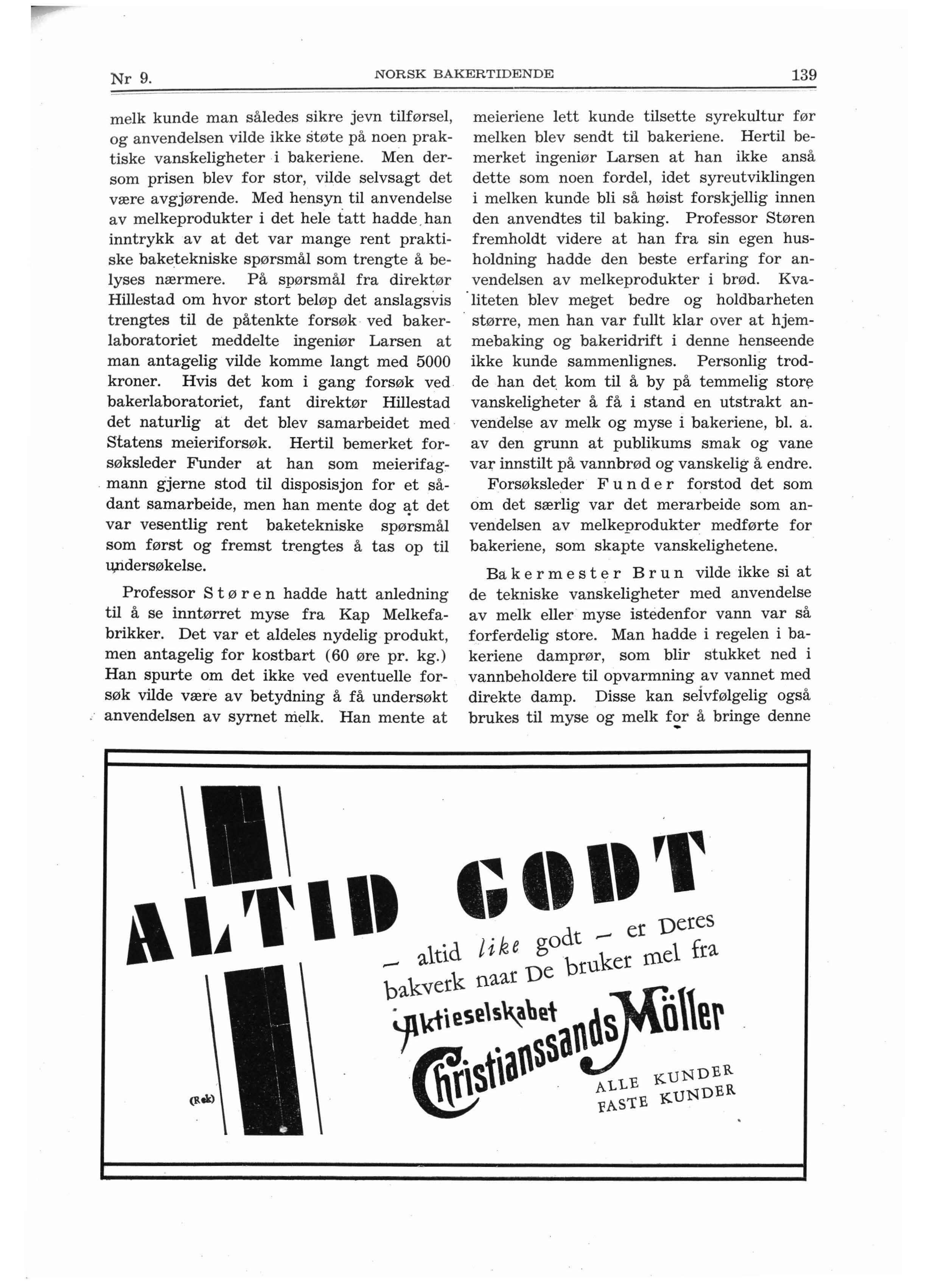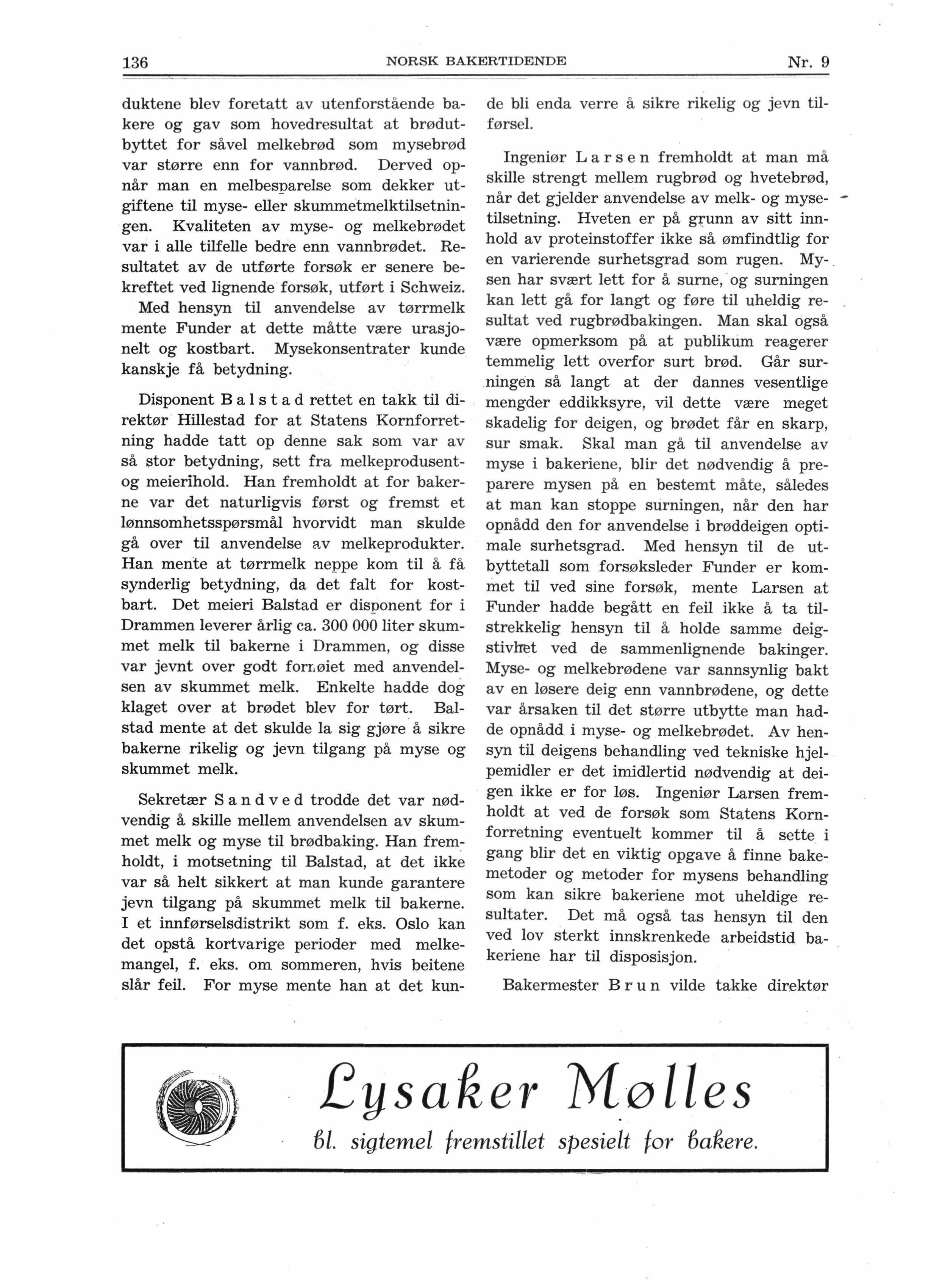 m eie ri ene l ett kunde tils ette syrekultur før melken blev sendt til b a keri ene. Hertil b emerk et ingeniør Lars e n at han ikke anså dette som noen ford e l, idet syreutviklingen i melken kunde bli så høist forskjellig innen den anvendtes til baking. Professor St ø ren fremholdt videre at han fra sin egen husholdning hadde d e n beste erfaring for anvendelsen av melkeprodukter i br ød . Kvaliteten blev meget bedre og holdbarheten · større, men han var fullt klar over at hjemmebaking og bakeridrift i denne henseende ikke kunde sammenlignes. Personlig trodde han det kom til å by på temmelig stor~ vanskeligheter å få i stand en utstrakt anvendelse av melk og myse i bakeriene, bl. a. av den grunn at publikums smak og vane var innstilt på vannbrød og vanskelig å endre . Forsøksleder F u n d e r forstod det som om det særlig var det merarbeide som anvendelsen av melkeprodukter medførte for bakeriene , som skapte vanskelighetene.