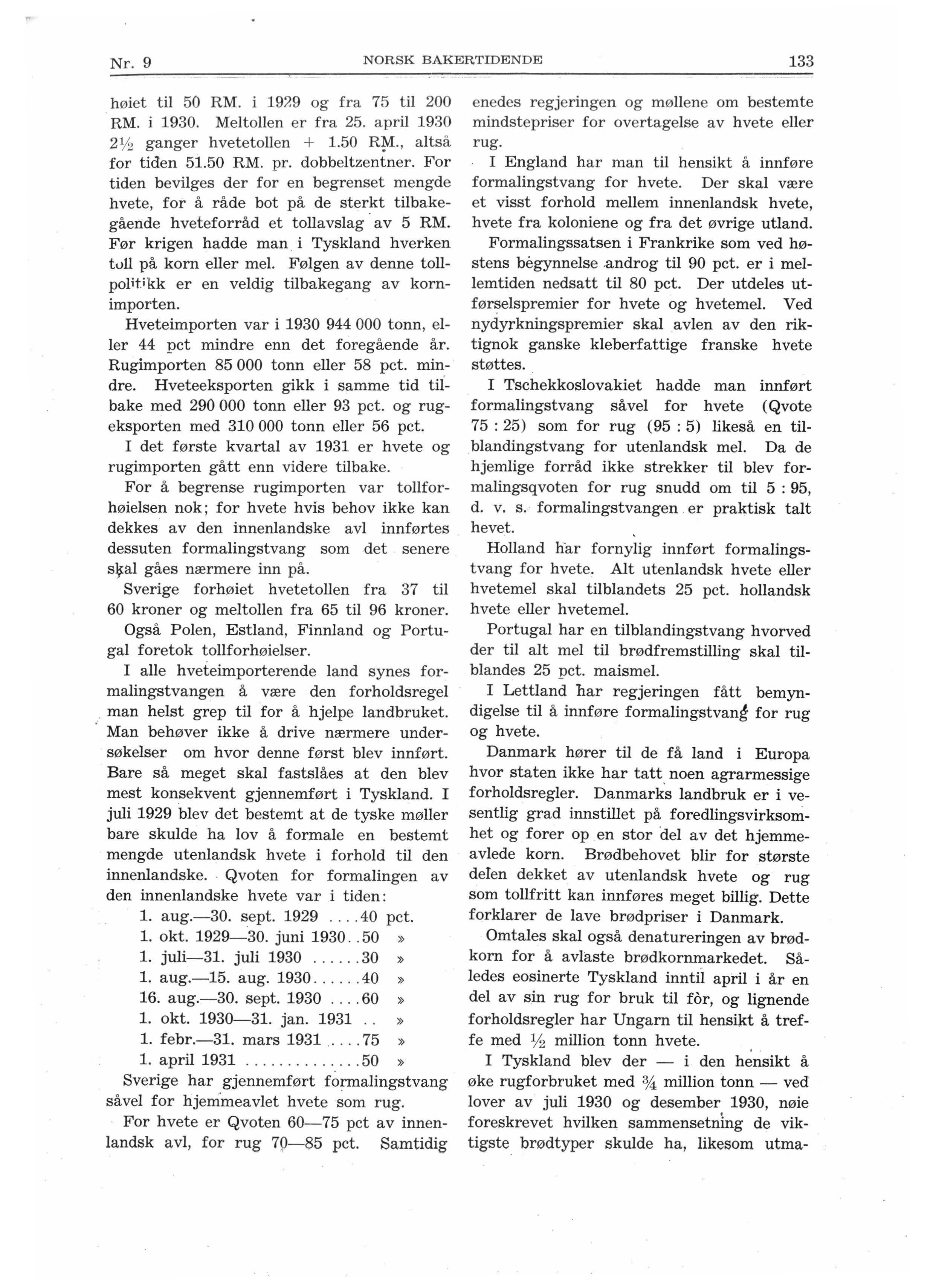 len. Der blev foretatt forsøk på ad frivillig vei å øke efterspørselen også fra bakerhåndver,kets side, således f. eks. i Tyskland i årene 1929-1930 og inntil idag. Der opnåddes også gode resultater. I Tyskland f. eks. har landbruket særlig interesse av å få øket avsetningen av rugen, av hvilken der var stort overskudd forhånden på bekostning av hveten hvorav en betydelig del må innfries fra utlandet. I forskjellige egne hvor rugbrød bare i liten grad var anvent, f. eks. i SydTyskland, lykkedes det å øke rugbrødforbruket i vesentlig grad. ·I andre egne hvor man var vant til et blandingsbrød av rug og hvete blev hvetemelstilsetningen nedsatt. Dessverre blev disse bestrebelser ikke konsekvent gjennemført og landbruket ydet ikke den nødvendige støtte. Landbruket trodde at de så meget lettere vilde nå sitt mål ved å øke efterspørselen ved hjelp av lovgivningen. I krigstidens nød blev der naturligvis forsøkt å avhjelpe levnetsmiddelsforsørgningen ved inngripende bestemmelser. Siden har det vært vanskelig å holde staten borte fra en umiddelbar inngripen på dette område. Man var nemlig ennu fylt av de tanker at staten skulde kunne forhindre enhver friksjon. Dertil kommer at de sosialistiske ideer i mange retninger i næsten alle iand får en stadig voksende betydning. Det er eiendommelig at landbruket som naturlig nok har satt sig mot enhver sosialisering av sine produksjonsmidler er det som av hensyn til landbrukskrisen roper mest på hjelp fra staten. De av regjeringene mest inngripende foranstaltninger er, på grunn av statsforholdene, foretatt i Russland og Italia.