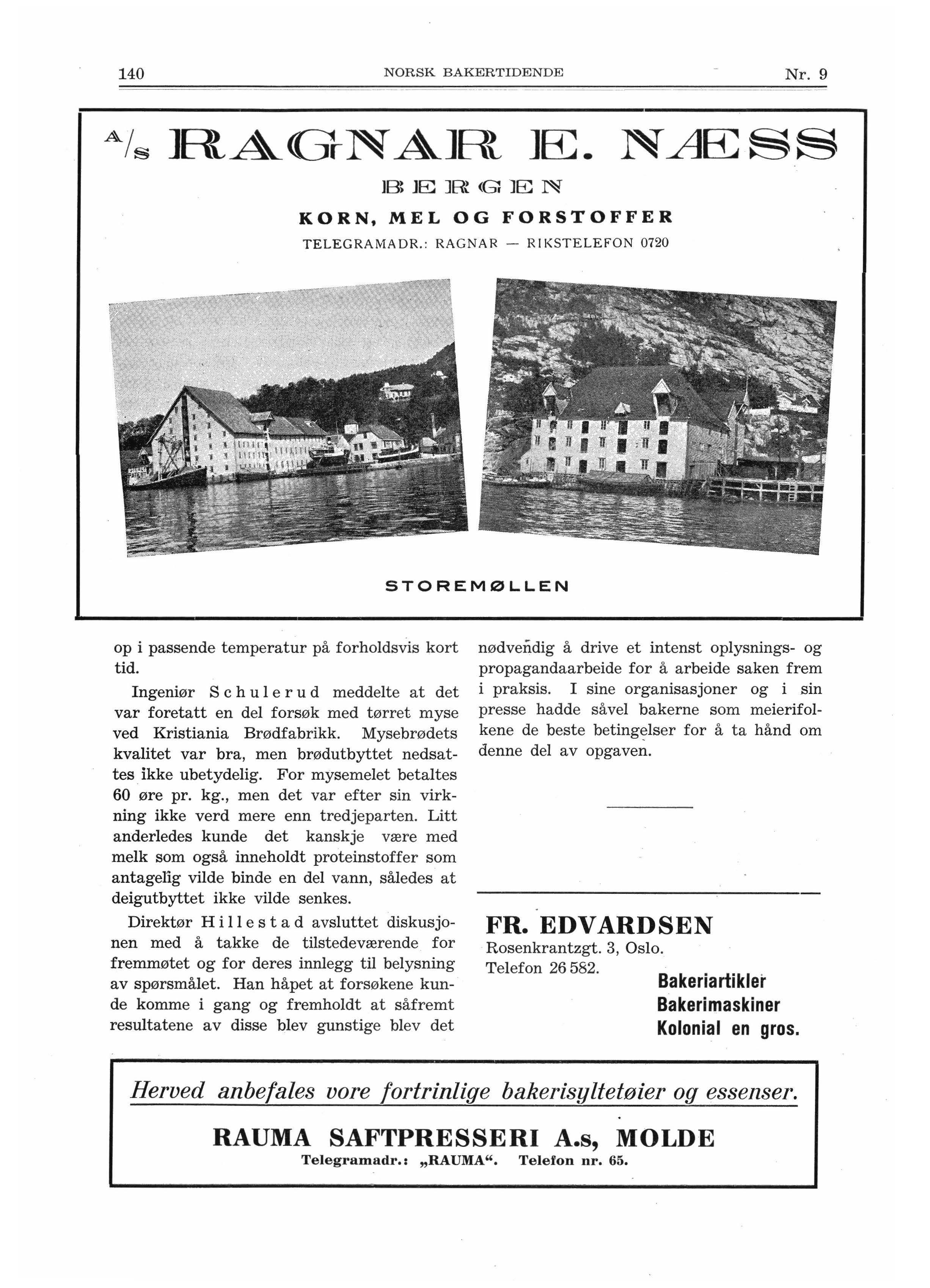 Ingeniør S c h u I e r u d meddelte at det var foretatt en del forsøk med tørret myse ved Kristiania Brødfabrikk. Mysebrødets kvalitet var bra , men brødutbyttet nedsattes ikke ubetydelig. For mysemelet betaltes 60 øre pr. kg., men det var efter sin virkning ikke verd mere enn tredjeparten. Litt anderledes kunde det kanskje være med melk som også inneholdt proteinstoffer som antagelig vilde binde en del vann, således at deigutbyttet ikke vilde senkes.