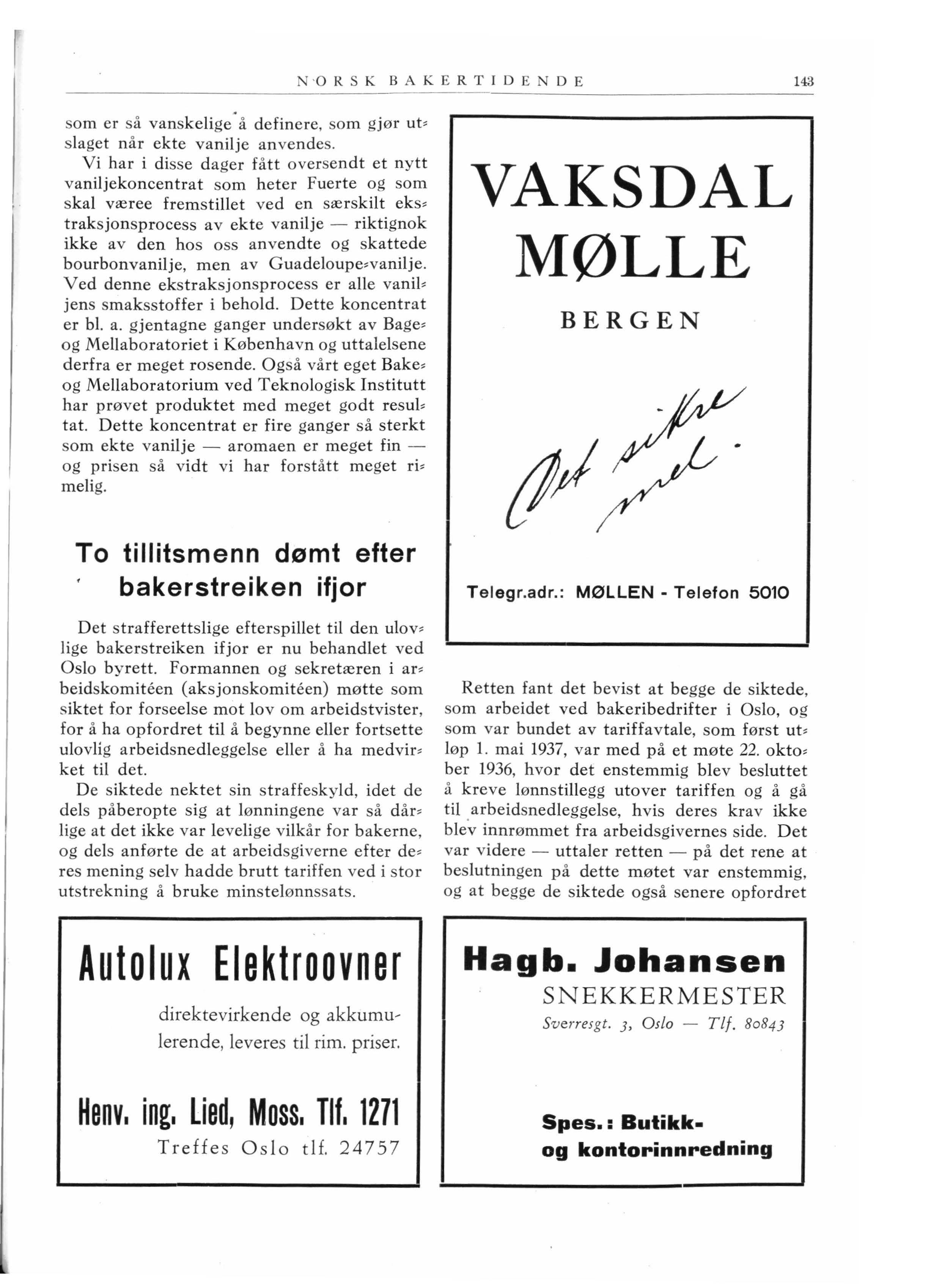 Vi har i disse dager fått oversendt et nytt vaniljekoncentrat som heter Fuerte og som skal væree fremstillet ved en særskilt eks, traksjonsprocess av ekte vanilje - riktignok ikke av den hos oss anvendte og skattede bourbonvanilje, men av Guadeloupe•vanilje. Ved denne ekstraksjonsprocess er alle vanil• jens smaksstoffer i behold. Dette koncentrat er bl. a. gjentagne ganger undersøkt av Bage• og Mellaboratoriet i København og uttalelsene derfra er meget rosende. Også vårt eget Bake, og Mellaboratori u m ved Teknologisk Institutt har prøvet produktet med meget godt resub tat Dette koncentrat er fire ganger så sterkt som ekte vanilje - aromaen er meget finog prisen så vidt vi har forstått meget ri• melig .