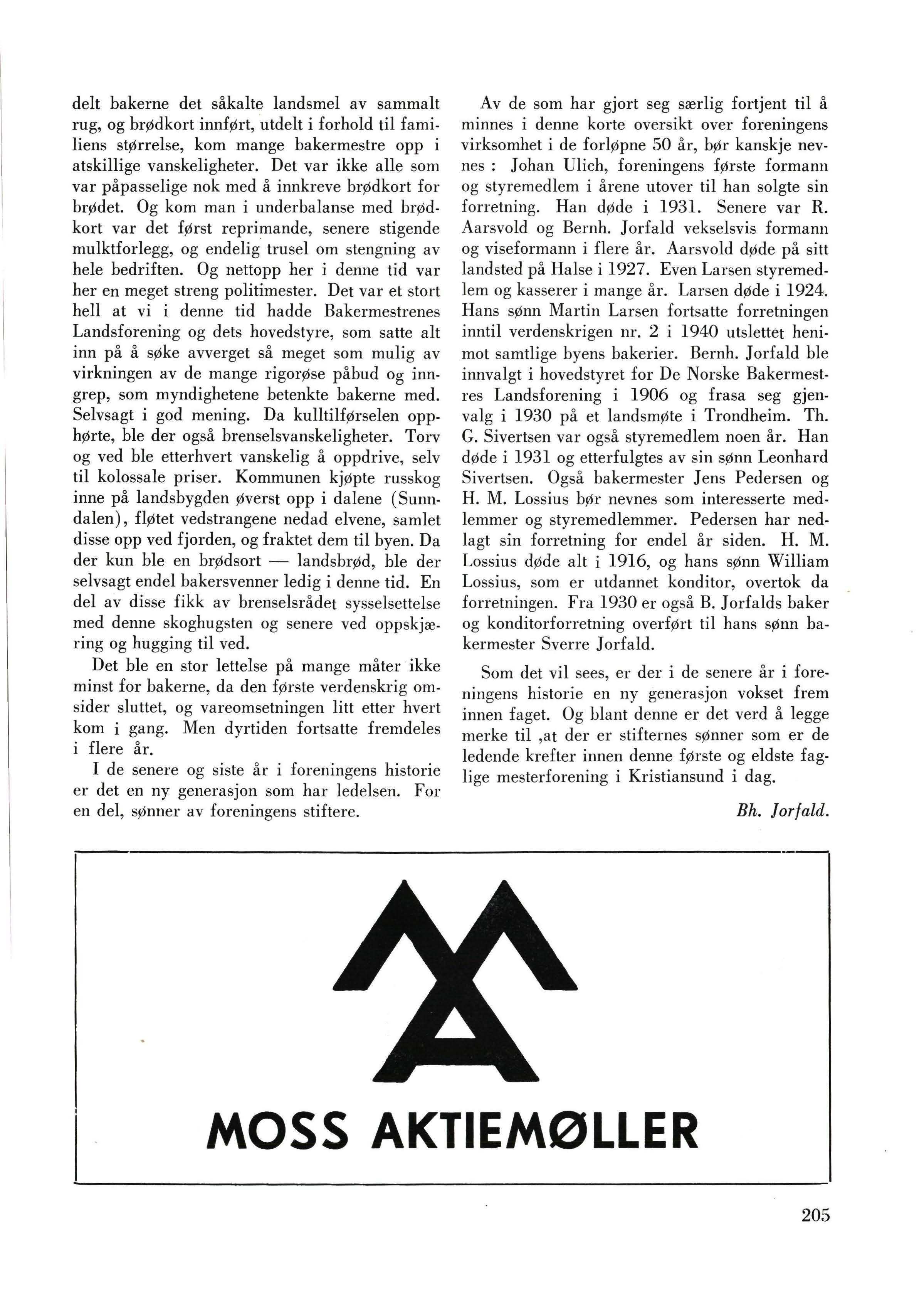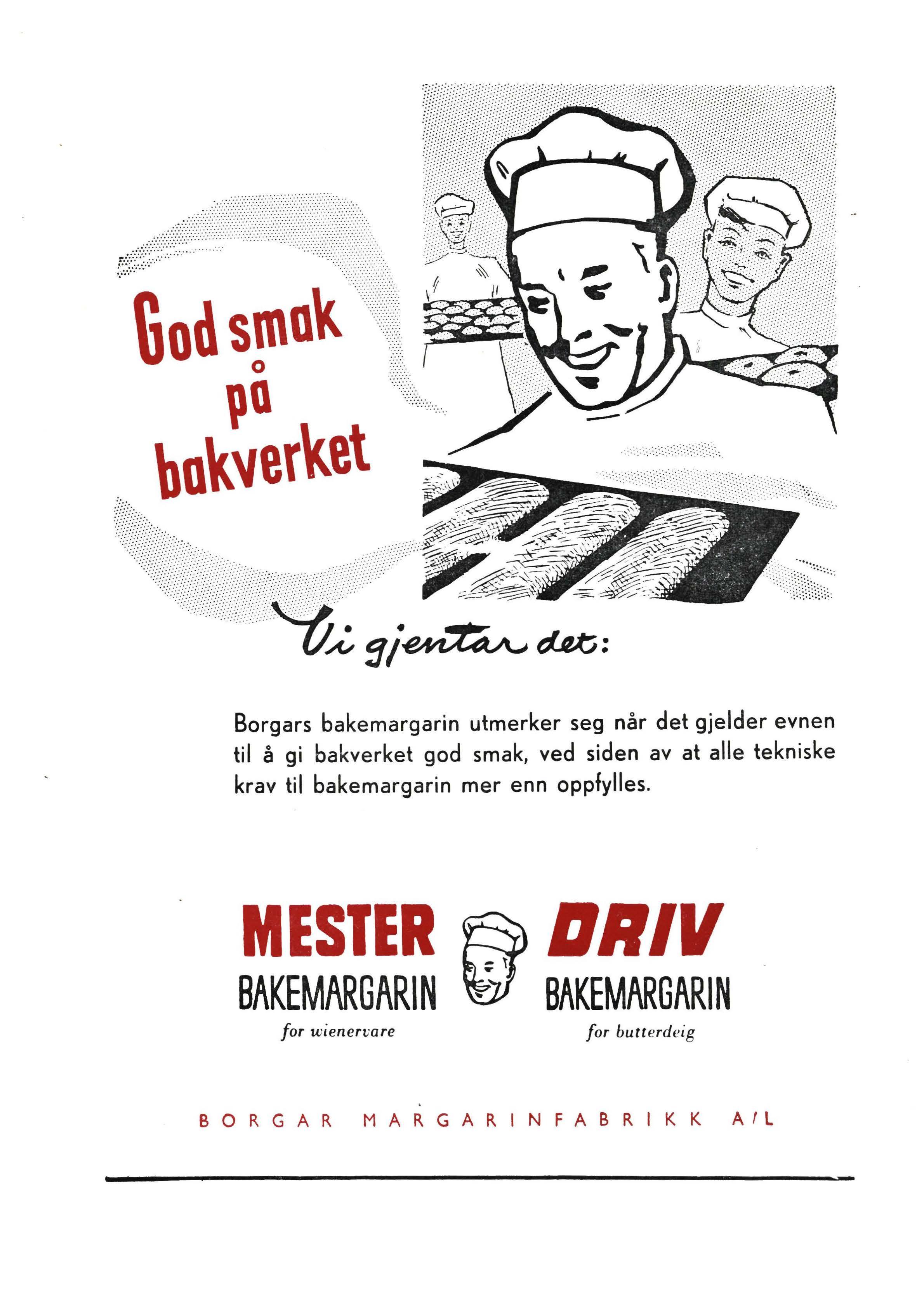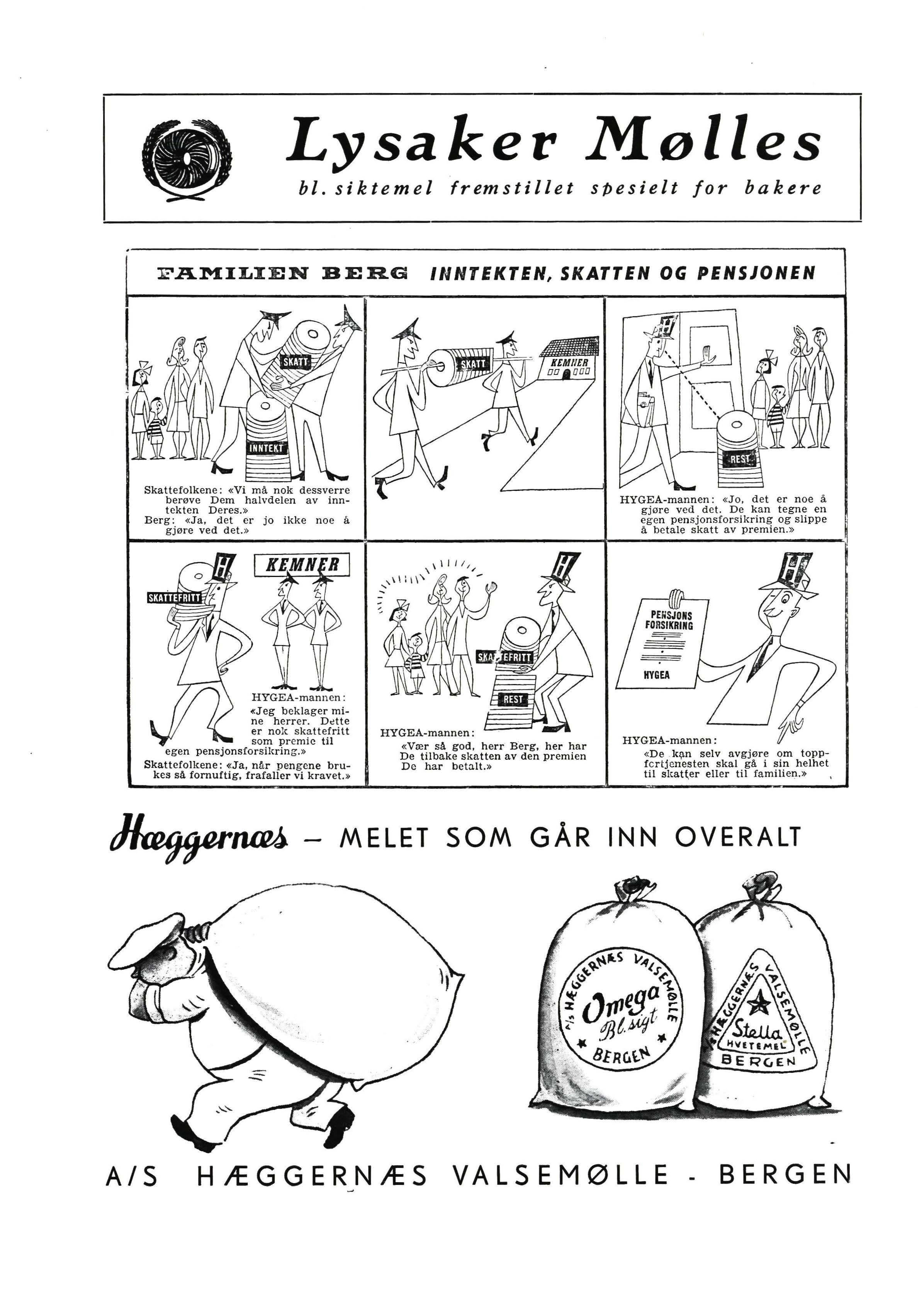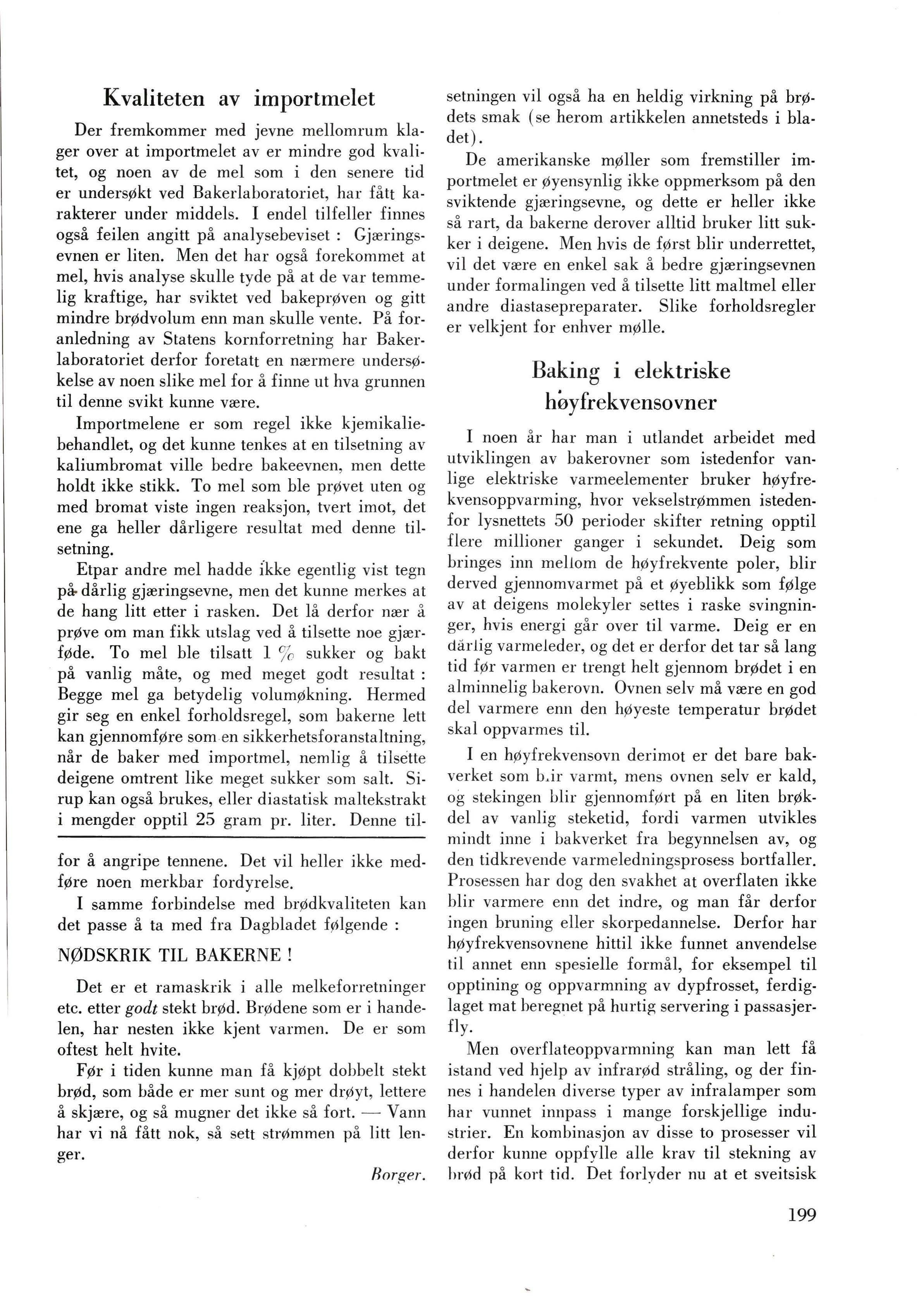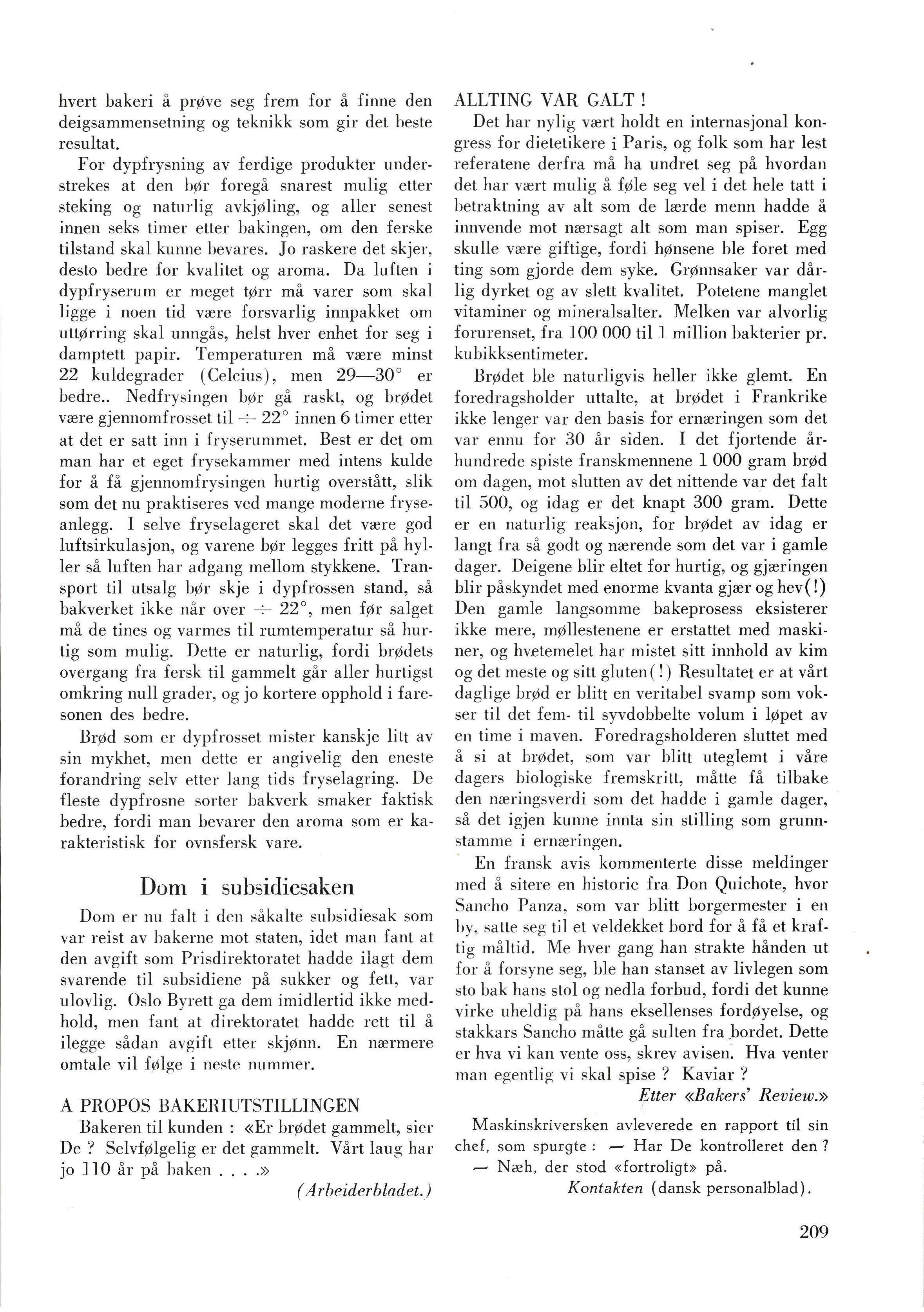 Når man har reist omkring i ferien og prøvet brødet i forskjellige byer, blir en slått av hvor stor forskjell det kan være på dets smak og aroma fra sted til sted. Kanskje går det slik, når man kommer hjem, at man tenker : Jeg hadde ikke visst at brødet her hjemme er så tØrt, så smakløst og kjedelig. Når så andre har gjort samme iakttagelse, må man uvilkårlig tenke på om ikke dette er en side ved brødfremstillingen som enkelte bakere legger for liten vekt på. Det skyldes ikke dette at hver landsdel har sine spesielle brødtyper, som har nyhetens interesse for en tilreisende, og det er heller ikke så at brødet har noen usmak - men brødet smaker i det hele tatt ikke. Attpå til får man høre om folk som reiser meget, at de kjøper med seg husholdningsbrød fra bestemte bakere i andre byer, fordi det er bedre. Det finnes eksperter som mener at mekaniseringen av· bakeribedriftene får ta sin del av skylden for det smakløse brød . Ingen regel uten unntakelse , men det er grunn til å tro at der hvor den faglige, håndverksmessige dyktighet får virke for fullt, har man også de beste muligheter for å lage et velsmakende brød Det er nemlig ikke det samme å bake brød som å produsere spiker. Det er ikke nok å lage et stort antall enheter på kortest mulig tid, selv om hver enkelt er nøyaktig lik alle de andre, og det teknisk sett ikke er noe å innvende. Brødet skal ha karakter, en «sjel», som gjør at man får lyst til å kjøpe mer av det istedenfor å lure på hvilken baker man nu skal gå til for å få noe som ikke er så interesseløst.