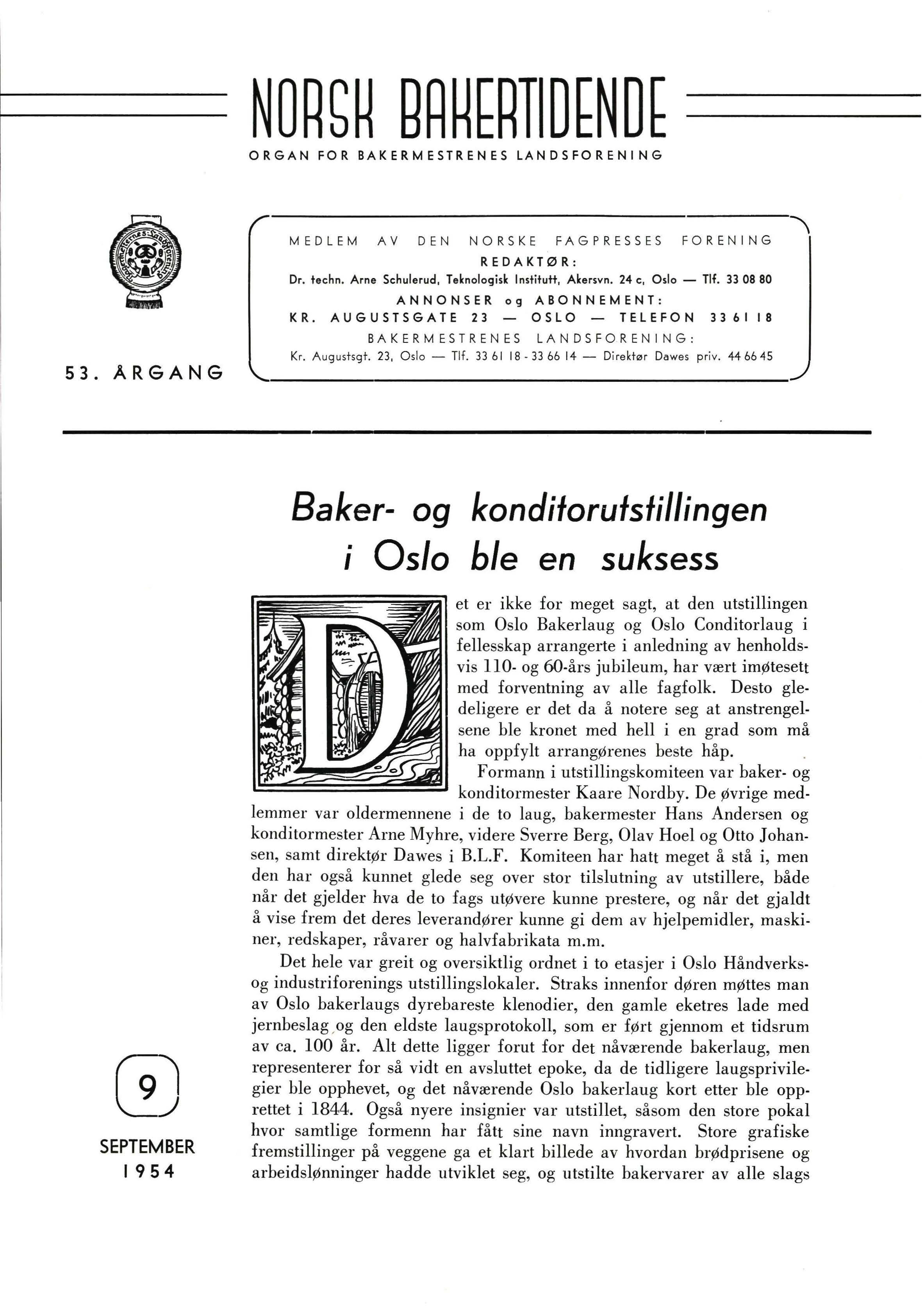 et er ikke for meget sagt, at den utstillingen som Oslo Bakerlaug og Oslo Conditorlaug i fellesskap arrangerte i anledning av henholdsvis llO- og 60-års jubileum, har vært imøtesett med forventning av alle fagfolk. Desto gledeligere er det da å notere seg at anstrengelsene ble kronet med hell i en grad som må ha oppfylt arrangørenes beste håp. Formann i utstillingskomiteen var baker- og konditormester Kaare Nordby. De øvrige medlemmer var oldermennene i de to laug, bakermester Hans Andersen og konditormester Arne Myhre, videre Sverre Berg, Olav Hoel og Otto Johansen, samt direktør Dawes i B.L.F. Komiteen har hatt meget å stå i, men den har også kunnet glede seg over stor tilslutning av utstillere, både når det gjelder hva de to fags utøvere kunne prestere, og når det gjaldt å vise frem det deres leverandører kunne gi dem av hjelpemidler, maskiner, redskaper, råvarer og halvfabrikata m.m.