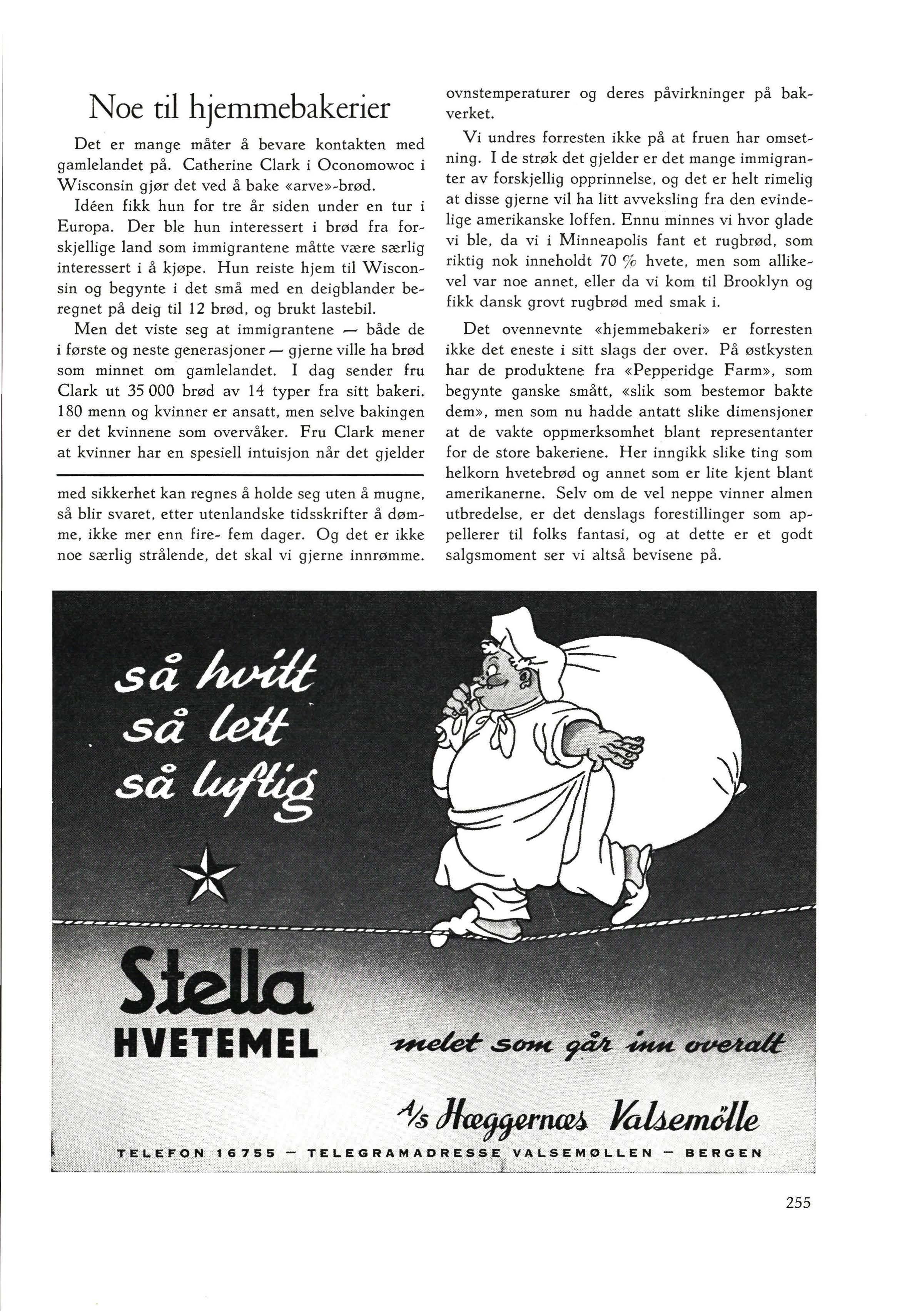 Vi undres forresten ikke på at fruen har omsetning. I de strøk det gjelder er det mange immigranter av forskjellig opprinnelse , og det er helt rimelig at disse gjerne vil ha litt avveksling fra den evindelige amerikanske loffen. Ennu minnes vi hvor glade vi ble, da vi i Minneapolis fant et rugbrød, som riktig nok inneholdt 70 % hvete , men som allikevel var noe annet , eller da vi kom til Brooklyn og fikk dansk grovt rugbrød med smak i.
