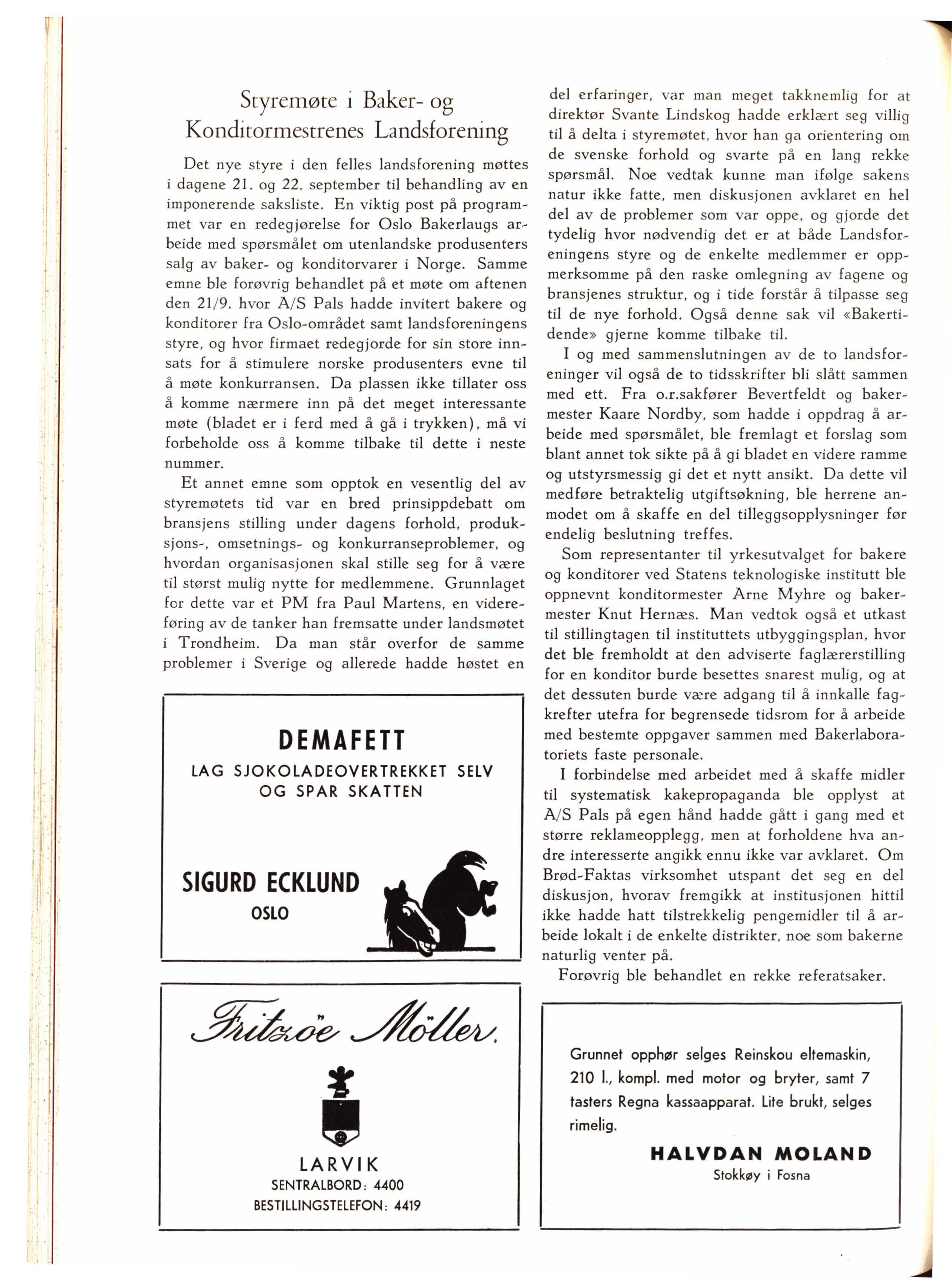 Det nye styre i den felles land sforening møttes i dagene 21 og 22. september til behandling av en imponerende saksliste En viktig post på programmet var en redegjørelse for Oslo Bakerlaugs arbeide med spørsmå let om utenlandske produsenters salg av baker- og konditorvarer i Norge. Samme emne ble forøvrig behandlet på et møte om aftenen den 21 / 9 . hvor A / S Pals hadde invitert bakere og konditorer fra Oslo-området samt landsforeningens styre , og hvor firmaet redegjorde for sin store innsats for å stimulere norske produsenters evne til å møte konkurransen. Da plassen ikke tillater oss å komme nærmere inn på det meget interessante møte (bladet er i ferd med å gå i trykken), må vi forbeholde oss å komme tilbake til dette i neste nummer.