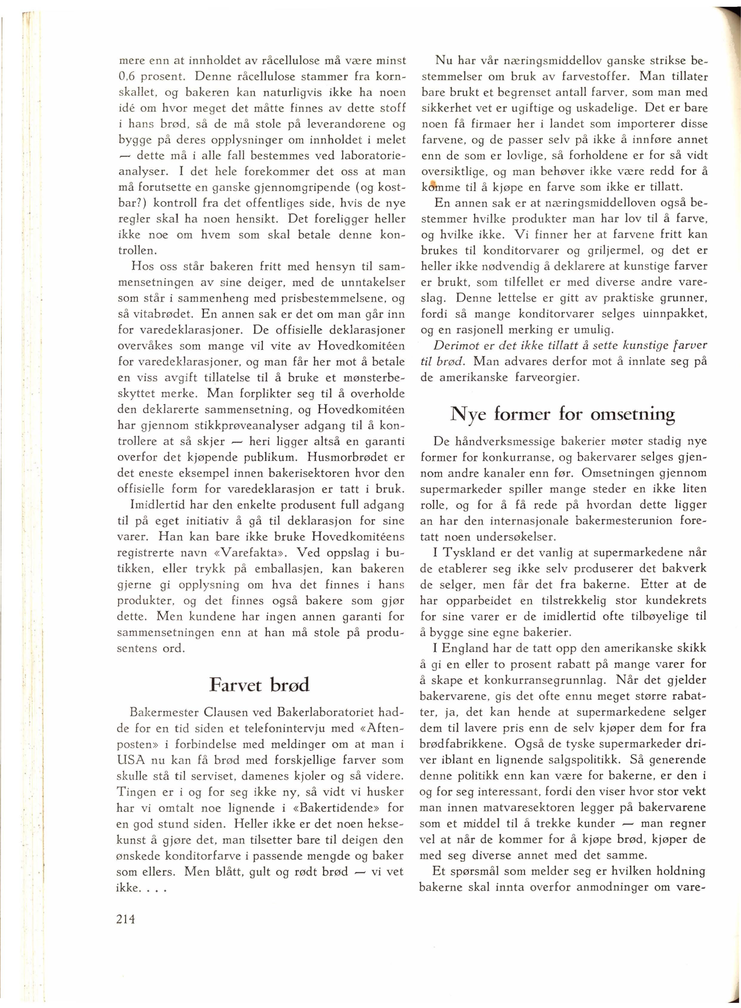 mere enn at innholdet av råcellulose må være min s t 0 ,6 prosent. Denne råcellulose stammer fra kornskallet , og bakeren kan naturligvis ikke ha noen id e om hvor meget det måtte finnes av dette stoff i h a n s brød , så de må stole på leverandørene og bygge på deres opplysninger om innholdet i melet - dette må i alle fall bestemmes ved labora torieanalyser. I det hele forekommer det oss at man må forutsette en ganske gjennomgripende ( og kostbar?) kontroll fra det offent l iges side, h vis de nye regler skal ha noen hensikt. Det foreligger heller ikke noe om hvem som ska l betale denne kontrollen.