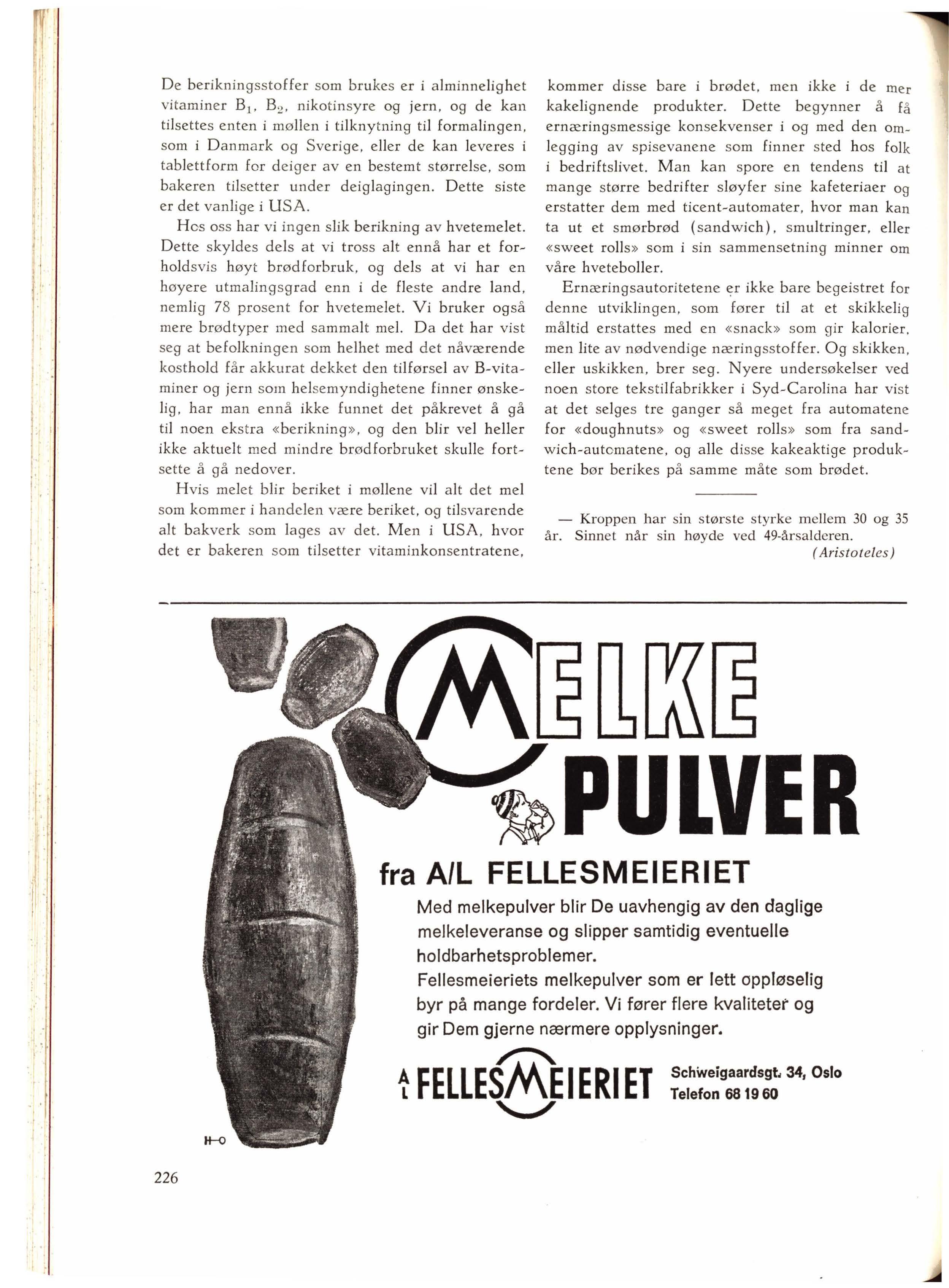 H os oss har vi ingen slik berikning av hvetemelet. Dette skyldes dels at vi tros s alt ennå har et forhold svis høyt brødforbruk, og dels at vi h ar en h øye re utmaling sgra d enn i de fleste andre land, nemlig 7 8 prosent for hvetemelet. Vi bruker også mere brødtyper med sammalt mel. Da det har vist seg at befolkningen som helhet med det nåværende kosthold f år akkurat dekket den tilførsel av B-vitaminer og jern som hel semy ndighetene finner ønskelig , har man ennå ikke funnet det påkrevet å gå til noen ekstra « berikning », og den blir vel he ll er ikke aktuelt med mindre brødforbruket skulle fortset te å gå nedover.