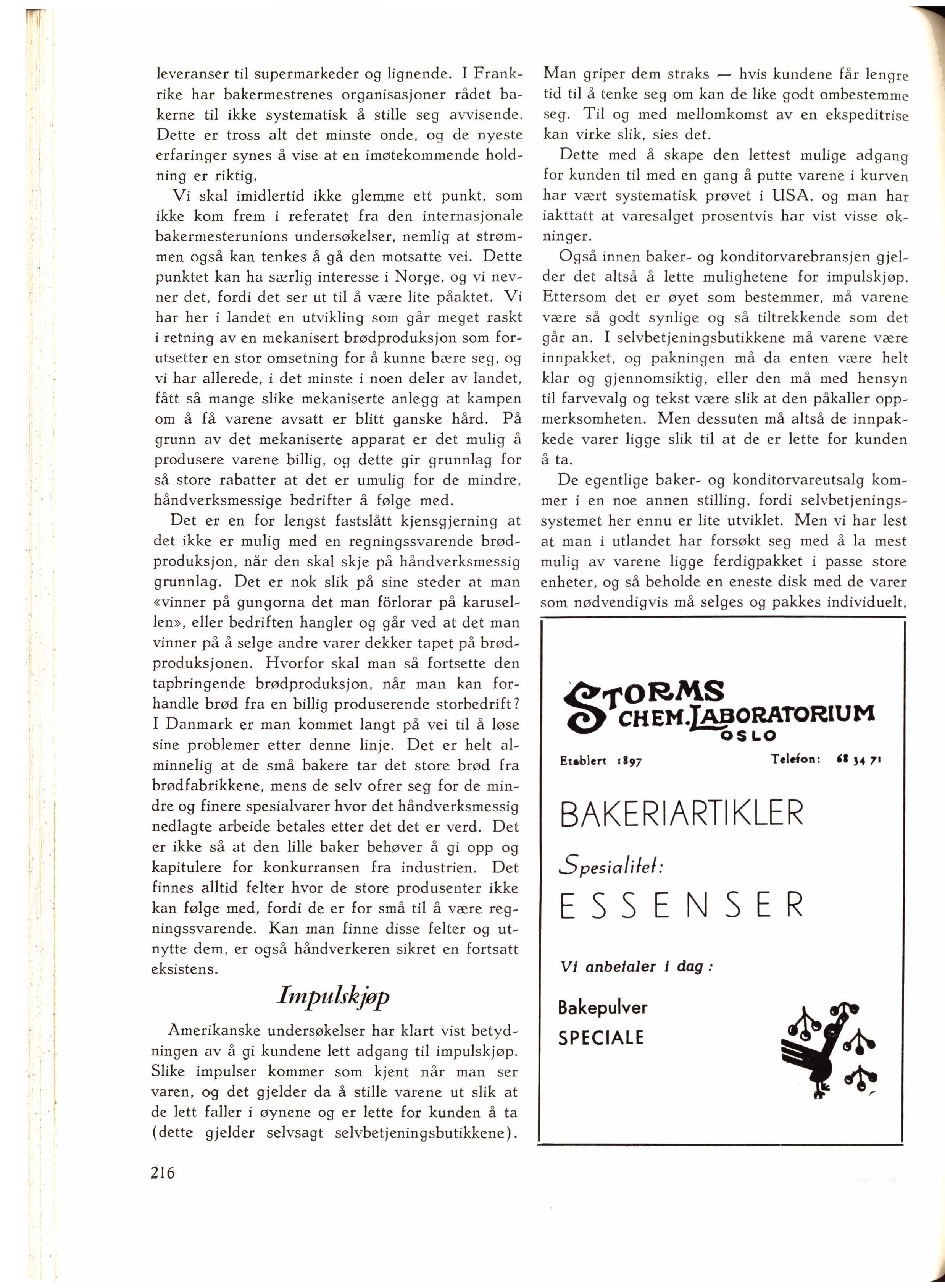 I England har de tatt opp den amerikanske skikk å gi en eller to prosent rabatt på mange varer for å skape et konkurransegrunnlag. Når det gjelder bakervarene , gis det ofte ennu meget større rabatter, ja , det kan h ende at supermarkedene selger dem til la vere pris enn de selv kjøper dem for fra brødfabrikkene. Ogs å de tyske supermarkeder driver iblant en lignende salgspo litikk. Så generende denne politikk enn kan være for bakerne, er den i og for seg interessant, fordi den viser h vor stor vekt man innen matvaresektoren legger på bakervarene som et mii ddel til å trekke kunder - man regner vel at når de kommer for å kjøpe brød , kjøper de med seg di verse annet med det samme.