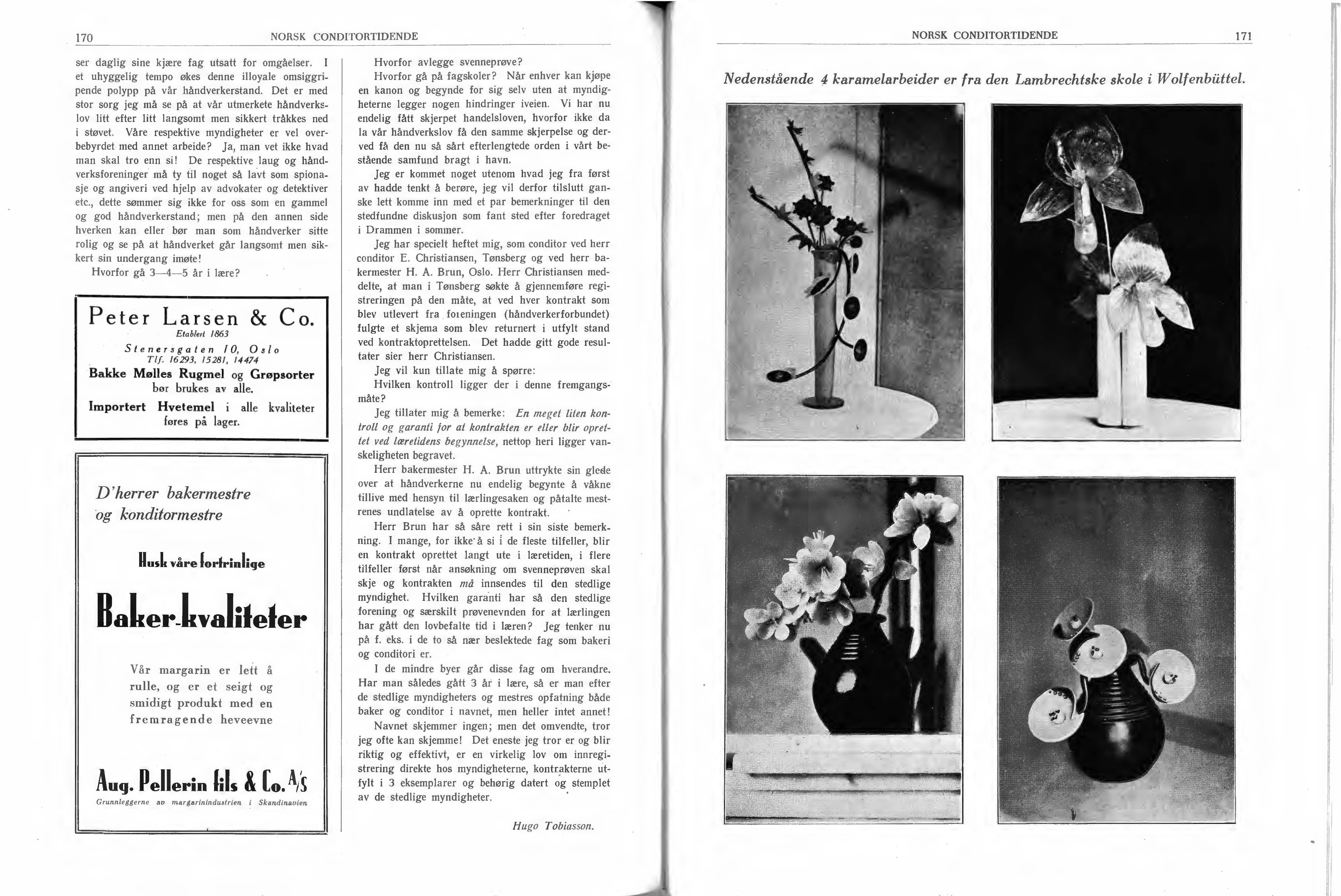 Vi har en liten overraskelse til Dem og kanskje et bidrag til «Bla'e». Ved samarbeide mellem conditormestrene her og Tekn. Aftenskolens direktør, herr Selrod har det lykkes oss å etablere en conditorklasse ved aftenskolen, efter forslag av vår Peder Romsøe. Vi hadde jo en ypperlig lærer i gamle Juell og denne var da også straks villig til atter å ofre sig for det søte fag. Han har nemlig for endel år tilbake lagt inn årene og sluttet forretningen. Conditorklassen har nu vært igang i over I ½ år og læreguttene er meget interessert og gjør store fremskritt på dekorområdet, som for det meste innøves. Der laves desforuten alleslags opsatser i sukker og chokolade og modelleres. Klassen hadde særutstilling på Håndverk- og Industriforeningens utstilling i disse dager og høster velfortjent beundring. Klassens utgifter blev det første år båret av mestrene i byen, men er for dette års vedkommende kommet på skolens budgett. Vi er stolte over dette tiltak og klassen er direktørens kjepphest. Nu skal der anskaffes ovn og flere hjel pemid ler for å gjøre arbeldet mer alsidig. D et er k un adgang for læregutter med lovlig ko ntrakt, me n senere ska l der oprettes ·avdeling for sve nner. F orute n p ra kt isk arbeide får læreguttene også nogen ti mer h-.er uke i faglig kalkulasjon.
